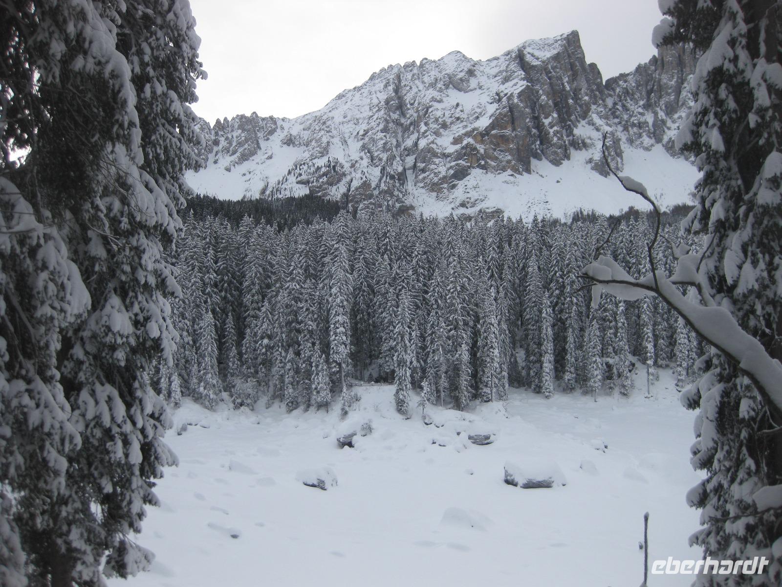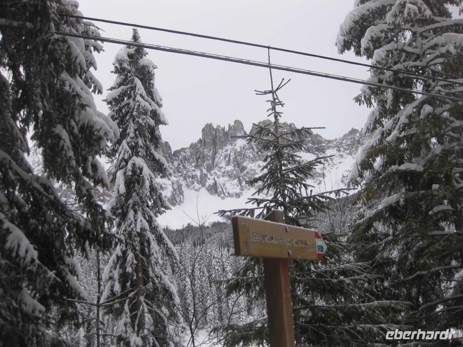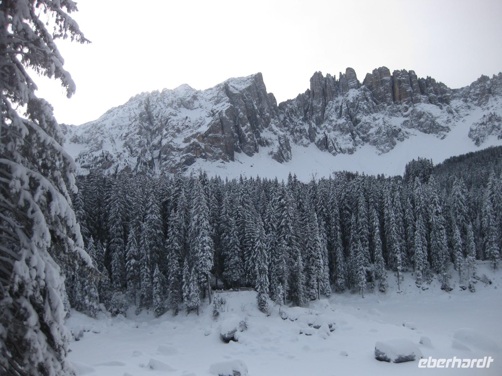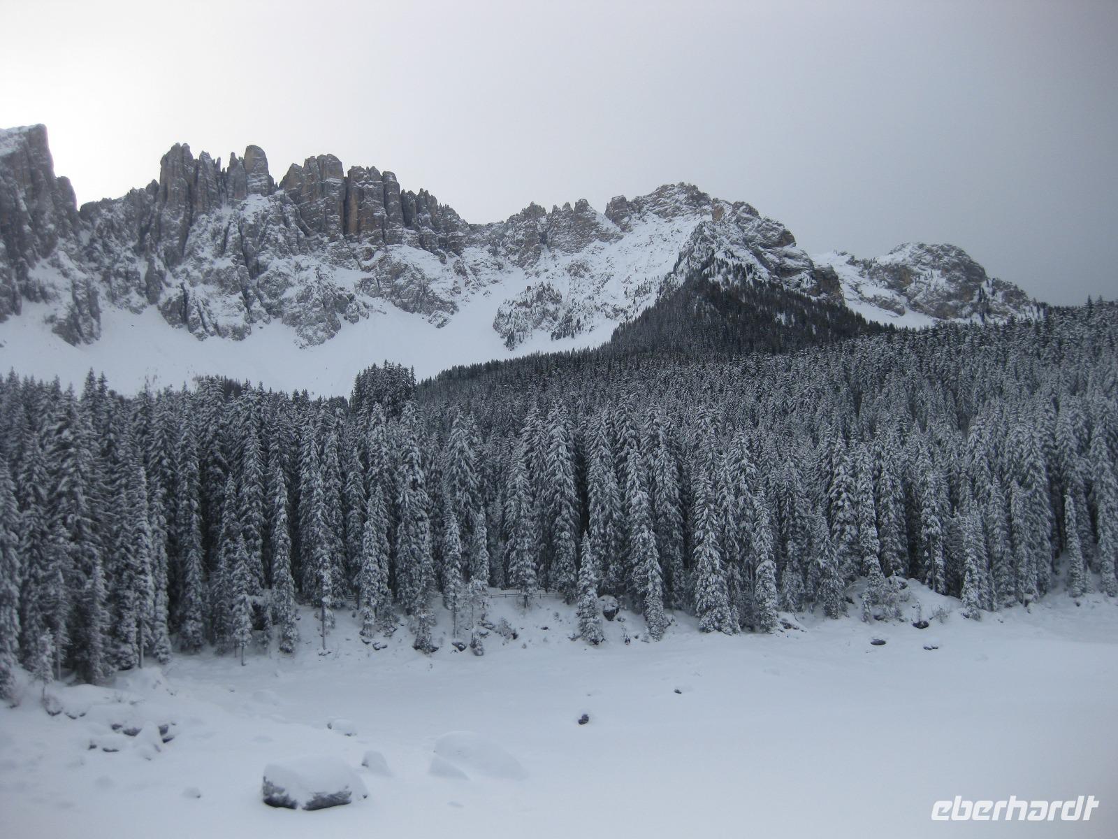 Wir fahren nach Sterzing, dort auf die Autobahn in Richtung Süden / Bozen. An der Abfahrt Bozen-Nord verlassen wir die Autobahn und fahren in das Eggental. Wir fahren jetzt auf der Großen Dolomitenstraße. Es wird winterlicher. Die Landschaft sieht märchenhaft aus - alles ist mit Schnee bedeckt. Wir fahren durch Welschnofen bis zum Karersee. Dort machen wir einen Stopp. Im Winter ist der See nicht so attraktiv, weil er zugefroren und mit Schnee bedeckt ist. Im Sommer spiegelt sich der Latemar-Bergstock im Wasser des Karersees. Wir können die Schönheit ahnen! Weiter geht die Fahrt über den Karerpass bis hinunter in's Fassatal und damit haben wir Südtirol verlassen und sind jetzt im Trentino. Unterwegs grüßen uns immer wieder die Felsen des Rosengarten. Siegfried erzählt uns die Sage vom Zwergenkönig Laurin, die sich um den Rosengarten rangt. Wir fahren durch das Fassatal mit den Orten Vigo di Fassa, Campitello di Fassa und schließlich Canazei, dem Hauptort des Fassatals. Hier verlassen wir die Große Dolomitenstraße und fahren hinauf zum Sellajoch. Wir haben Glück, die Straße über das Sellajoch ist offen. In 2.240 Meter Höhe auf dem Sellajoch machen wir einen kurzen Stopp. Hier oben spüren wir kurz das raue Klima der Berge. Wir befinden uns genau zwischen Langkofel und Sellastock. Weiter geht es hinunter ins Grödnertal und wir sind wieder in Südtirol. Im Grödner Tal sind die drei Orte Wolkenstein, St. Christina und St. Ulrich. In St. Christina besuchen wir die größte handgeschnitzte Krippe der Welt. Zum Abschluss unserer Dolomitenrundfahrt erwartet uns noch eine "Jause" im Unterfinser Hof bei Klausen. Wir werden mit hausgemachtem Tiroler Speck, Kaminwurzn und Käse, leckerem frischem Brot und natürlich auch Wein verwöhnt, alles sehr lecker. Am Nachmittag geht es auf der Autobahn wieder zurück in's Hotel. Wir bedanken uns bei Siegfried für den schönen Tag. Er hat uns auf der Rrundfahrt viel von seiner Heimat gezeigt und erzählt.