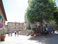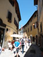 Kurven, Wein. Kurven, Oliven. Im Chianti sind wir, auf den Spuren des schwarzen Hahns. Parallele Linien der Weinberge, hingetüpfelt graugrüne Olivenbäume auf Hügeln neben Gehöften. Wie gut - kein Traktor weit und breit: wir können fahren. Ein falsches Verkehrs-Schild, dann Rangieren auf engstem Raum, wieder Kurven bis Castellina mit Burg und Etruskergrab.