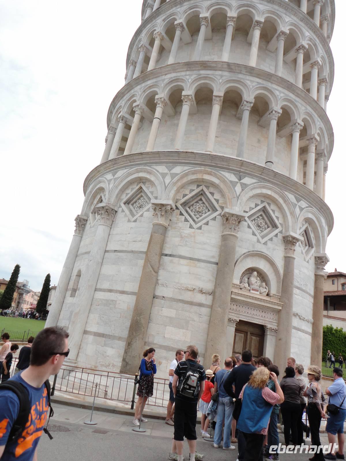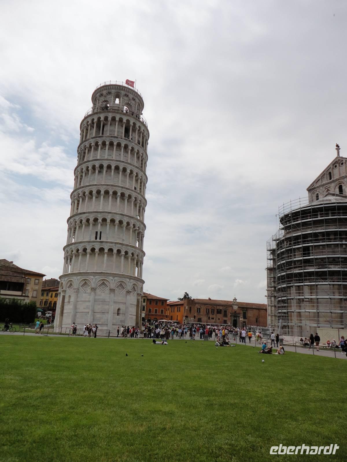 Was wir hier sehen auf grüner Wiese entlockt einen Ausruf: Baptisterium, Dom und Turm glänzen mamorn um die Wette. Alles auch von oben schön, viel Schauspielkunst bei den Aufnahmen, in denen der Turm mit touristischen Händen abgestützt wird.
