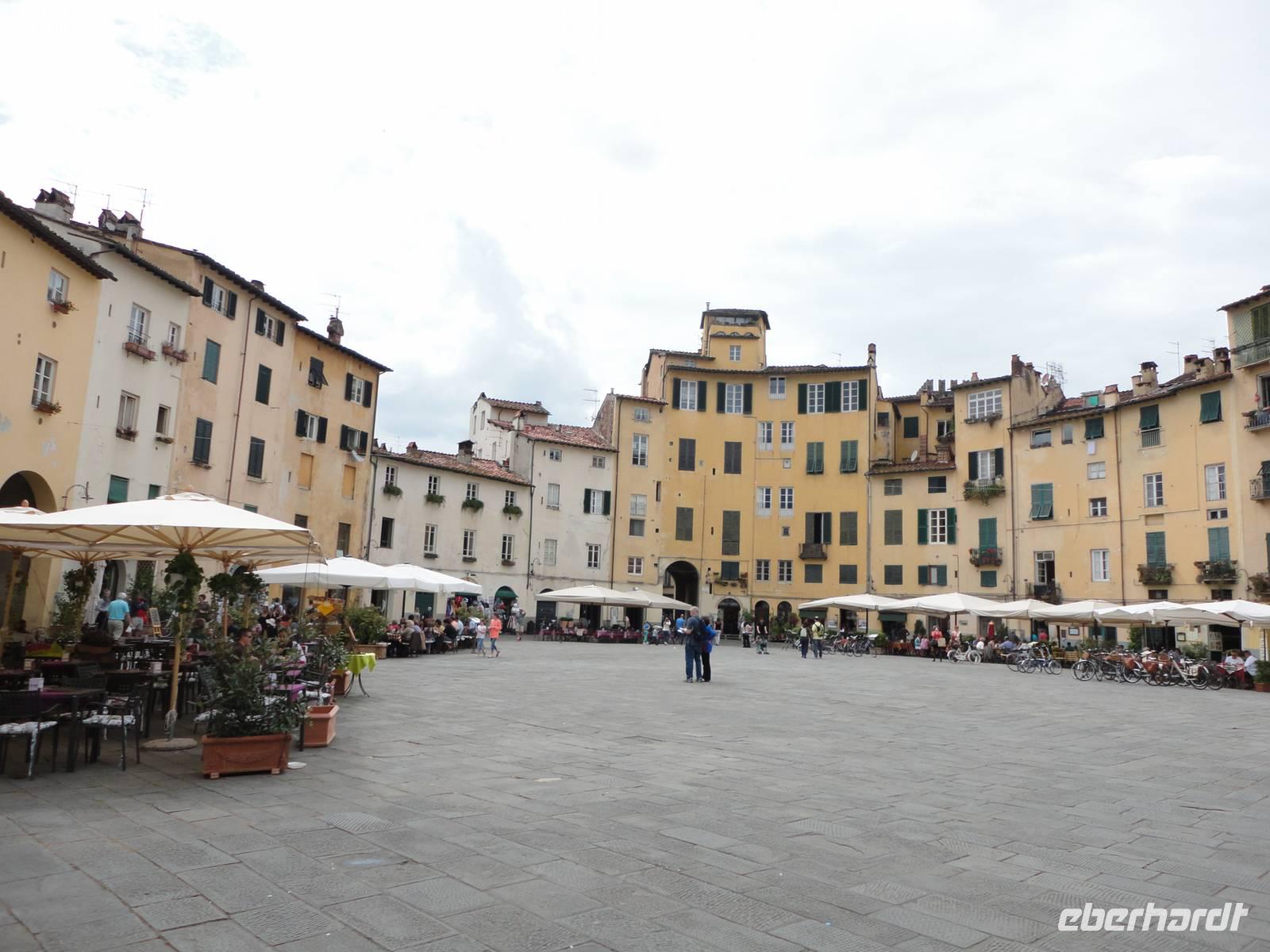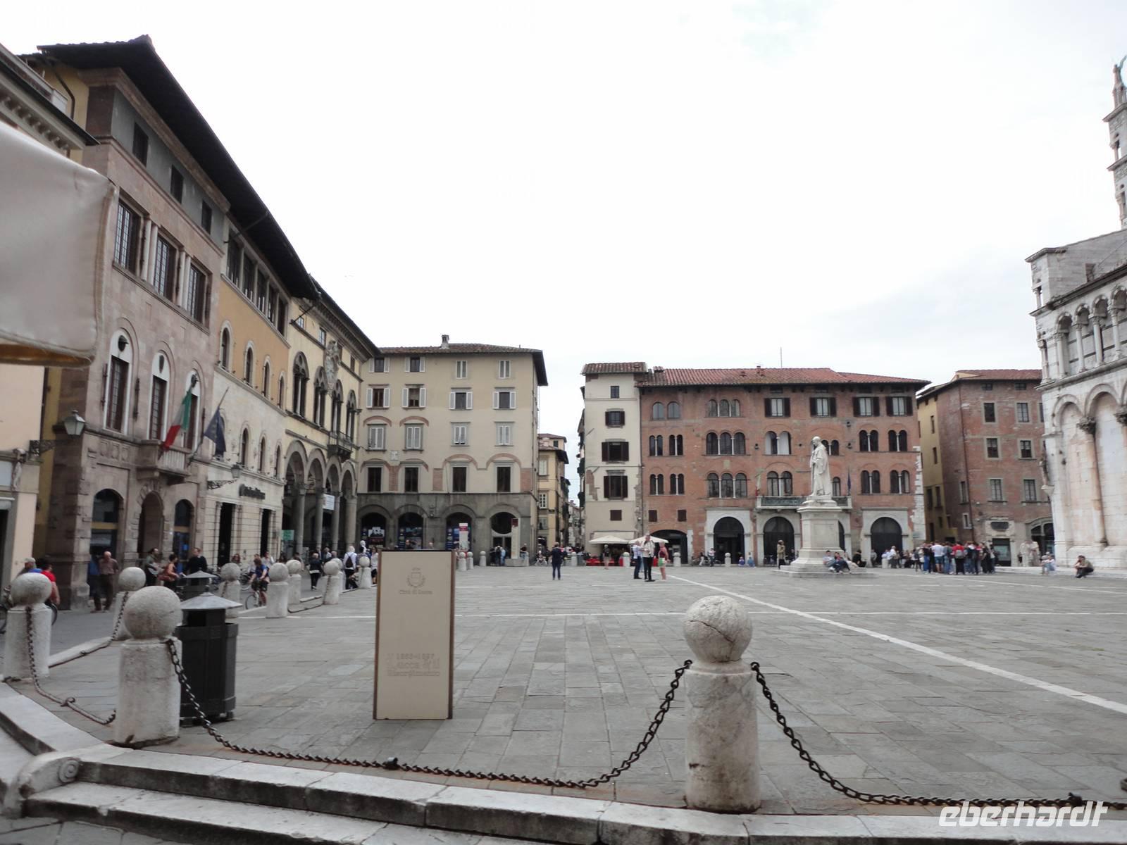 Mittagessen noch in der Stadt Galileis, den Kaffee jedoch schon in Lucca, Herr Puccini in Bronze schaut festgenagelt auf seinem Stuhl zu. Vis-a-vis seinem Geburtshaus sitzt er da schon sehr lange und betrachtet das Treiben in seiner Stadt der 99 Kirchen. Vor dem Bus Fussballfans aus Neapel - sie mögen Deutschland. Wolken ziehen auf.