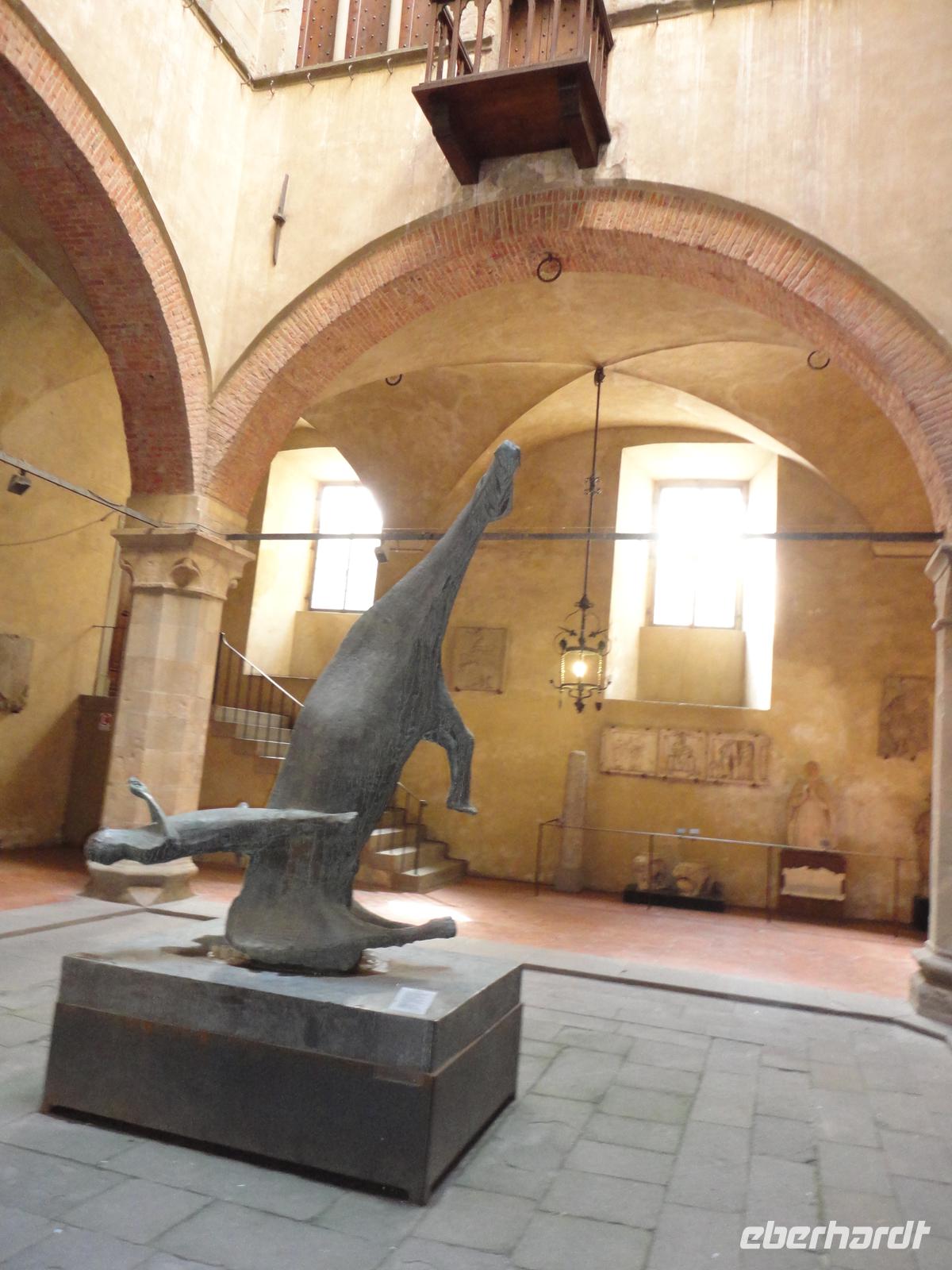 Welch gigantischer Bauplan endete hier an der Pest. Was wir sehen, ist erstaunlich genug: herrliche Pisanofassade, farbige Marmorgeschichten im Fussboden, laufend erzählen am Boden die Geschichten von damals. Gestreifte Säulen, Donatellos Johannes der Täufer grüßt neben der Piccolomini-Bibliothek.