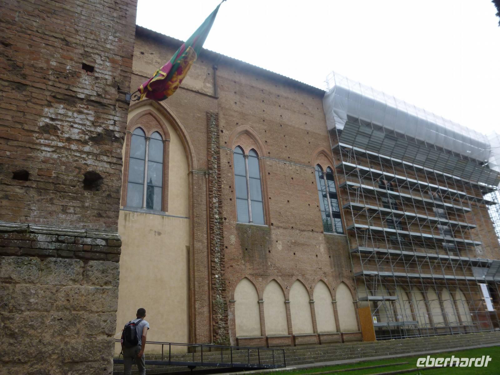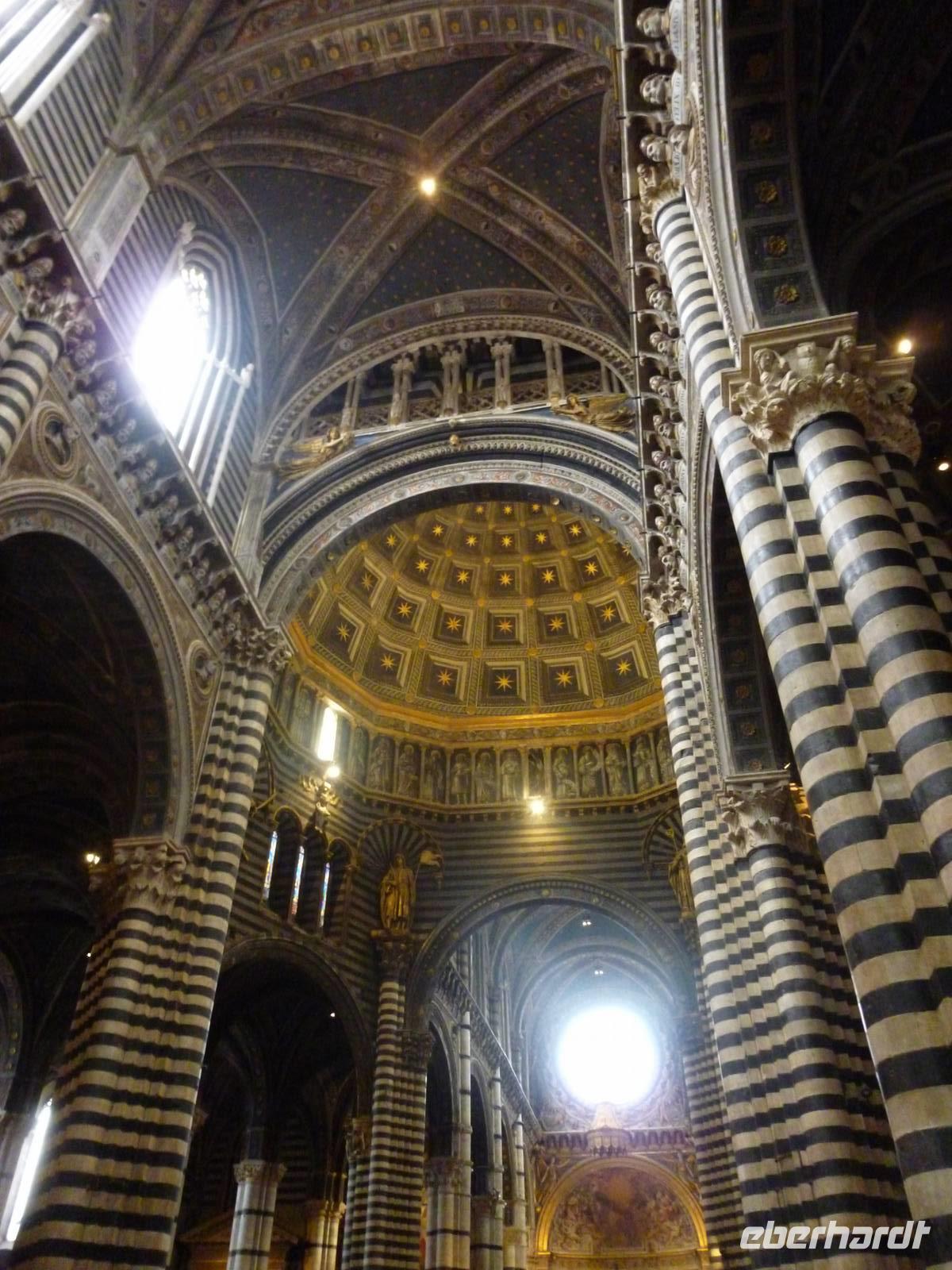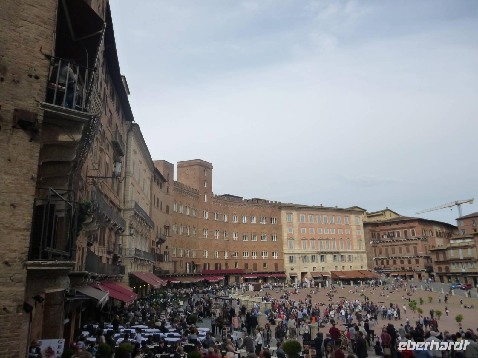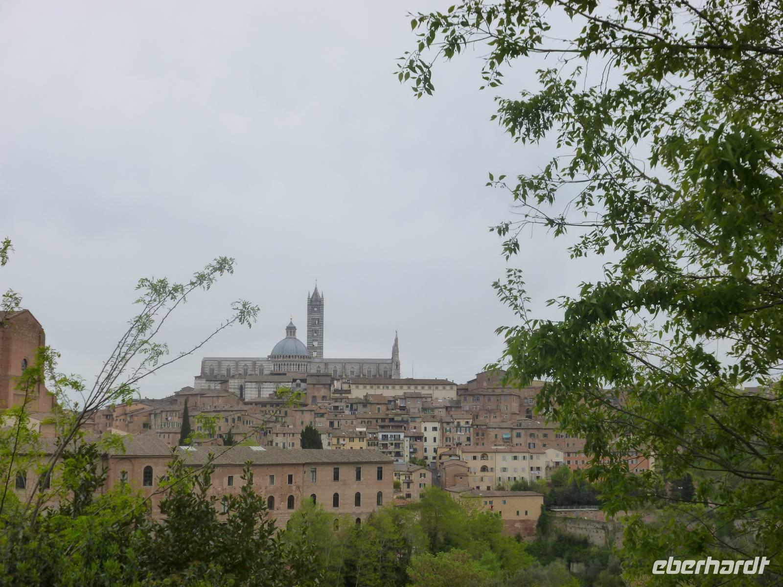 Cecilia holte uns am Checkpoint ab und führte uns durch die Altstadt zuerst in die Kirche der Hl.Katharina von Siena und weiter durch die Stadt und erklärte oder zeigte uns diverse Sehenswürdigkeiten (die Banner des Palio, Bankenviertel oder auch Leckereien wie Panforte, dem Kuchen aus Siena oder das Cafe Nannini) auf dem Weg bis zum Dom von Siena. Er ist die Hauptkirche der Stadt und aus charakteristischem schwarzem und weißem Marmor errichtet. Er gilt als eines der bedeutendsten Beispiele der gotischen Architektur in Italien. Diesen sahen wir uns auch gemeinsam innen an. Vor allem auch der Bodenbelag ist in seiner Art fast einmalig, er besteht aus kunstvoll gravierten Marmorplatten sowie Intarsienarbeiten in Farbe und Schwarzweiß. Danach gingen wir zum Piazza del Campo, wo der berühmte Palio stattfindet. Nach der Freizeit (alles hatte hier trotz Feiertag offen) trafen wir uns alle wieder und fuhren zurück zu unserem Hotel.