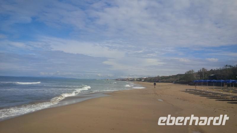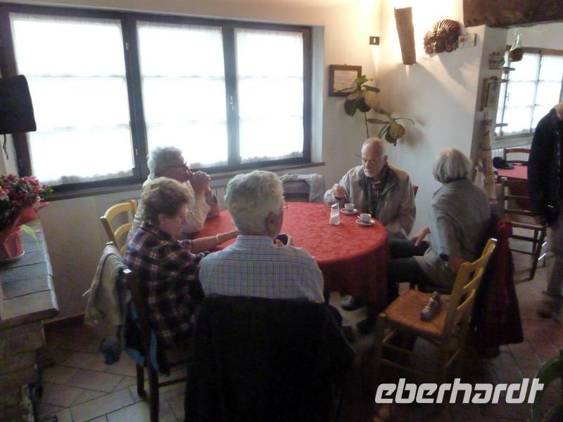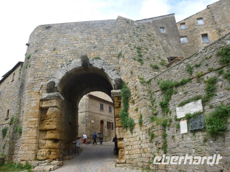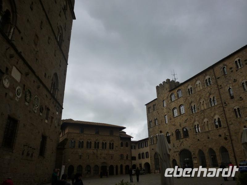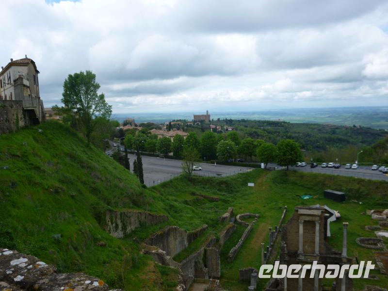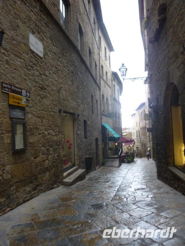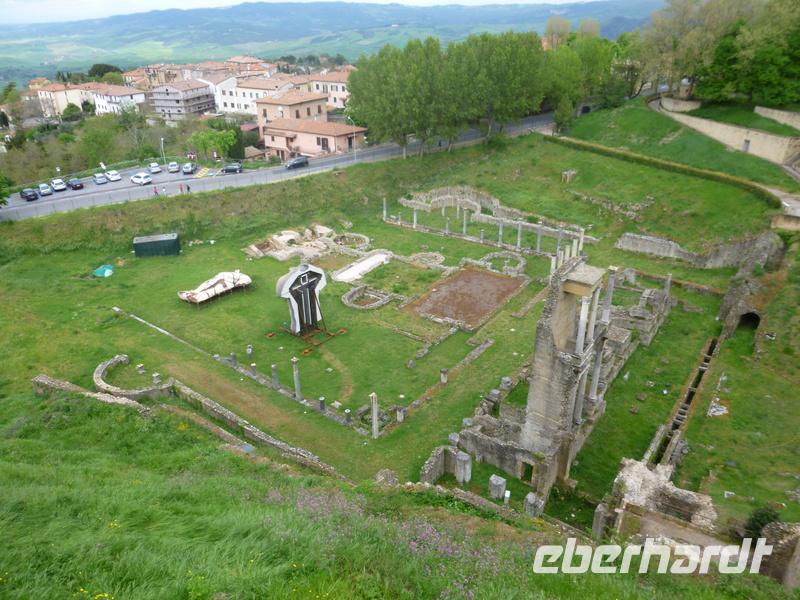 Vormittags konnten alle Gäste ausschlafen oder an den Strand gehen oder nach San Vincenzo spazieren. Heute war erst einmal freier Vormittag und jeder konnte die Seele auf seine Art baumeln lassen. Mittags fuhren wir dann ins etwa 60 km entfernte Volterra, das bei Ankunft herrlich in die Landschaft auf dem 550 m hohen Hügel über dem Cecina-Tal eingebettet liegt. Bekannt ist sie auch wegen den „Vampiren" aus Twilight und schon das große "O" von "Rossi" inmitten der Landschaften verrät die Alabasterverarbeitung. Aber die Stadt kennt man auch heute wegen ihrer als Staatsgefängnis benutzten Festung der Medici, die Fortezza Medicea. Volterra war eine der ältesten und größten von zwölf Bundesstädten Etruriens. Durch ihre Lage wurde sie zu einer starken Festung und im 12. und 13. Jahrhundert war sie eine Republik; im 14. Jahrhundert fiel sie an Florenz. Bettina führte uns durch die verschiedenen Epochen zum Piazza dei Priori, in den Dom Santa Maria Assunta aus dem frühen 12. Jahrhundert mit einer Kassettendecke, zum einzigen noch erhaltenen Tor der etruskischen Stadtmauer - Porta all'Arco, zum Teatro Romano, erbaut zur Zeit des Kaisers Augustus mit seinen Thermen-anlagen und durch die Stadt. Auch hier hatten wir noch Freizeit und fuhren dann erst zurück zum Hotel „I Lecci".