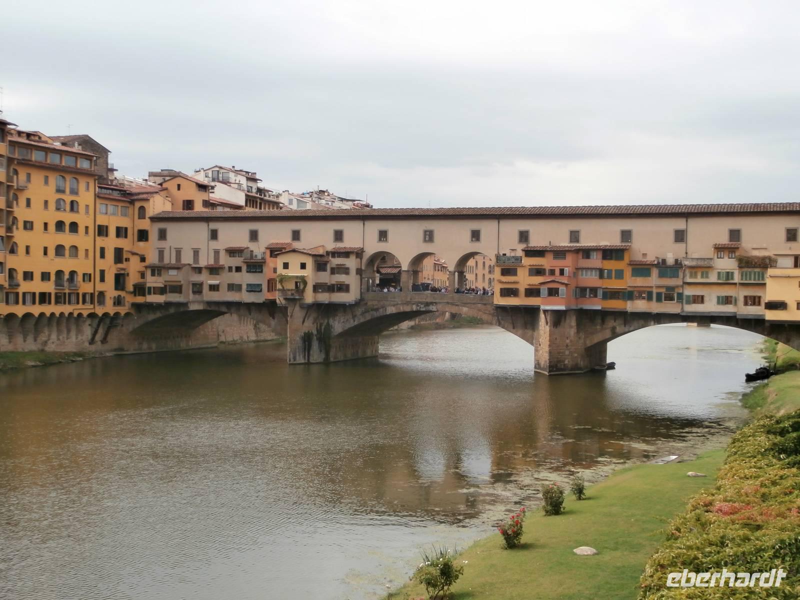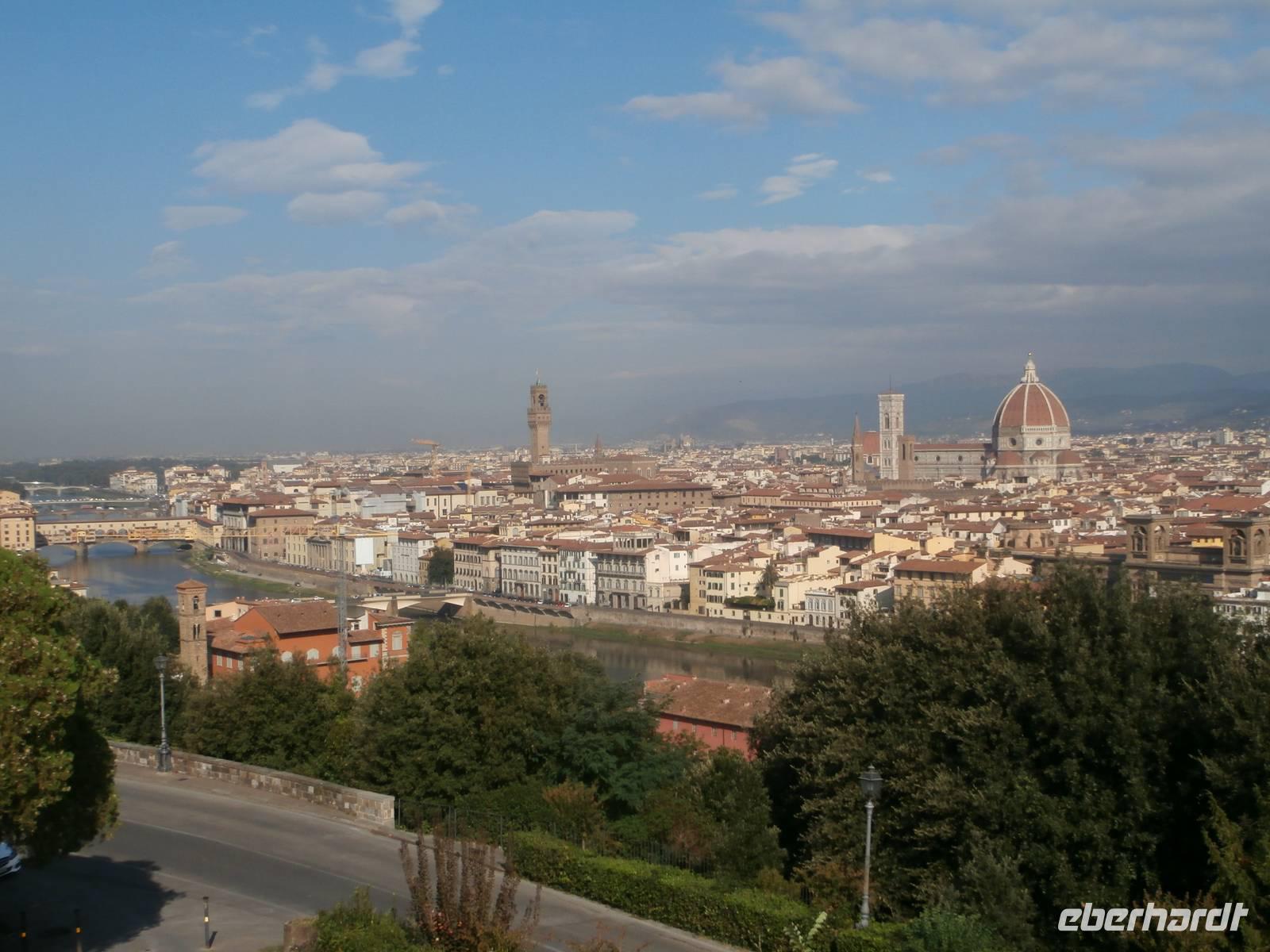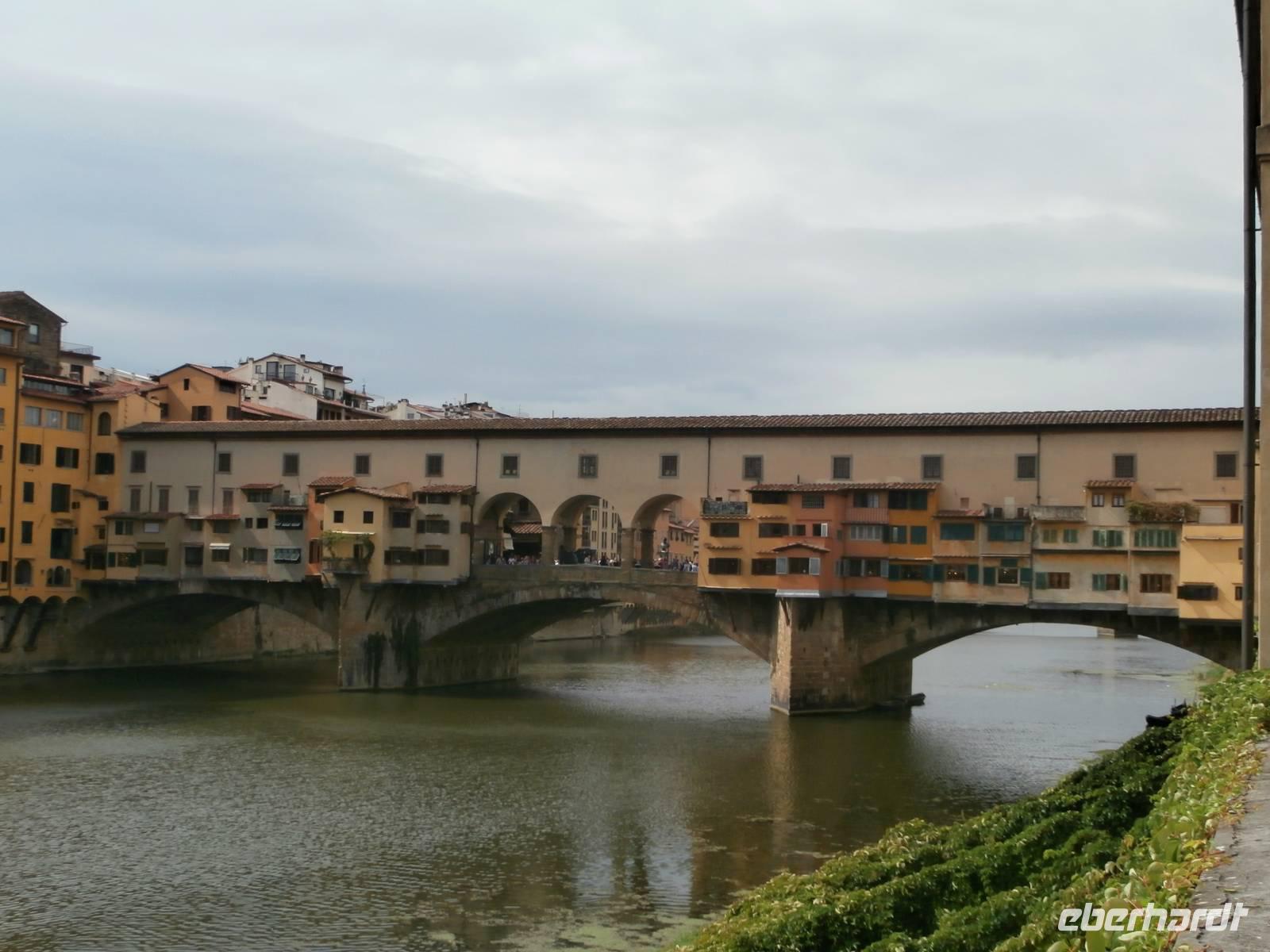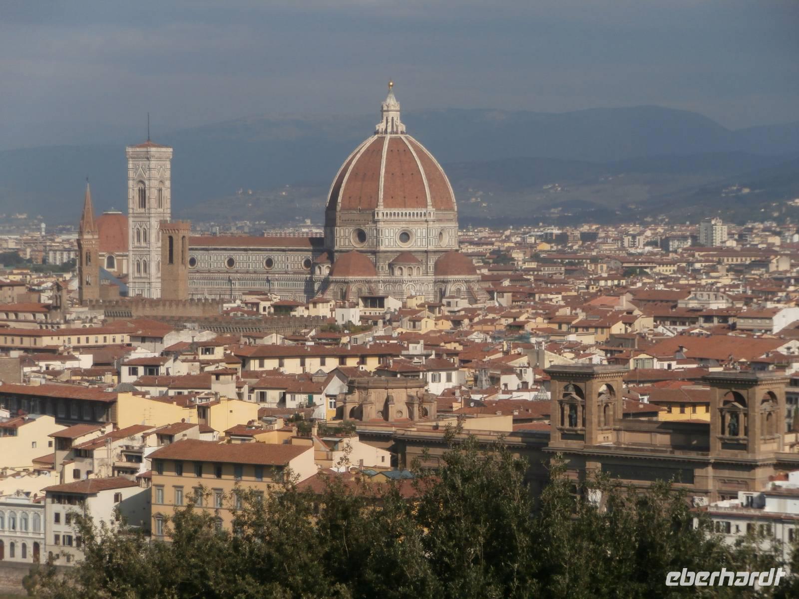 Vorbei an den Uffizien gelangen wir zum Fluss und genießen den Blick zur ältesten der Arno Brücken, der Ponte Vecchio. Ab dem 13. Jahrhundert richtet die Stadtregierung Läden und Wohnungen auf ihr ein auch für Fleischer, die ihre Abfälle im Fluss entsorgen und zu üblen Gerüchen im 16. Jahrhundert führen. Der Großherzog Ferdinand I. ordnet an, dass nur noch Goldschmiede auf der Brücke ansässig sein dürfen, diese Verordnung gilt bis heute. Zu Dom, Kampanile und Baptisterium gehen wir im Anschluss, sie sind überwältigende Elemente im historischen Florenz, Santa Maria del Fiore ist die Kathedrale, sie hat den Namen der Wappenblume von Florenz, der Lilie, zu verdanken. Die Fassade ist im 19. Jahrhundert vollendet wurden, sie schmückt eine dekorative Verkleidung aus weißem, grünem und rosa Marmor. Mit einem gemütlichen Spaziergang und einem italienischen Eis in der Hand verabschieden wir uns aus Florenz. Peter erwartet uns mit Kaffee und Getränken am Bus. Nach dem Abendessen lassen wir den schönen Tag in Montecatini Alto ausklingen. Wir fahren mit der Funicolare hinauf und genießen den zauberhaften Blick auf das beleuchtete Kurstädtchen Montecatini Terme. Bei einem Glas Wein, ausgegeben vom Reiseveranstalter Eberhardt Travel, sitzt die Gruppe auf dem Marktplatz beieinander.