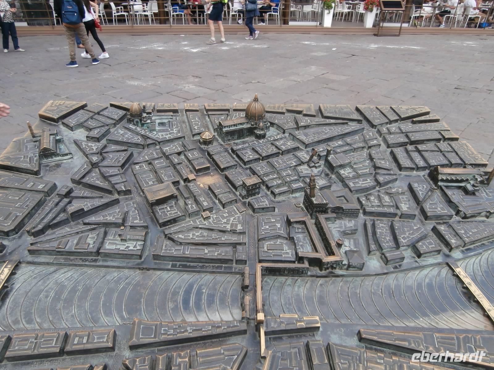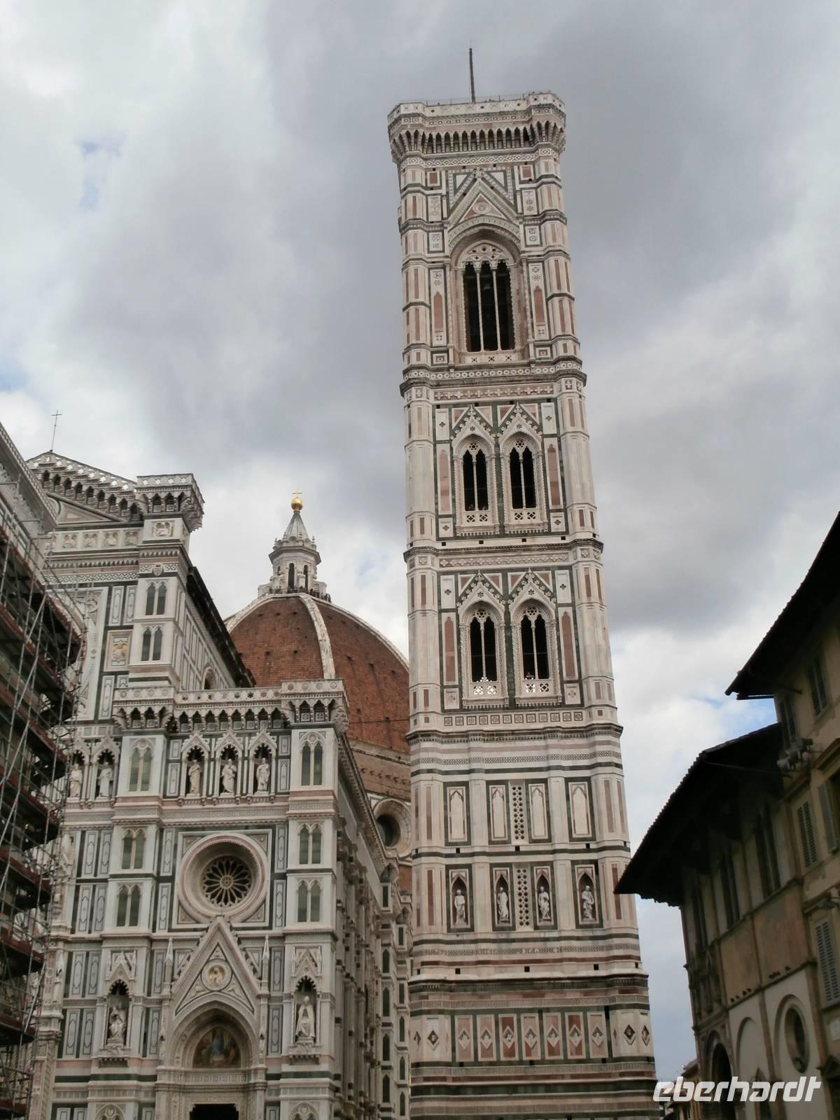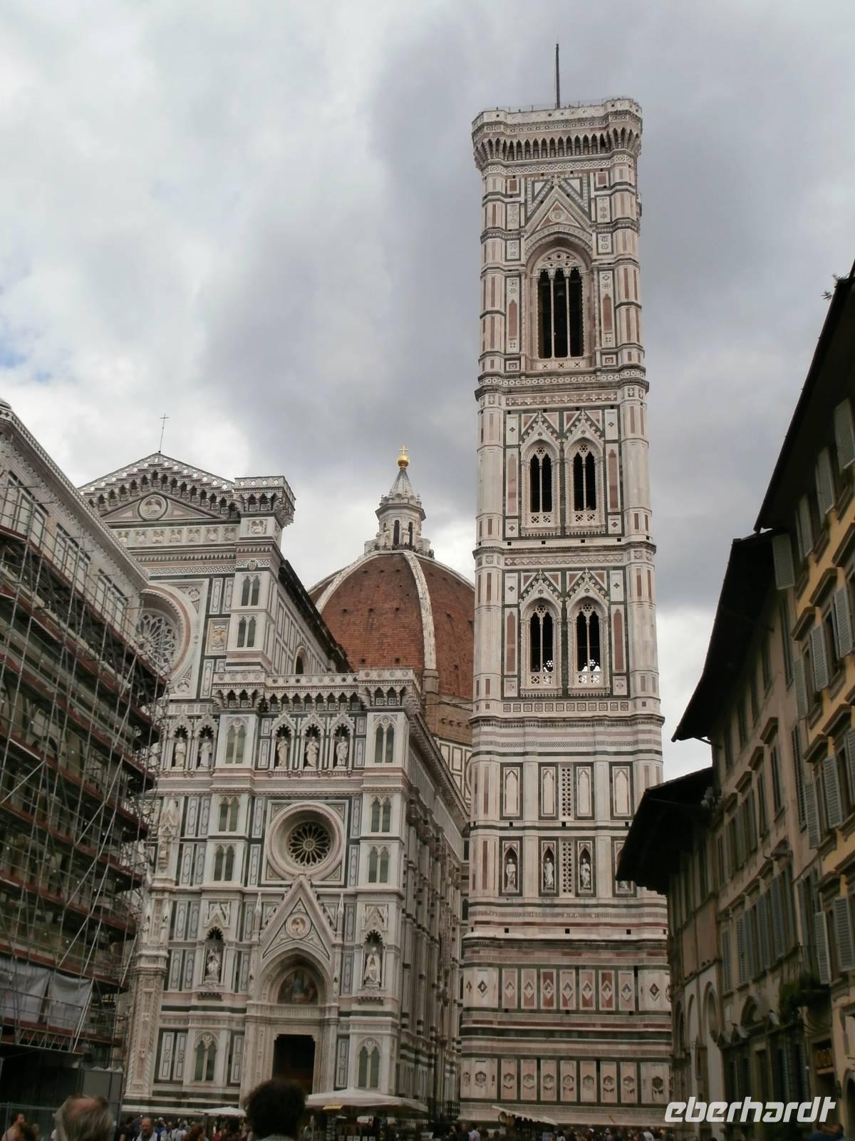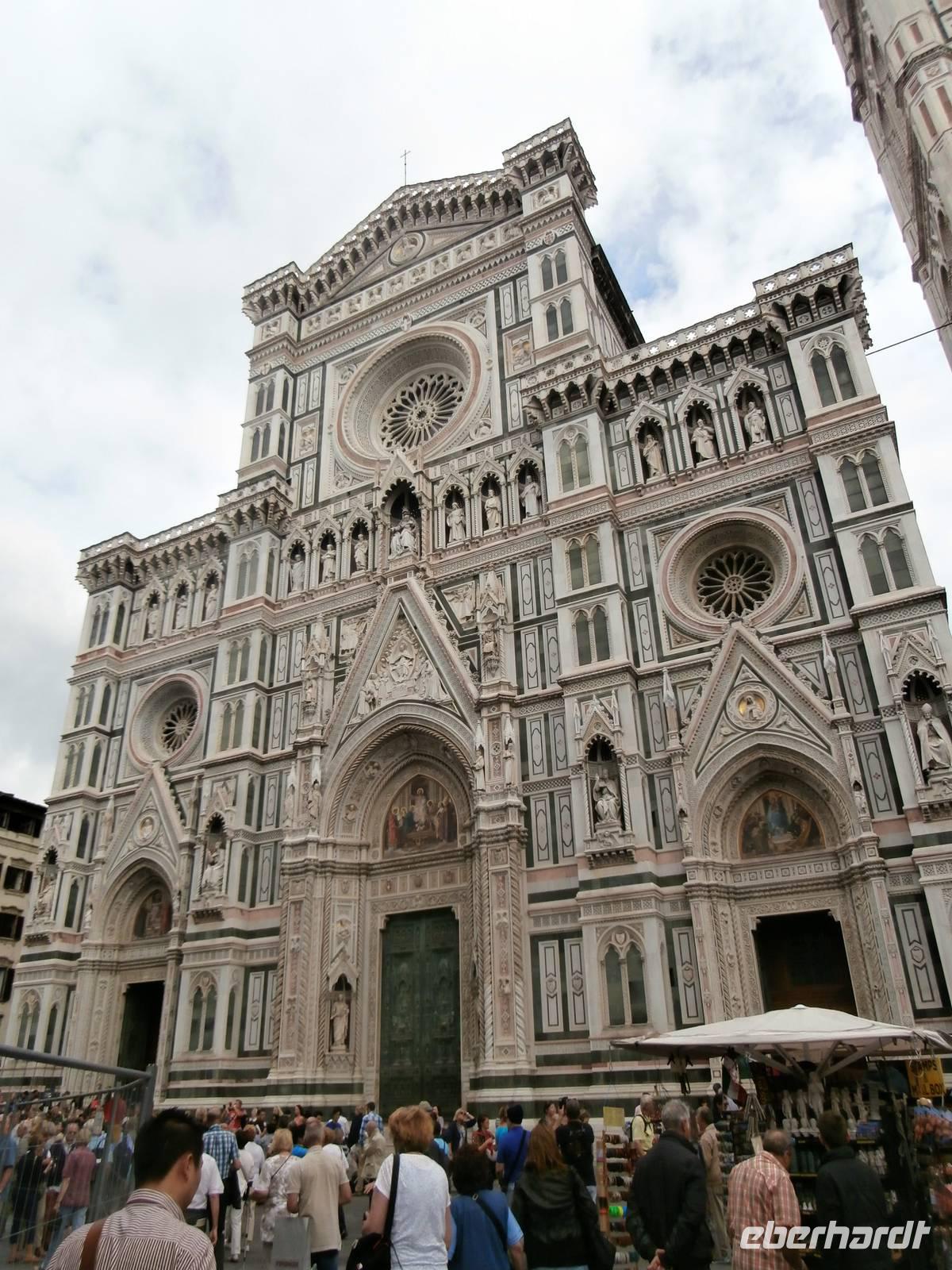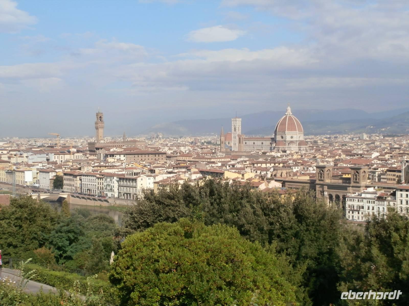 Vorbei an den Uffizien gelangen wir zum Fluss und genießen den Blick zur ältesten der Arno Brücken, der Ponte Vecchio. Ab dem 13. Jahrhundert richtet die Stadtregierung Läden und Wohnungen auf ihr ein auch für Fleischer, die ihre Abfälle im Fluss entsorgen und zu üblen Gerüchen im 16. Jahrhundert führen. Der Großherzog Ferdinand I. ordnet an, dass nur noch Goldschmiede auf der Brücke ansässig sein dürfen, diese Verordnung gilt bis heute. Zu Dom, Kampanile und Baptisterium gehen wir im Anschluss, sie sind überwältigende Elemente im historischen Florenz, Santa Maria del Fiore ist die Kathedrale, sie hat den Namen der Wappenblume von Florenz, der Lilie, zu verdanken. Die Fassade ist im 19. Jahrhundert vollendet wurden, sie schmückt eine dekorative Verkleidung aus weißem, grünem und rosa Marmor. Mit einem gemütlichen Spaziergang und einem italienischen Eis in der Hand verabschieden wir uns aus Florenz. Peter erwartet uns mit Kaffee und Getränken am Bus. Nach dem Abendessen lassen wir den schönen Tag in Montecatini Alto ausklingen. Wir fahren mit der Funicolare hinauf und genießen den zauberhaften Blick auf das beleuchtete Kurstädtchen Montecatini Terme. Bei einem Glas Wein, ausgegeben vom Reiseveranstalter Eberhardt Travel, sitzt die Gruppe auf dem Marktplatz beieinander.
