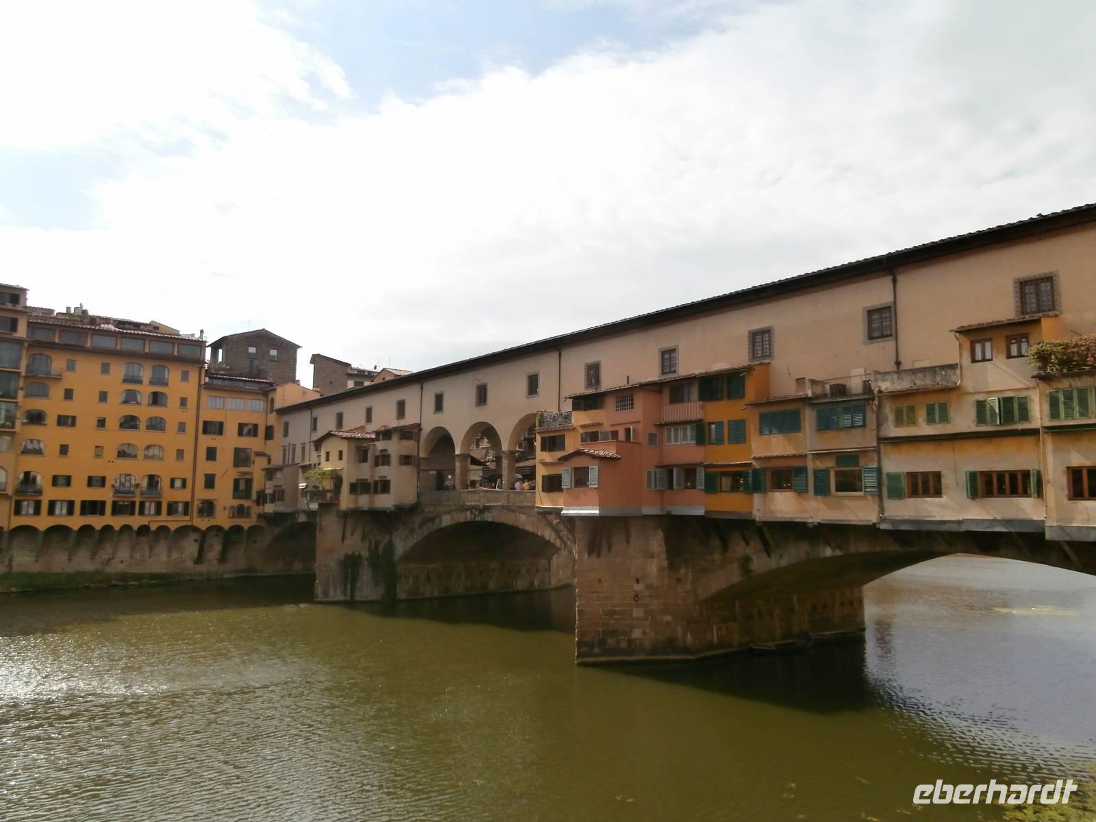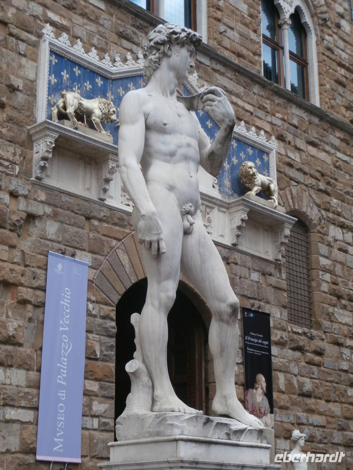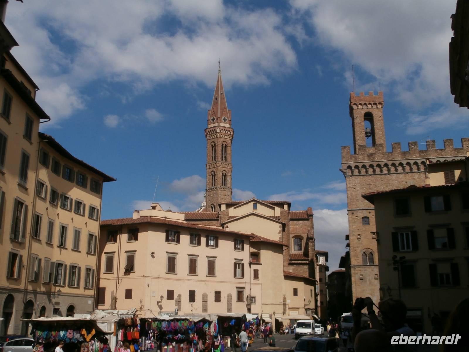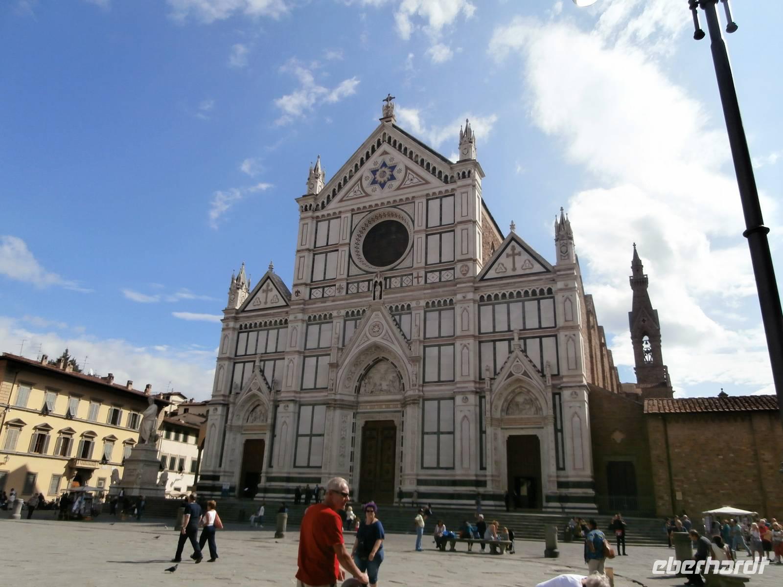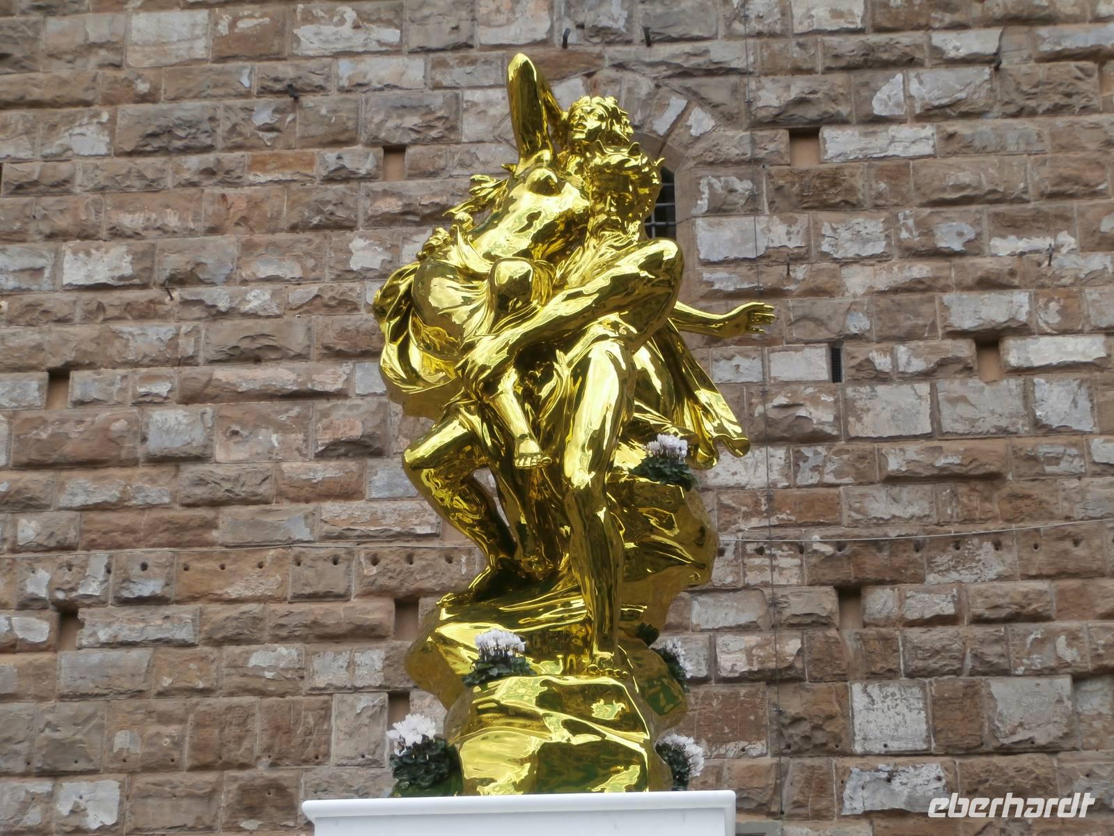 Schönes Wetter mit angenehmen Temperaturen erwartet uns in Florenz. Matthias Feldmann unser örtlicher Reiseleiter in Florenz erwartet uns am Zecca Turm direkt am Arno, dem Fluss, der Florenz durchfließt. Als erstes besichtigen wir Santa Croce, die Franziskanerkirche hat man 1294 umgebaut, sie ist die Begräbnisstätte der Berühmten. Wir sehen Grabmale von Michelangelo, Rossini und Galileo Galilei. Weiter geht es auf unserem Rundgang der Piazza della Signoria entgegen, ein beeindruckender Platz, er wird vom wuchtigen Turm des Palazzo Vecchio beherrscht. Den Neptun-Brunnen, das Reiterdenkmal des Großherzogs Cosimo I. und die Kopie des berühmten „David" vom Michelangelo können wir hier betrachten und fotografieren. Auch eine neue Statue in Gelb, die heute eingeweiht wird, können wir betrachten, es ist schon etwas gewöhnungsbedürftig, dieses neue Werk.