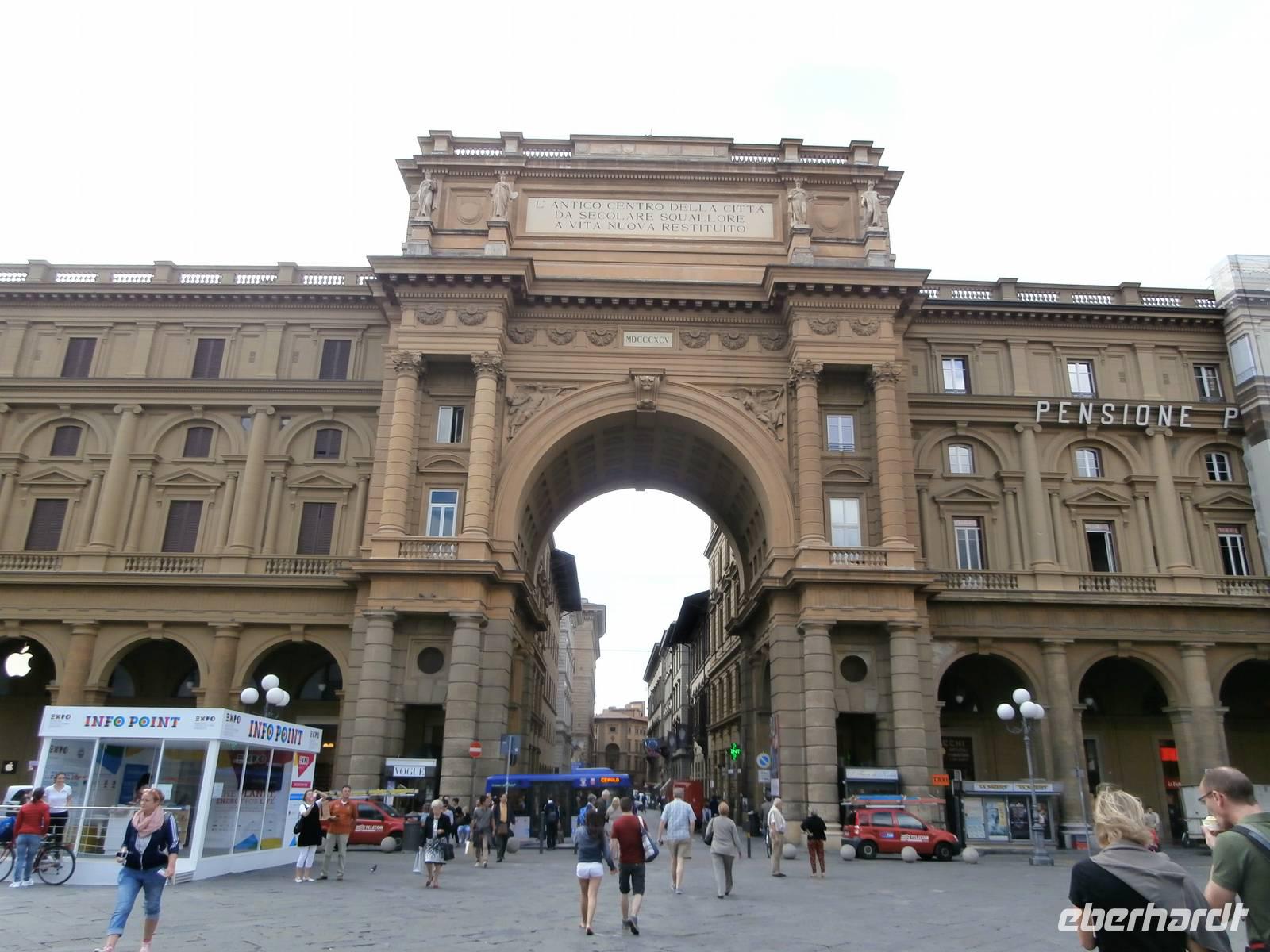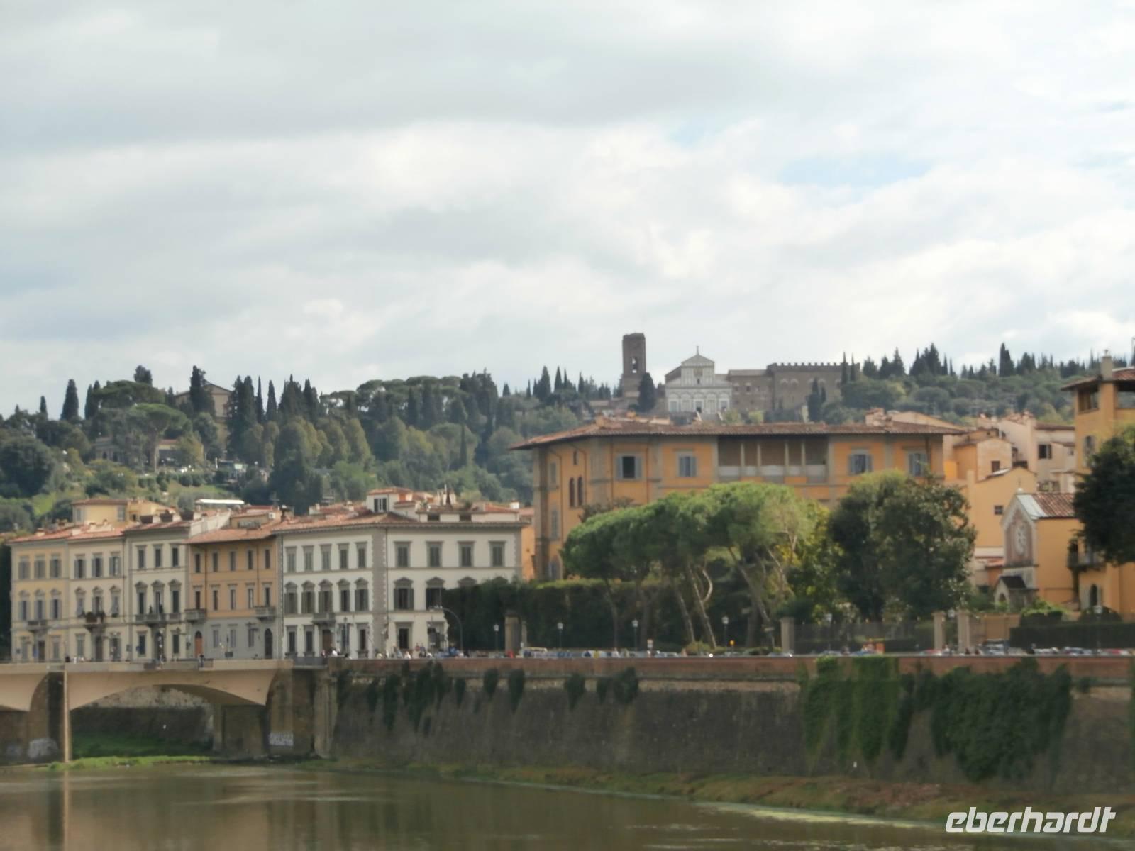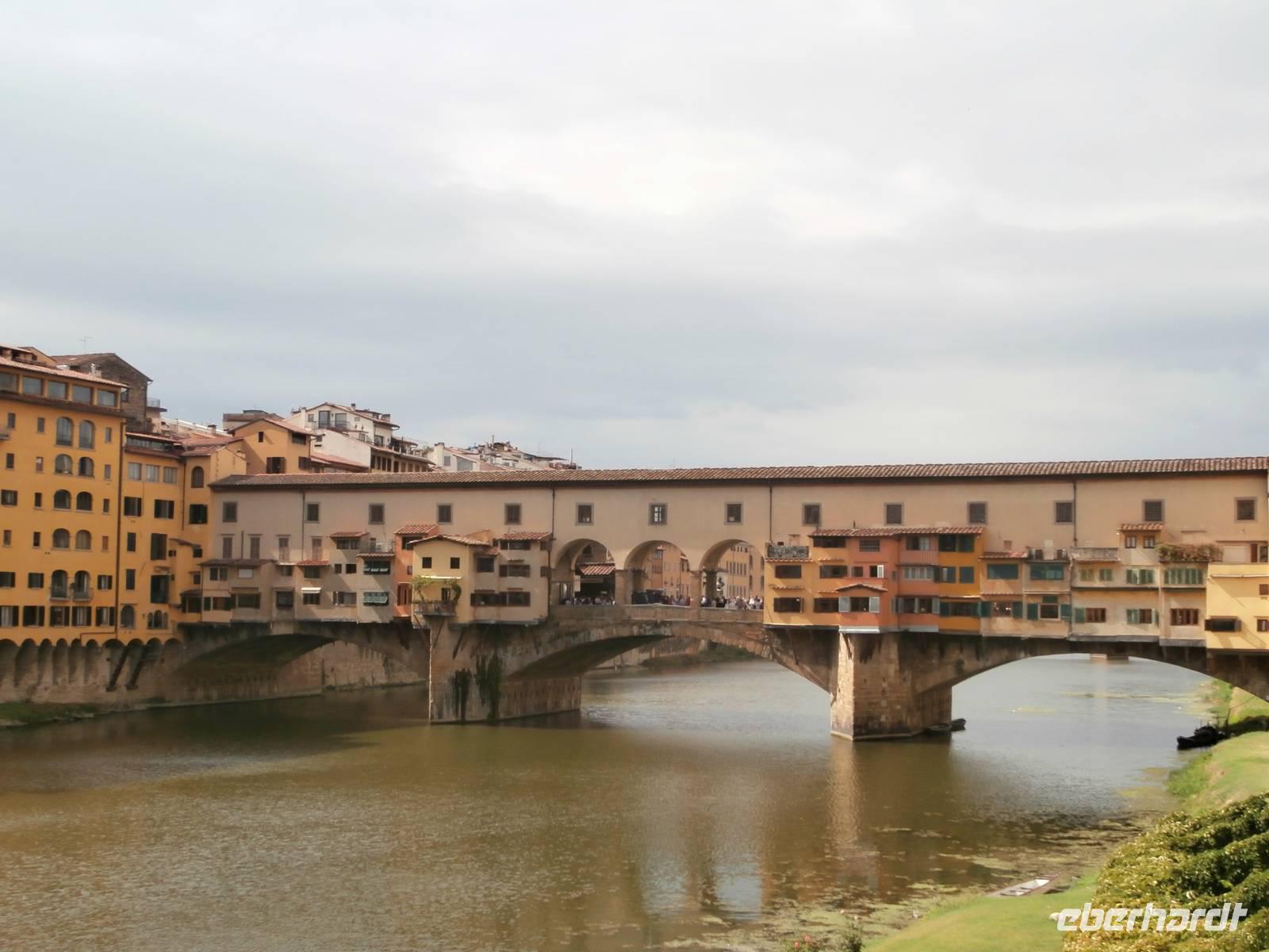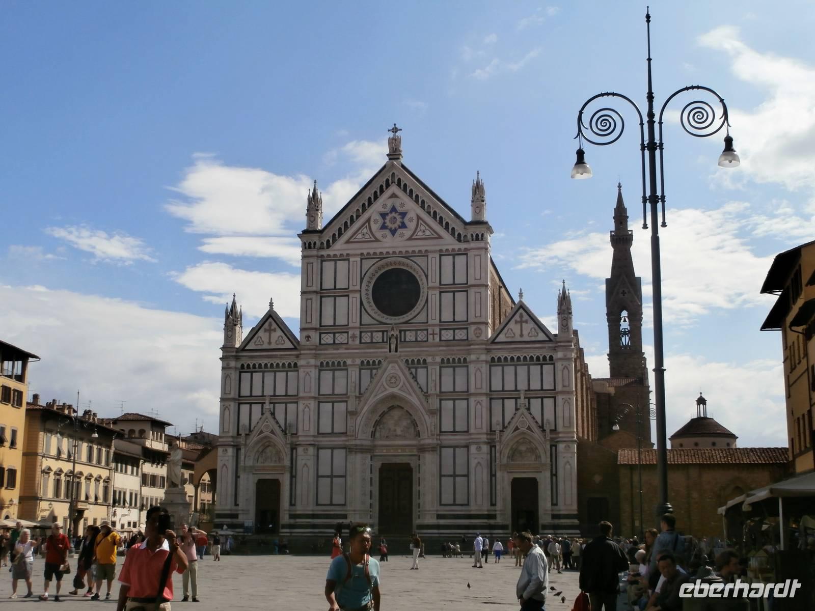 Schönes Wetter mit angenehmen Temperaturen erwartet uns in Florenz. Matthias Feldmann unser örtlicher Reiseleiter in Florenz erwartet uns am Zecca Turm direkt am Arno, dem Fluss, der Florenz durchfließt. Als erstes besichtigen wir Santa Croce, die Franziskanerkirche hat man 1294 umgebaut, sie ist die Begräbnisstätte der Berühmten. Wir sehen Grabmale von Michelangelo, Rossini und Galileo Galilei. Weiter geht es auf unserem Rundgang der Piazza della Signoria entgegen, ein beeindruckender Platz, er wird vom wuchtigen Turm des Palazzo Vecchio beherrscht. Den Neptun-Brunnen, das Reiterdenkmal des Großherzogs Cosimo I. und die Kopie des berühmten „David" vom Michelangelo können wir hier betrachten und fotografieren. Auch eine neue Statue in Gelb, die heute eingeweiht wird, können wir betrachten, es ist schon etwas gewöhnungsbedürftig, dieses neue Werk.