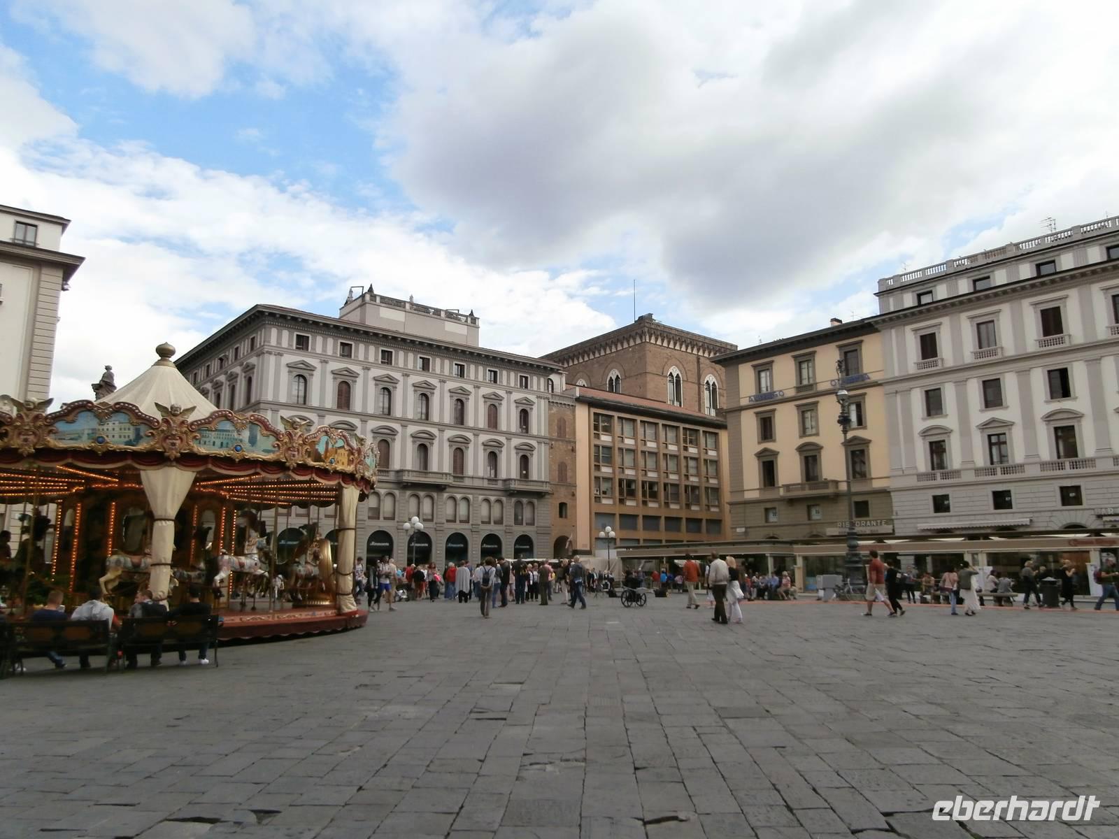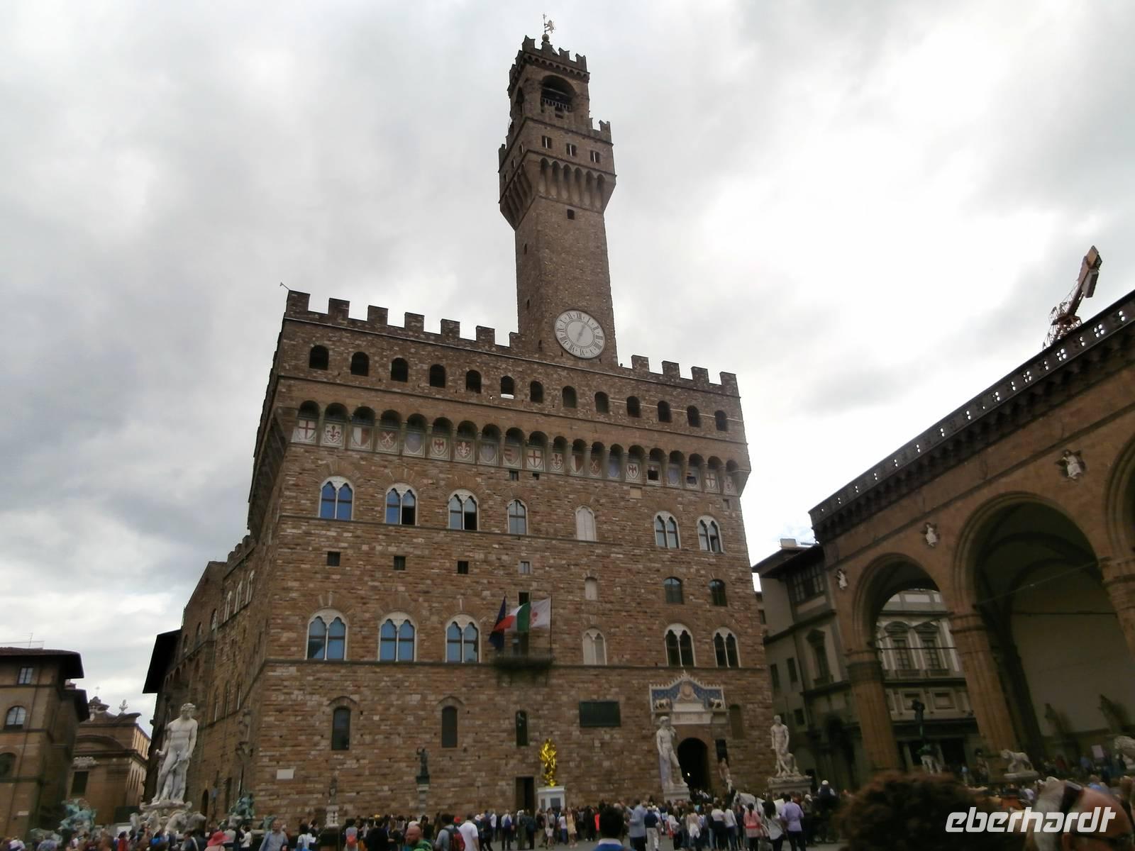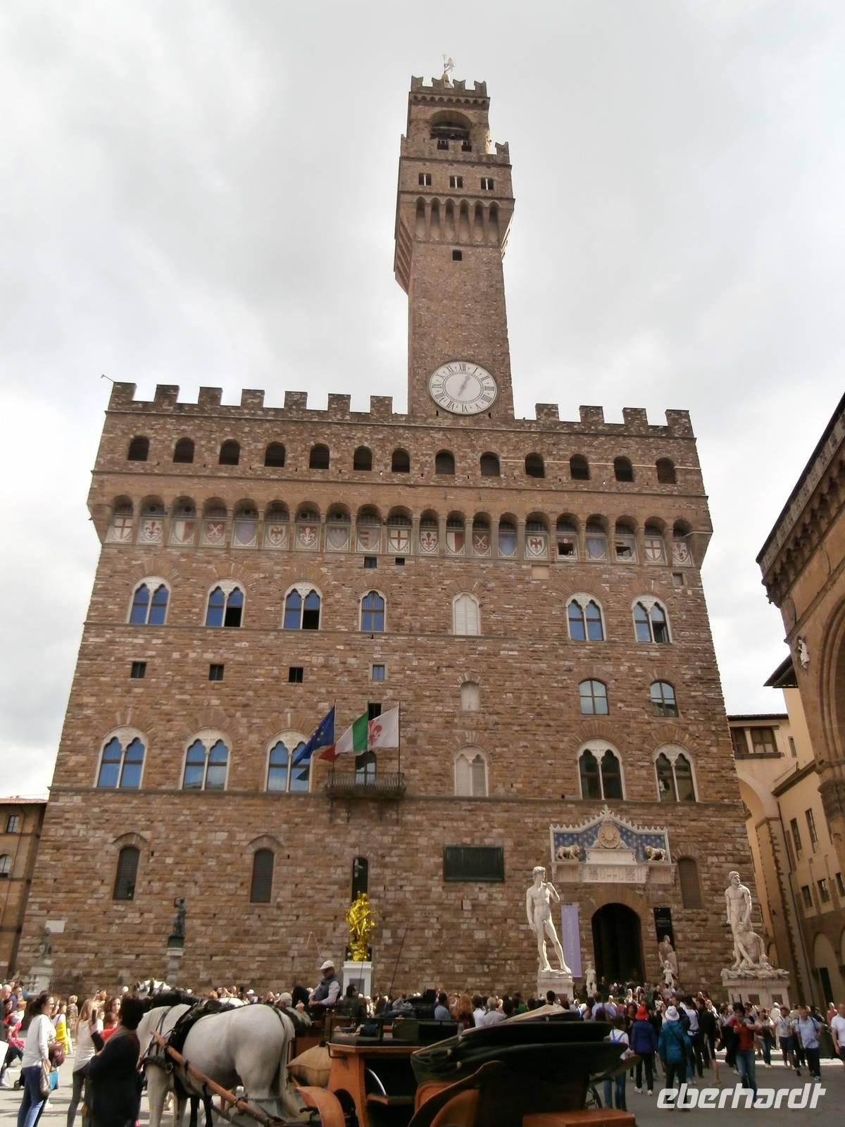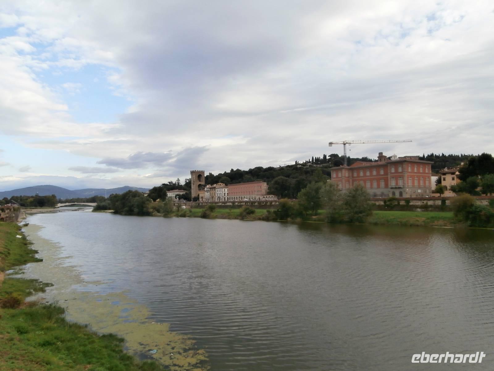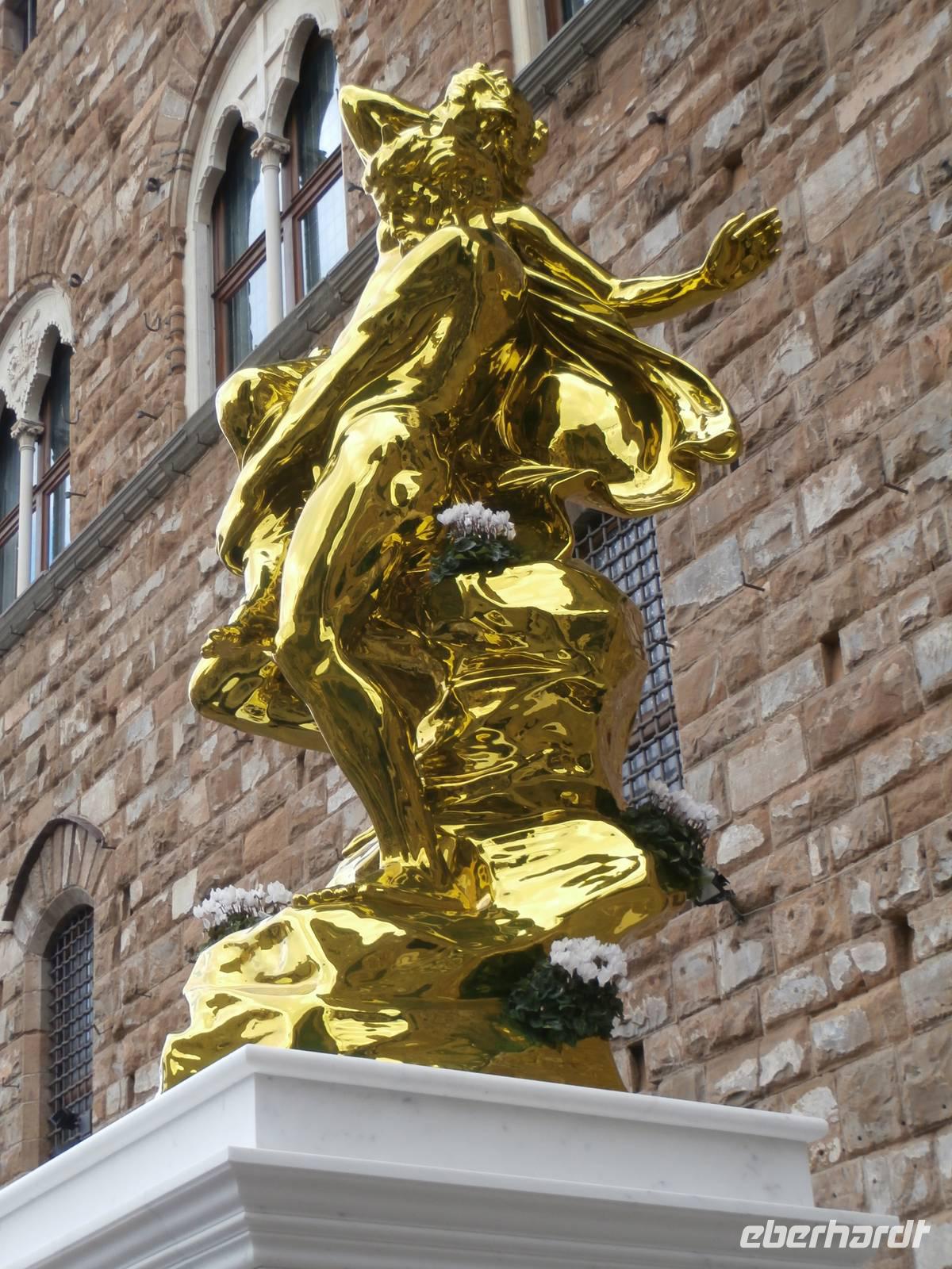 Schönes Wetter mit angenehmen Temperaturen erwartet uns in Florenz. Matthias Feldmann unser örtlicher Reiseleiter in Florenz erwartet uns am Zecca Turm direkt am Arno, dem Fluss, der Florenz durchfließt. Als erstes besichtigen wir Santa Croce, die Franziskanerkirche hat man 1294 umgebaut, sie ist die Begräbnisstätte der Berühmten. Wir sehen Grabmale von Michelangelo, Rossini und Galileo Galilei. Weiter geht es auf unserem Rundgang der Piazza della Signoria entgegen, ein beeindruckender Platz, er wird vom wuchtigen Turm des Palazzo Vecchio beherrscht. Den Neptun-Brunnen, das Reiterdenkmal des Großherzogs Cosimo I. und die Kopie des berühmten „David" vom Michelangelo können wir hier betrachten und fotografieren. Auch eine neue Statue in Gelb, die heute eingeweiht wird, können wir betrachten, es ist schon etwas gewöhnungsbedürftig, dieses neue Werk.