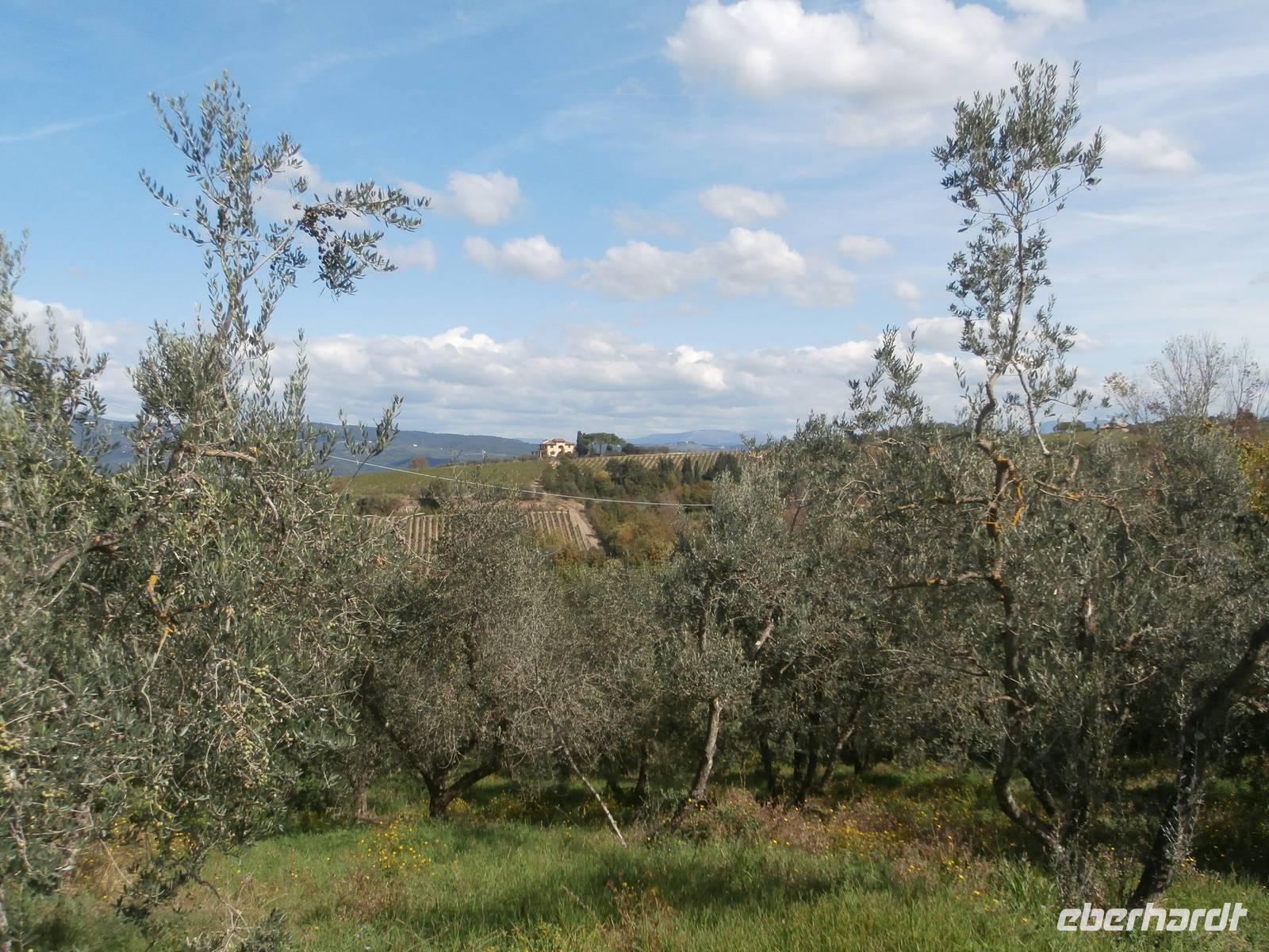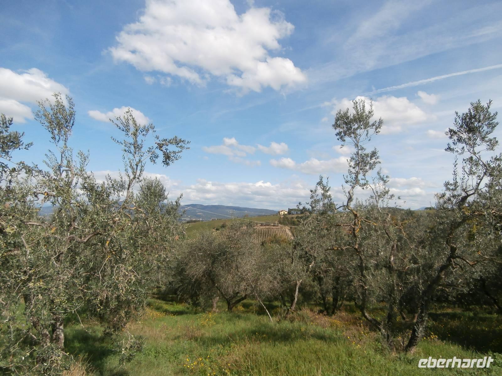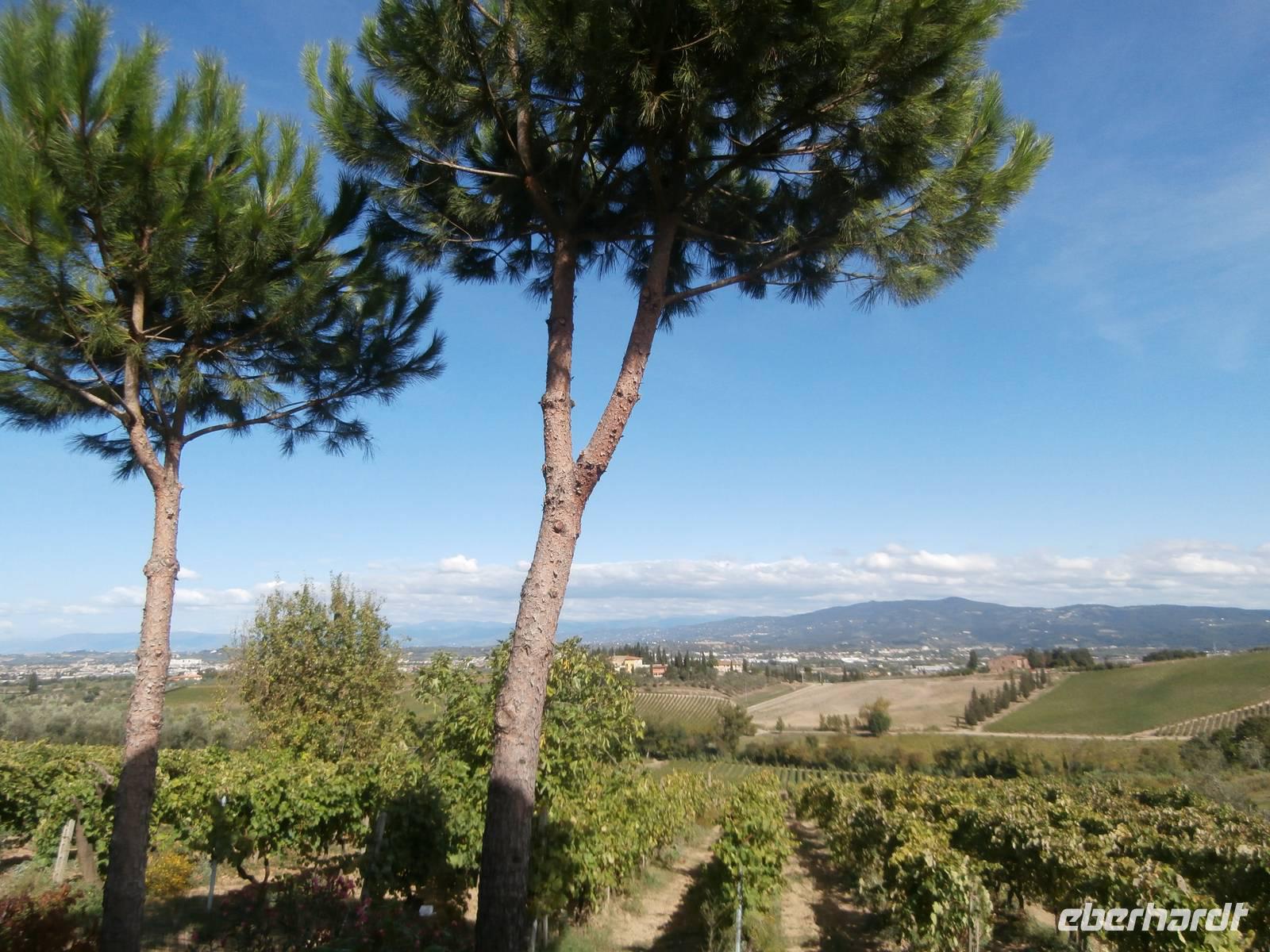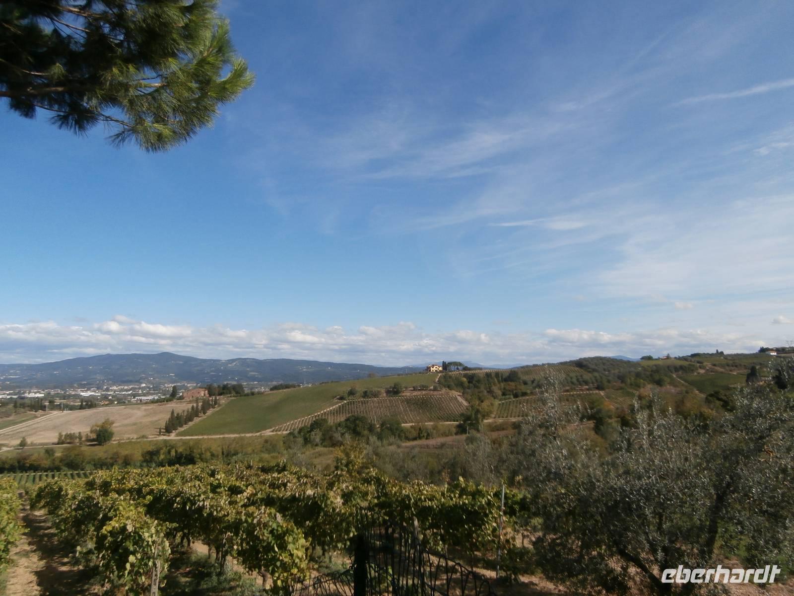 Geburtsort Leonardos, er lebte von 1452-1519 in einen Kleinstädtchen mit dem Museum Leonardiano in der Burg Conti Guidi. Heute erleben wir typisch toskanisches Flair mit herrlicher Landschaft. Im Weingut werden wir schon erwartet und mit herrlichen Ausblicken weit in das Chiantiland hinein bekommt unsere Verkostung den richtigen Rahmen. Wir beginnen mit dem weißen Wein und wir steigern uns, denn vier rote Sorten bis hin zum Vino Santo, dem heiligen Wein, verkosten alle Reisegäste. Dazu bekommen wir ein köstliches Öl auf typisch ungesalzenem, toskanischem Brot gereicht. Lecker auch die Salami, der Schinken und der Pecorino-Käse: einfach spitze und zum Abschluss verkosten wir noch einen Grappa. Das Gruppenfoto nehmen wir hier auch auf, die Olivenbäume und der Ausblick in das umliegende Land laden dazu ein und der Senior Chef bekommt einen Ehrenplatz in unserer Mitte. Wir sind hier sehr herzlich willkommen geheißen worden-Danke.