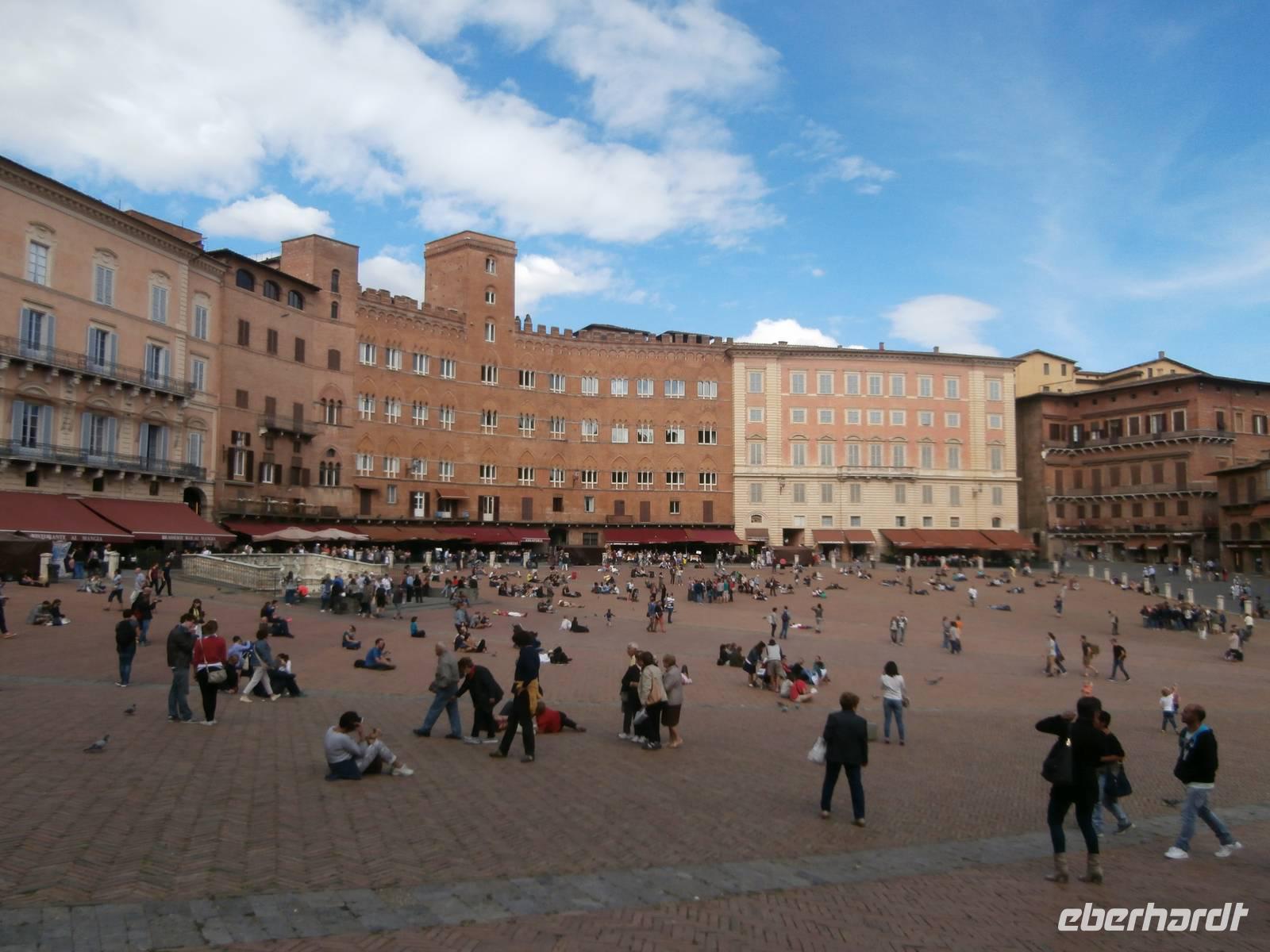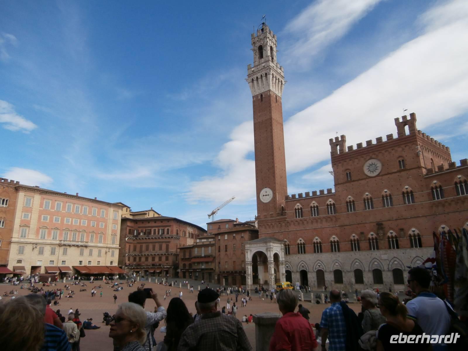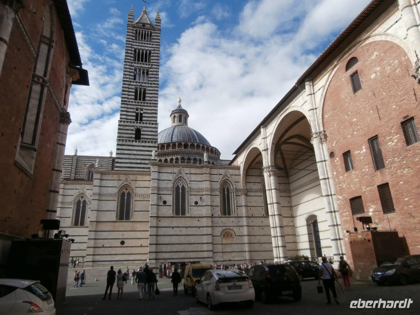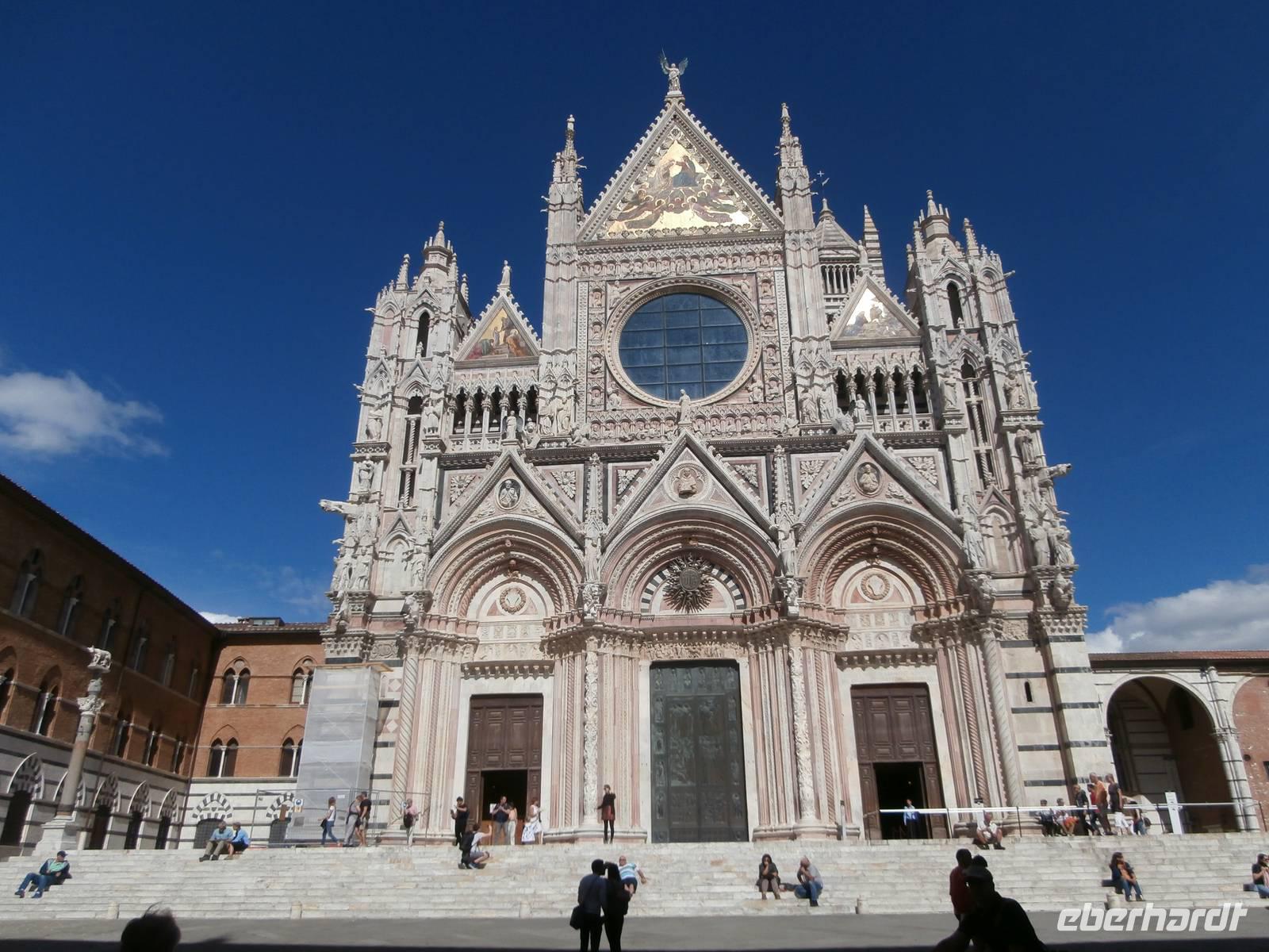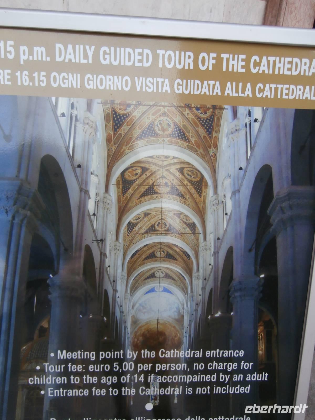 Abfahren wollen wir nicht, aber Siena, die Stadt des berühmten Dom's und des weltbekannten Palios, dem Pferderennen auf der Piazza del Campo, stehen für den Nachmittag auf dem Programm. Wir treffen uns mit Bettina, unsere örtliche Führung nimmt uns mit auf eine lange Fahrt mit Rolltreppen hinauf in die Stadt Siena. Sie zeigt uns nicht nur eine der bedeutendsten Städte der Toskana, sondern auch Italiens. Der Dom Santa Maria Assunta mit seiner überreichen Ausgestaltung steht zuerst als Besichtigung an, aber auch das Stadtzentrum mit der Piazza del Campo, wo das berühmte Pferderennen, der Palio, ausgetragen wird, ist ein Programmpunkt. Die Fahnen der Stadtviertel, der Contrade, wehen im Wind. Nach unserer Freizeit geht's zu Fuß zur Festung, hier werden wir von Peter mit dem Bus erwartet und dann fahren wir nach Montecatini Terme zurück.