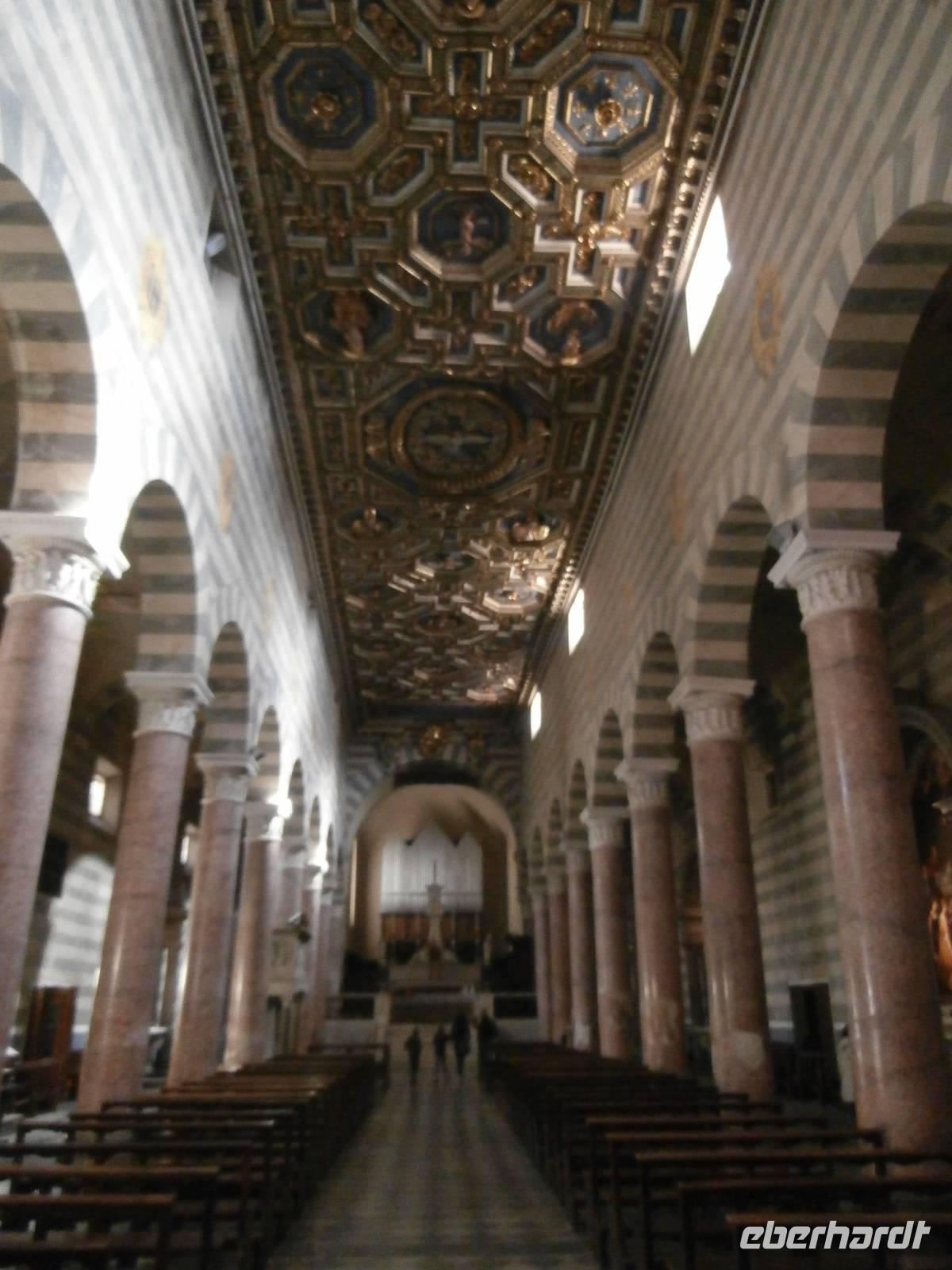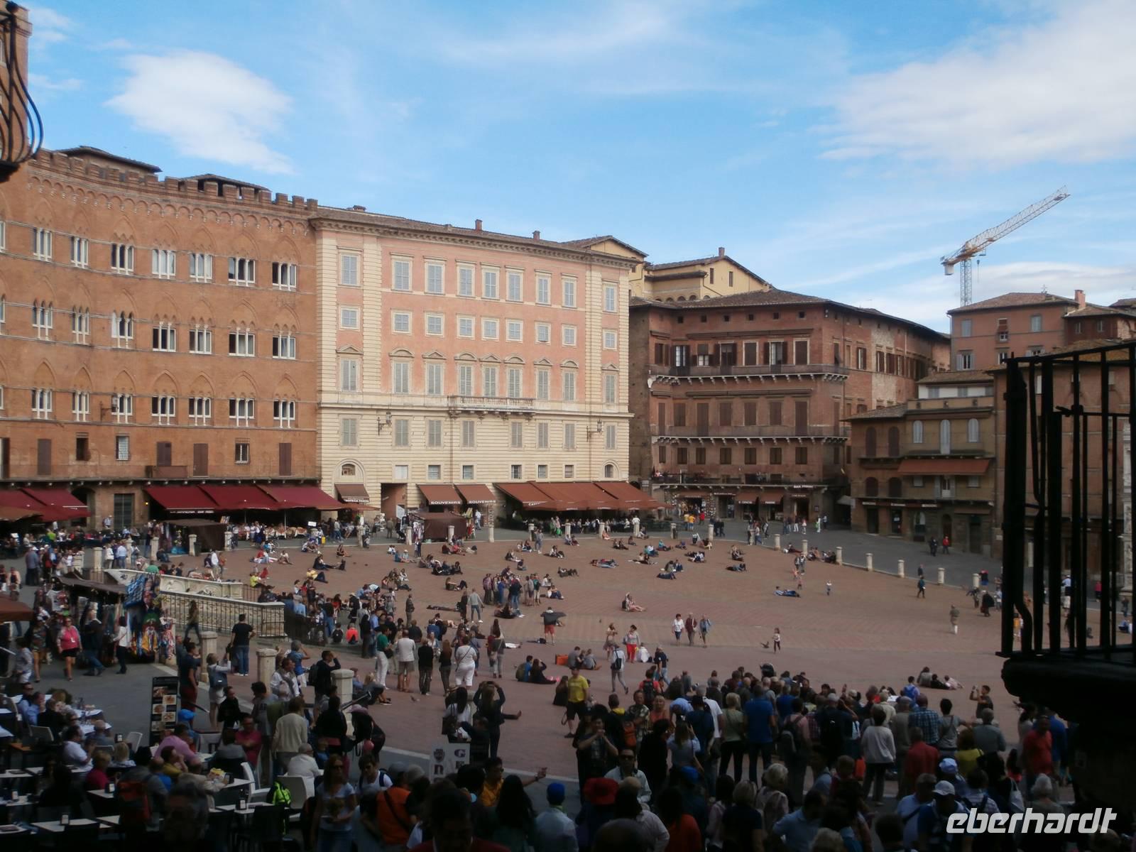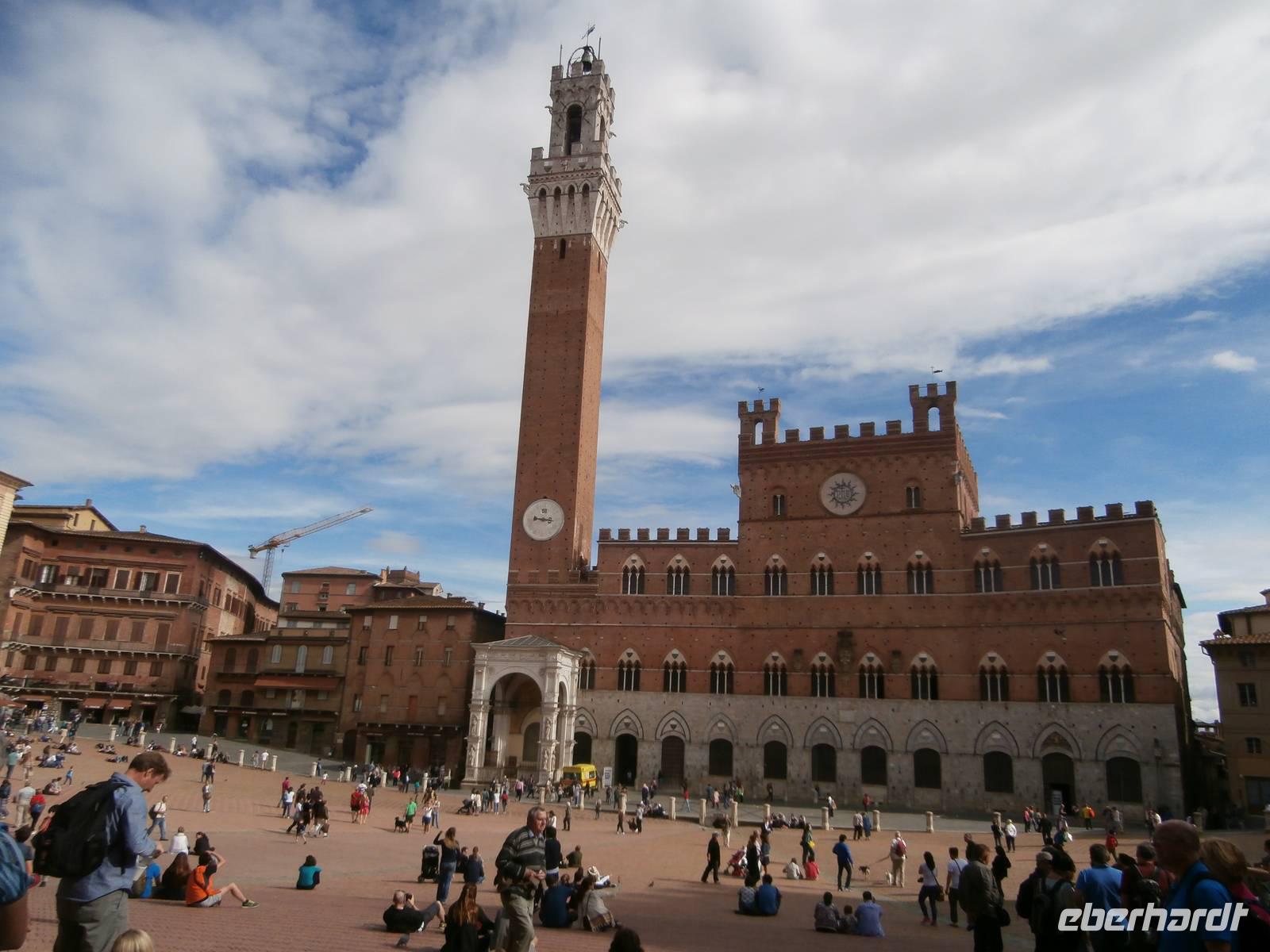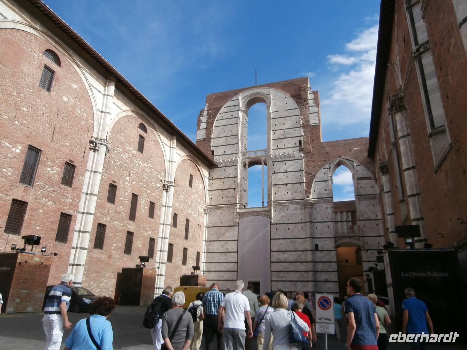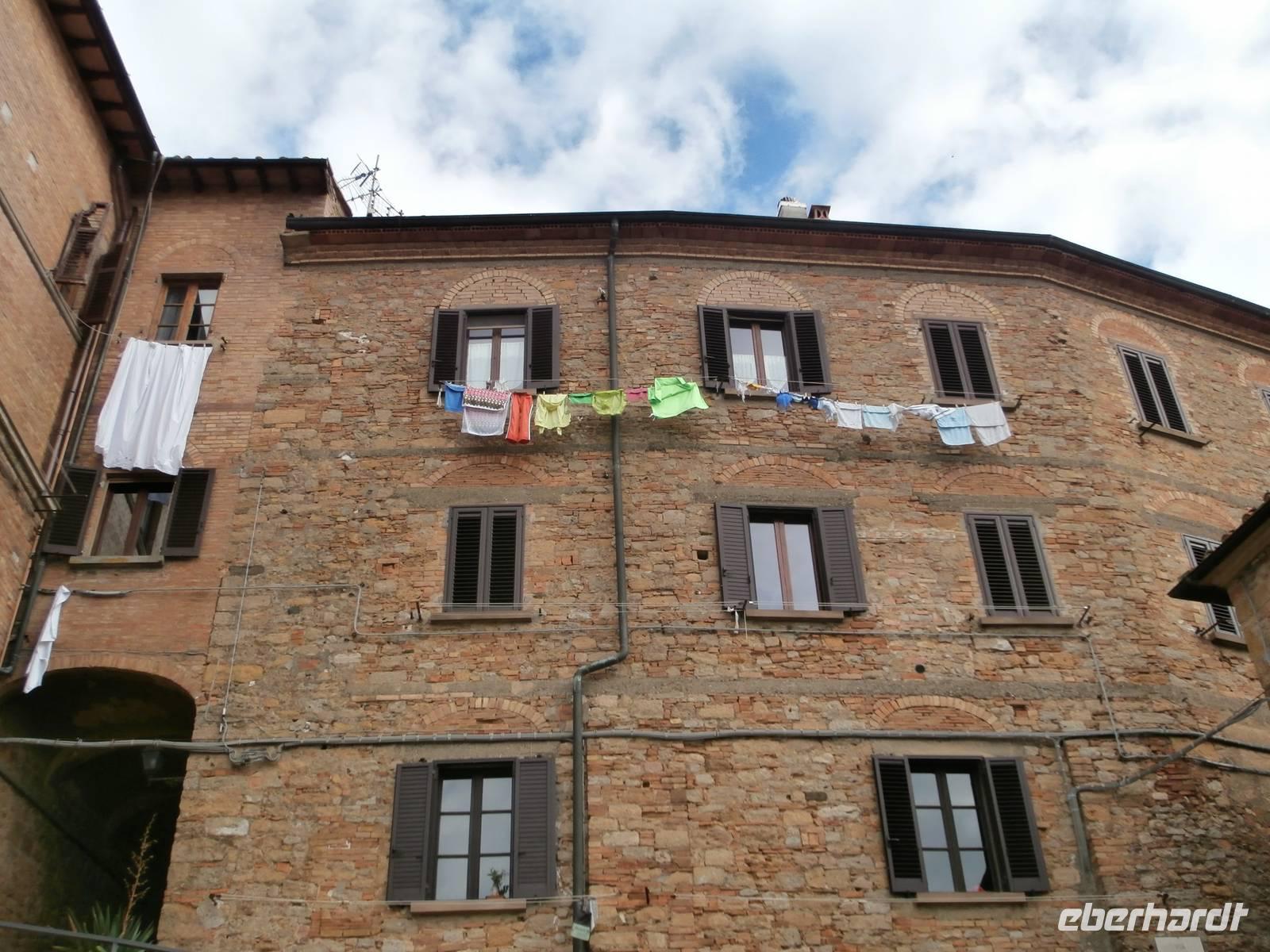 Abfahren wollen wir nicht, aber Siena, die Stadt des berühmten Dom's und des weltbekannten Palios, dem Pferderennen auf der Piazza del Campo, stehen für den Nachmittag auf dem Programm. Wir treffen uns mit Bettina, unsere örtliche Führung nimmt uns mit auf eine lange Fahrt mit Rolltreppen hinauf in die Stadt Siena. Sie zeigt uns nicht nur eine der bedeutendsten Städte der Toskana, sondern auch Italiens. Der Dom Santa Maria Assunta mit seiner überreichen Ausgestaltung steht zuerst als Besichtigung an, aber auch das Stadtzentrum mit der Piazza del Campo, wo das berühmte Pferderennen, der Palio, ausgetragen wird, ist ein Programmpunkt. Die Fahnen der Stadtviertel, der Contrade, wehen im Wind. Nach unserer Freizeit geht's zu Fuß zur Festung, hier werden wir von Peter mit dem Bus erwartet und dann fahren wir nach Montecatini Terme zurück.
