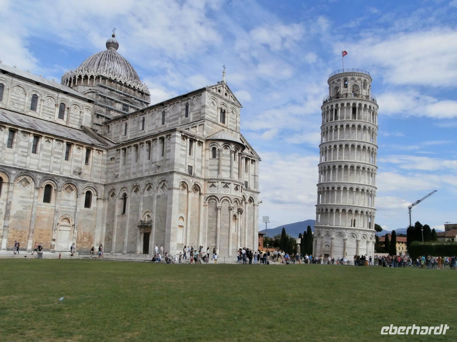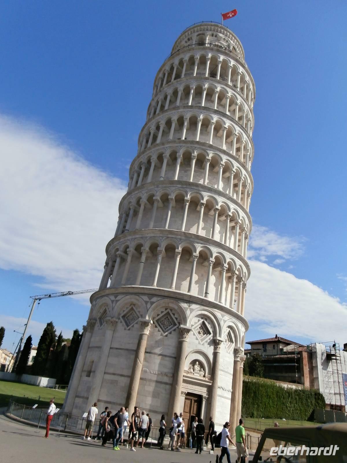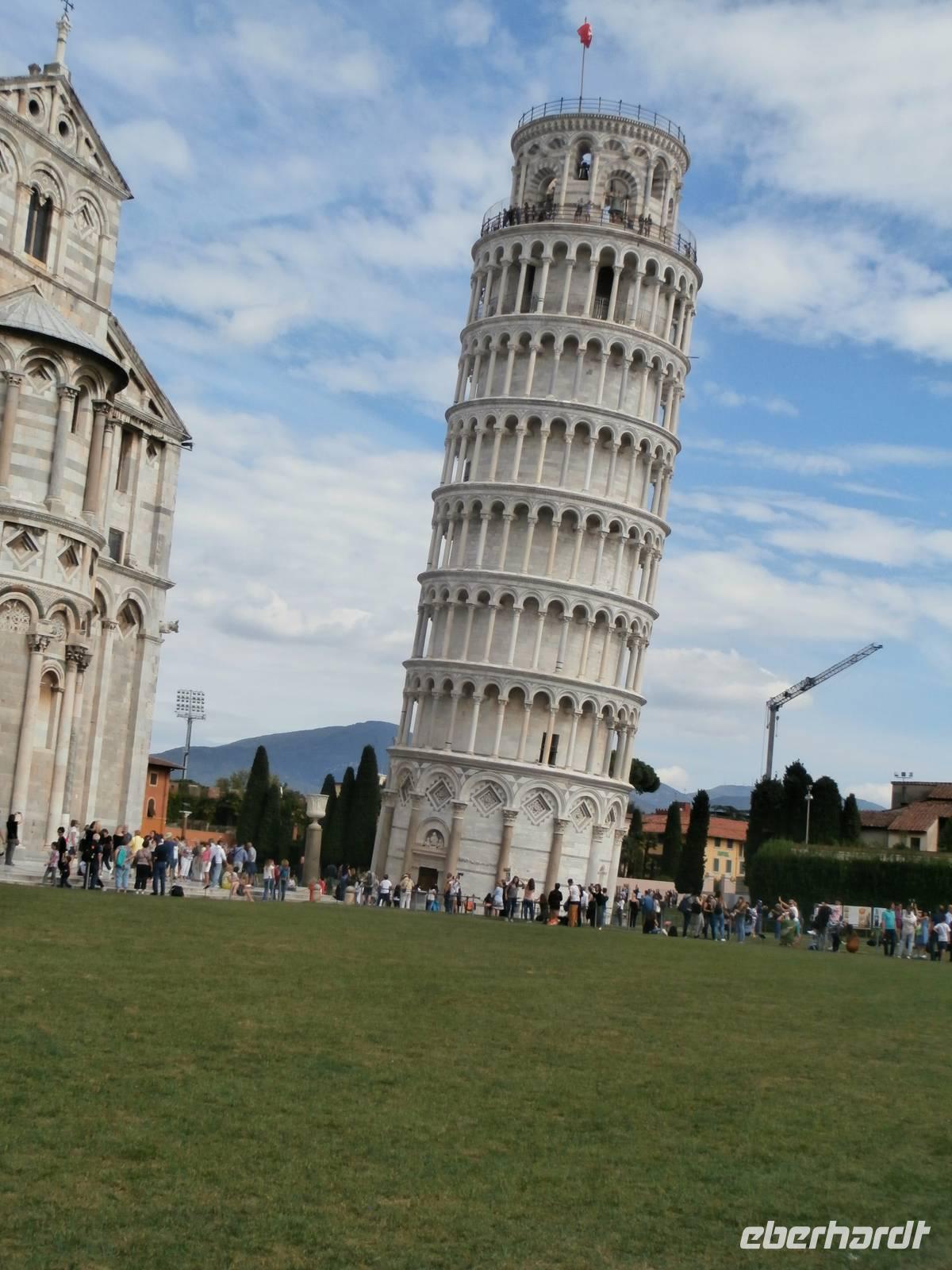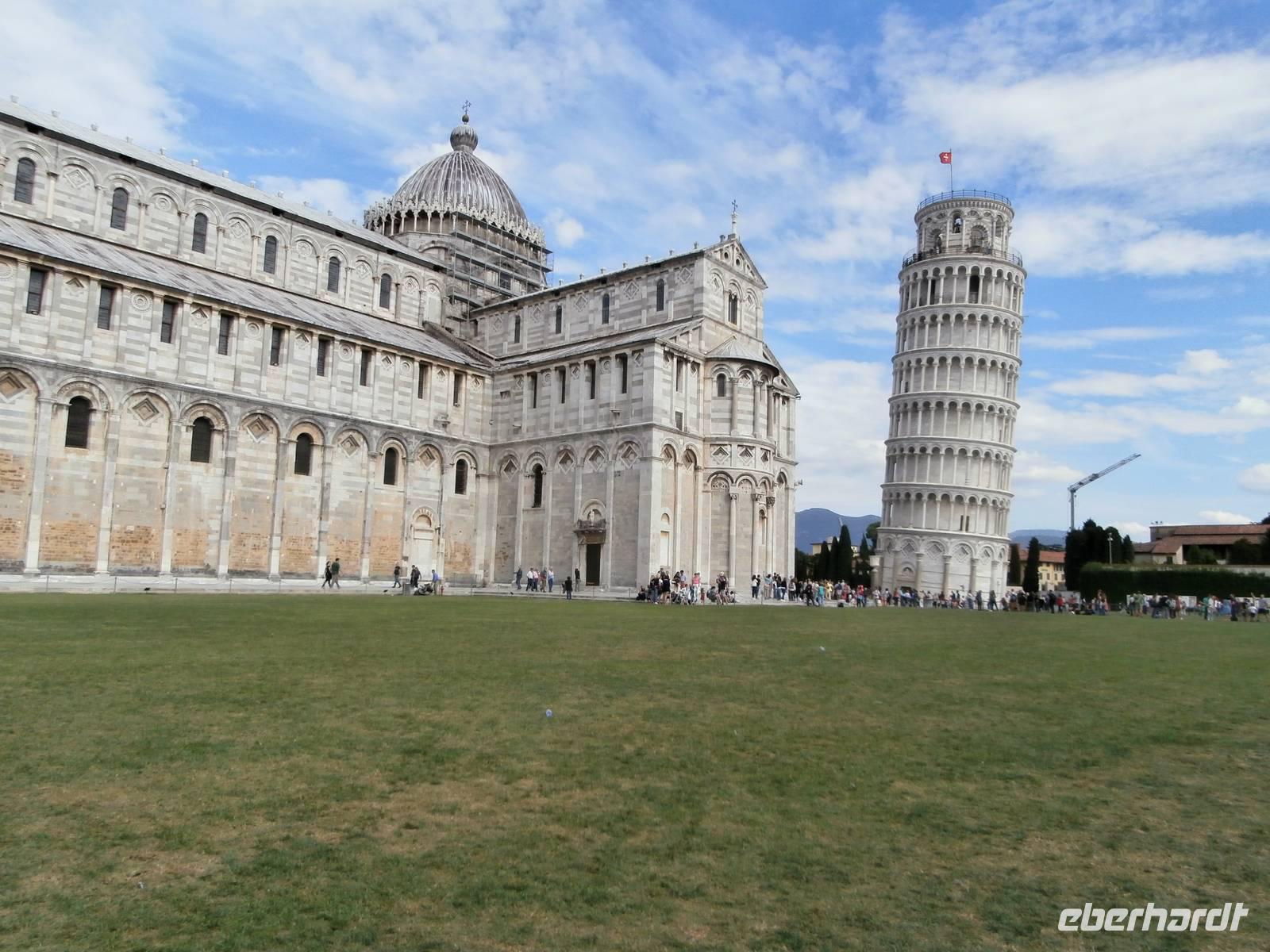 Den Dom St. Martin besichtigen wir während unseres Rundganges mit Nada und wir sehen auch den mit Eichenbäumen begrünten Wohnturm der Guinigi aus dem 14. Jahrhundert. Die Kirche San Michele in Foro ist sehr beliebt bei den Bewohnern der Stadt Lucca. Auf der Kirche oben auf dem fünfstöckigen Aufsatz grüßt der Erzengel Michael. Nach Freizeit und Mittagspause führt unsere Fahrt nach Pisa, die Stadt im Westen der Toskana, in der Nähe des Tyrrhenischen Meeres. Mit einem Shuttlebus gelangen wir vom zentralen Parkplatz zum Campo dei Miracoli, dem Platz der Wunder, mit dem Dom Santa Maria Assunta, dem Baptisterium, dem Schiefen Turm und dem Campo Santo. Die Bauwerke sind alle im 11.-13. Jahrhundert, als Pisa eine der mächtigsten Städte Europas war, entstanden. Der Schiefe Turm begeistert alle von uns, stellt man sich doch die Neigung nicht so extrem vor. Die Schieflage beruht auf dem Untergrund aus lehmigen Morast und Sand, der sich unter Gewicht verformt hat. Nach dem Rundgang auf dem Campo dei Miracoli steigen einige unserer Gäste auf den Schiefen Turm und genießen bei traumhaftem Wetter die Aussicht auf die Umgebung. Bis hin zum Arno, er fließt durch Pisa, sind Gäste gelaufen. Es ist ein fantastischer Aufenthalt in Pisa für die Reisegruppe von Eberhardt Travel. Mit unserem Reisebus gesteuert von Peter Möbius treten wir am Nachmittag die Rückreise zum Hotel in Montecatini Terme an. Heute müssen wir noch Koffer packen, denn am morgigen Montag geht unsere Reise weiter in Richtung Süden an die Küste.