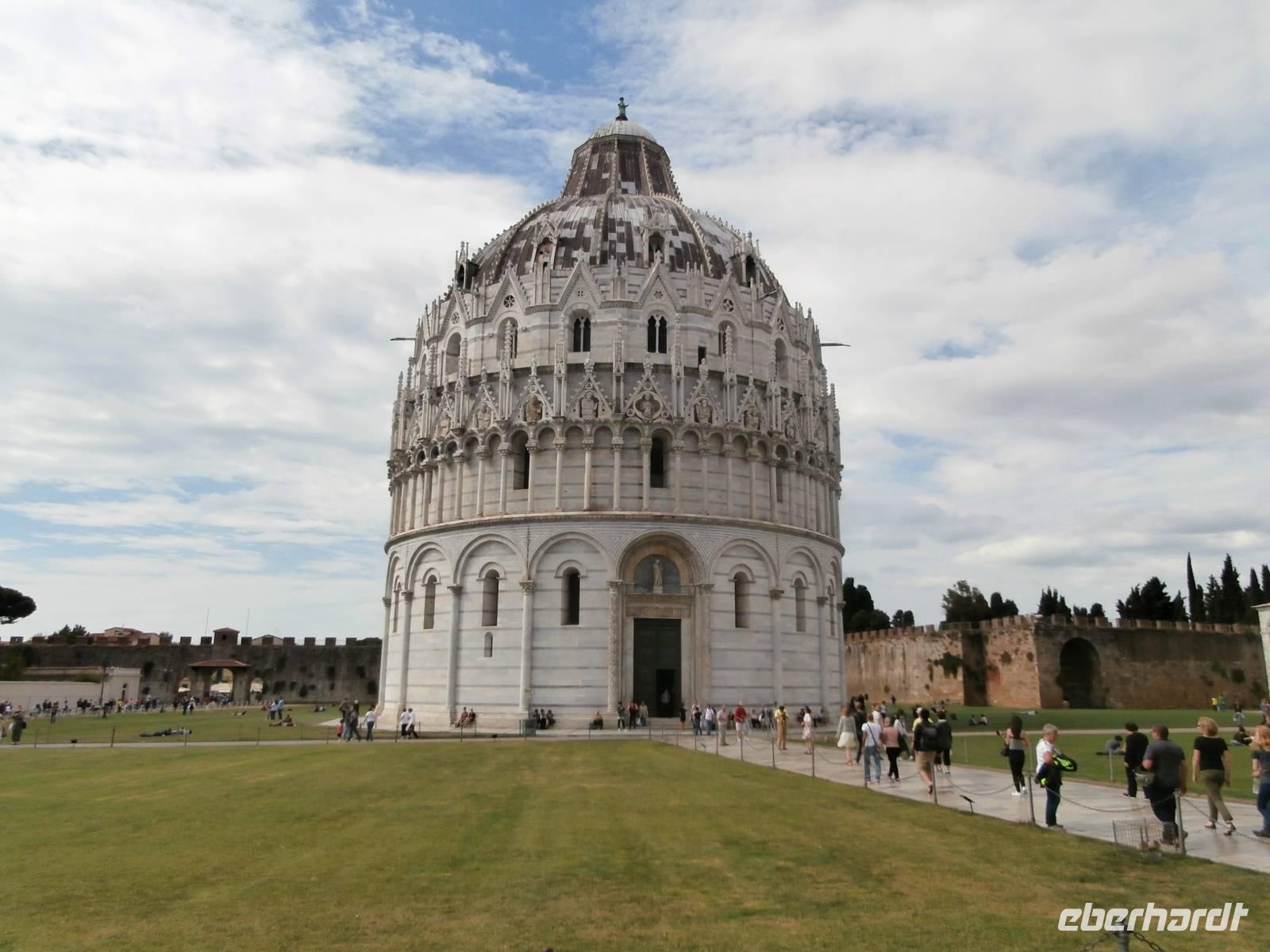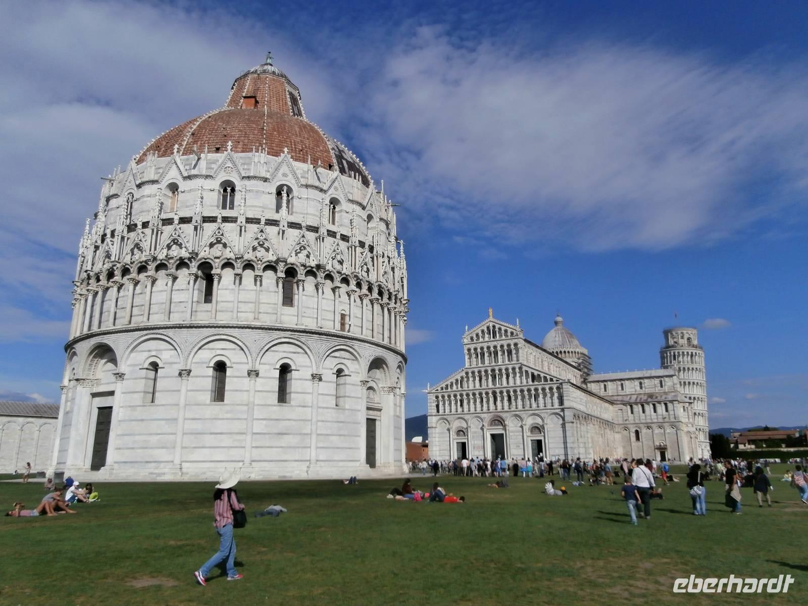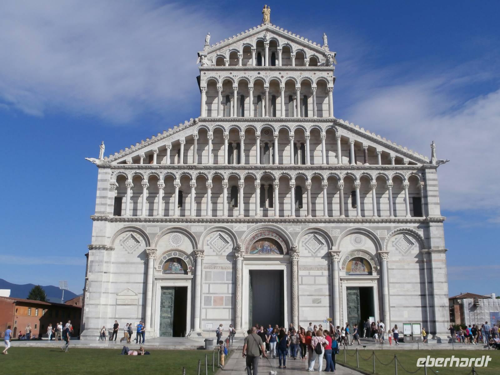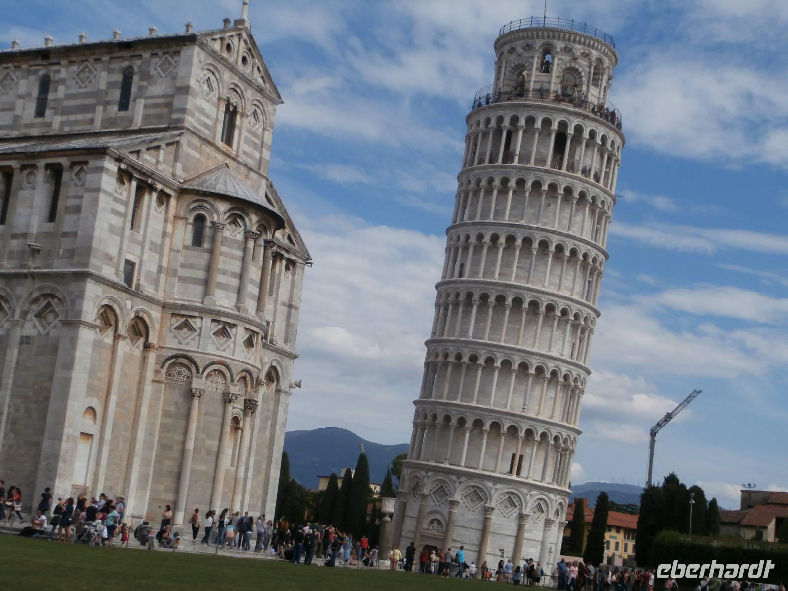 Den Dom St. Martin besichtigen wir während unseres Rundganges mit Nada und wir sehen auch den mit Eichenbäumen begrünten Wohnturm der Guinigi aus dem 14. Jahrhundert. Die Kirche San Michele in Foro ist sehr beliebt bei den Bewohnern der Stadt Lucca. Auf der Kirche oben auf dem fünfstöckigen Aufsatz grüßt der Erzengel Michael. Nach Freizeit und Mittagspause führt unsere Fahrt nach Pisa, die Stadt im Westen der Toskana, in der Nähe des Tyrrhenischen Meeres. Mit einem Shuttlebus gelangen wir vom zentralen Parkplatz zum Campo dei Miracoli, dem Platz der Wunder, mit dem Dom Santa Maria Assunta, dem Baptisterium, dem Schiefen Turm und dem Campo Santo. Die Bauwerke sind alle im 11.-13. Jahrhundert, als Pisa eine der mächtigsten Städte Europas war, entstanden. Der Schiefe Turm begeistert alle von uns, stellt man sich doch die Neigung nicht so extrem vor. Die Schieflage beruht auf dem Untergrund aus lehmigen Morast und Sand, der sich unter Gewicht verformt hat. Nach dem Rundgang auf dem Campo dei Miracoli steigen einige unserer Gäste auf den Schiefen Turm und genießen bei traumhaftem Wetter die Aussicht auf die Umgebung. Bis hin zum Arno, er fließt durch Pisa, sind Gäste gelaufen. Es ist ein fantastischer Aufenthalt in Pisa für die Reisegruppe von Eberhardt Travel. Mit unserem Reisebus gesteuert von Peter Möbius treten wir am Nachmittag die Rückreise zum Hotel in Montecatini Terme an. Heute müssen wir noch Koffer packen, denn am morgigen Montag geht unsere Reise weiter in Richtung Süden an die Küste.