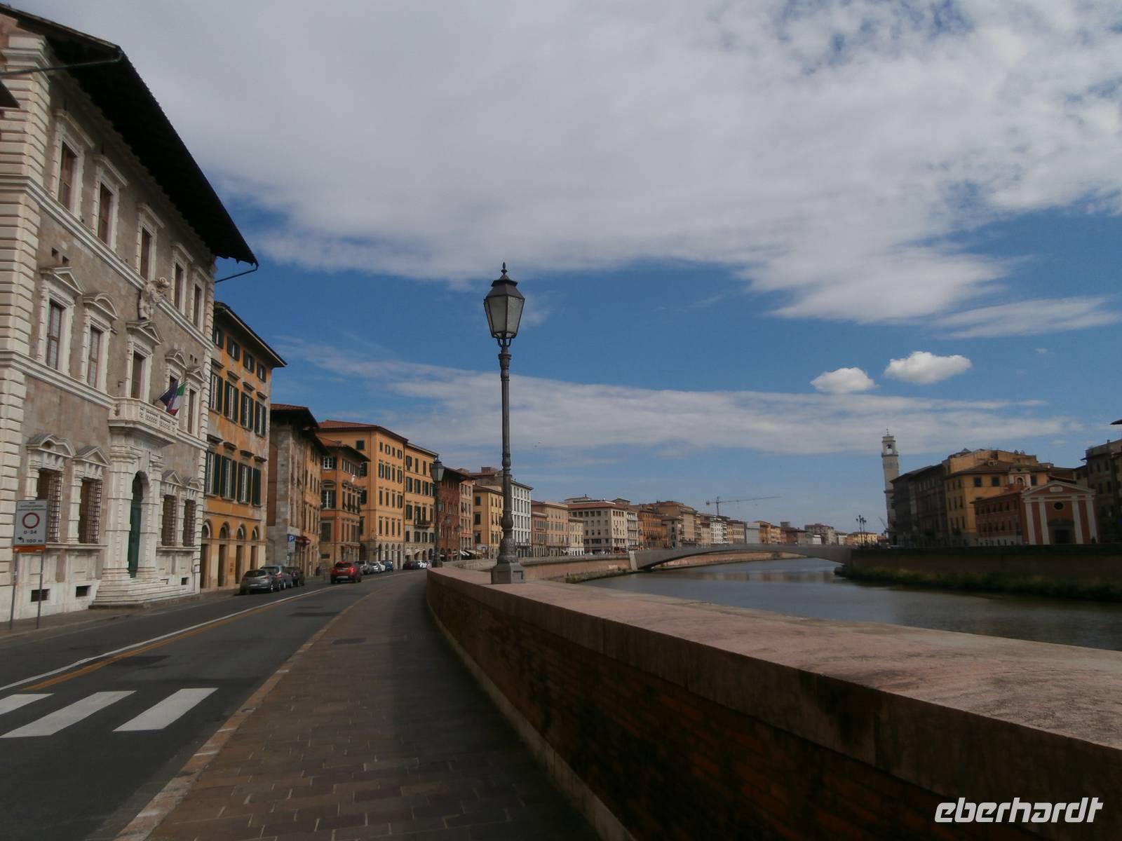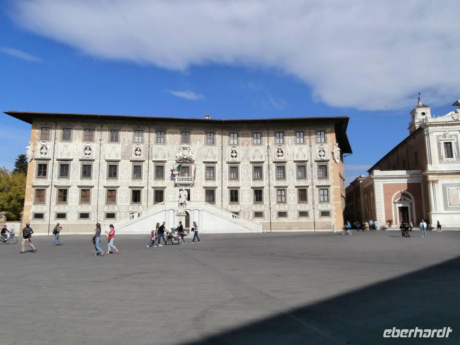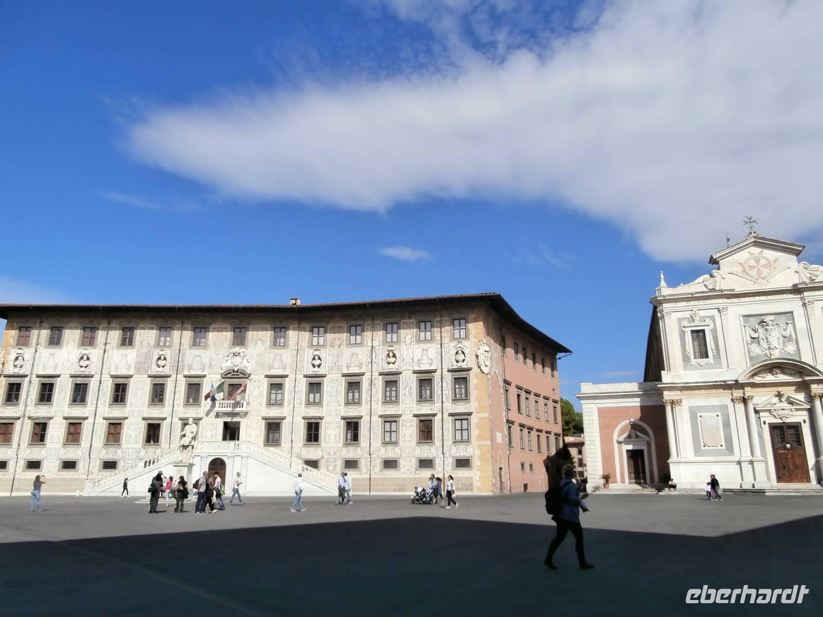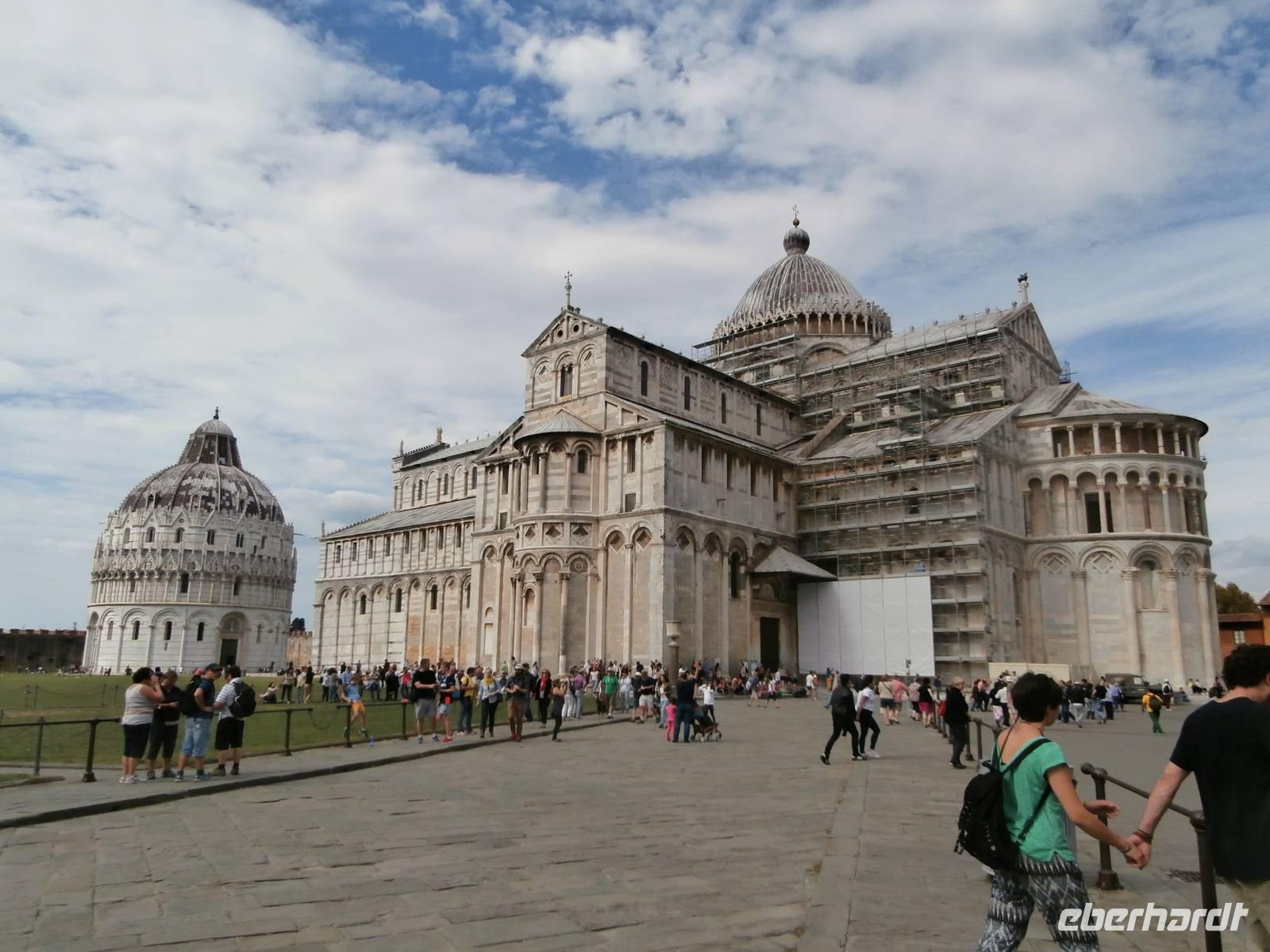Den Dom St. Martin besichtigen wir während unseres Rundganges mit Nada und wir sehen auch den mit Eichenbäumen begrünten Wohnturm der Guinigi aus dem 14. Jahrhundert. Die Kirche San Michele in Foro ist sehr beliebt bei den Bewohnern der Stadt Lucca. Auf der Kirche oben auf dem fünfstöckigen Aufsatz grüßt der Erzengel Michael. Nach Freizeit und Mittagspause führt unsere Fahrt nach Pisa, die Stadt im Westen der Toskana, in der Nähe des Tyrrhenischen Meeres. Mit einem Shuttlebus gelangen wir vom zentralen Parkplatz zum Campo dei Miracoli, dem Platz der Wunder, mit dem Dom Santa Maria Assunta, dem Baptisterium, dem Schiefen Turm und dem Campo Santo. Die Bauwerke sind alle im 11.-13. Jahrhundert, als Pisa eine der mächtigsten Städte Europas war, entstanden. Der Schiefe Turm begeistert alle von uns, stellt man sich doch die Neigung nicht so extrem vor. Die Schieflage beruht auf dem Untergrund aus lehmigen Morast und Sand, der sich unter Gewicht verformt hat. Nach dem Rundgang auf dem Campo dei Miracoli steigen einige unserer Gäste auf den Schiefen Turm und genießen bei traumhaftem Wetter die Aussicht auf die Umgebung. Bis hin zum Arno, er fließt durch Pisa, sind Gäste gelaufen. Es ist ein fantastischer Aufenthalt in Pisa für die Reisegruppe von Eberhardt Travel. Mit unserem Reisebus gesteuert von Peter Möbius treten wir am Nachmittag die Rückreise zum Hotel in Montecatini Terme an. Heute müssen wir noch Koffer packen, denn am morgigen Montag geht unsere Reise weiter in Richtung Süden an die Küste.