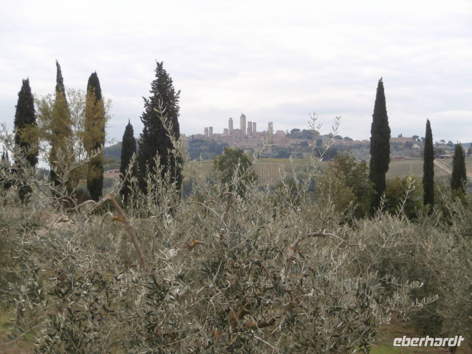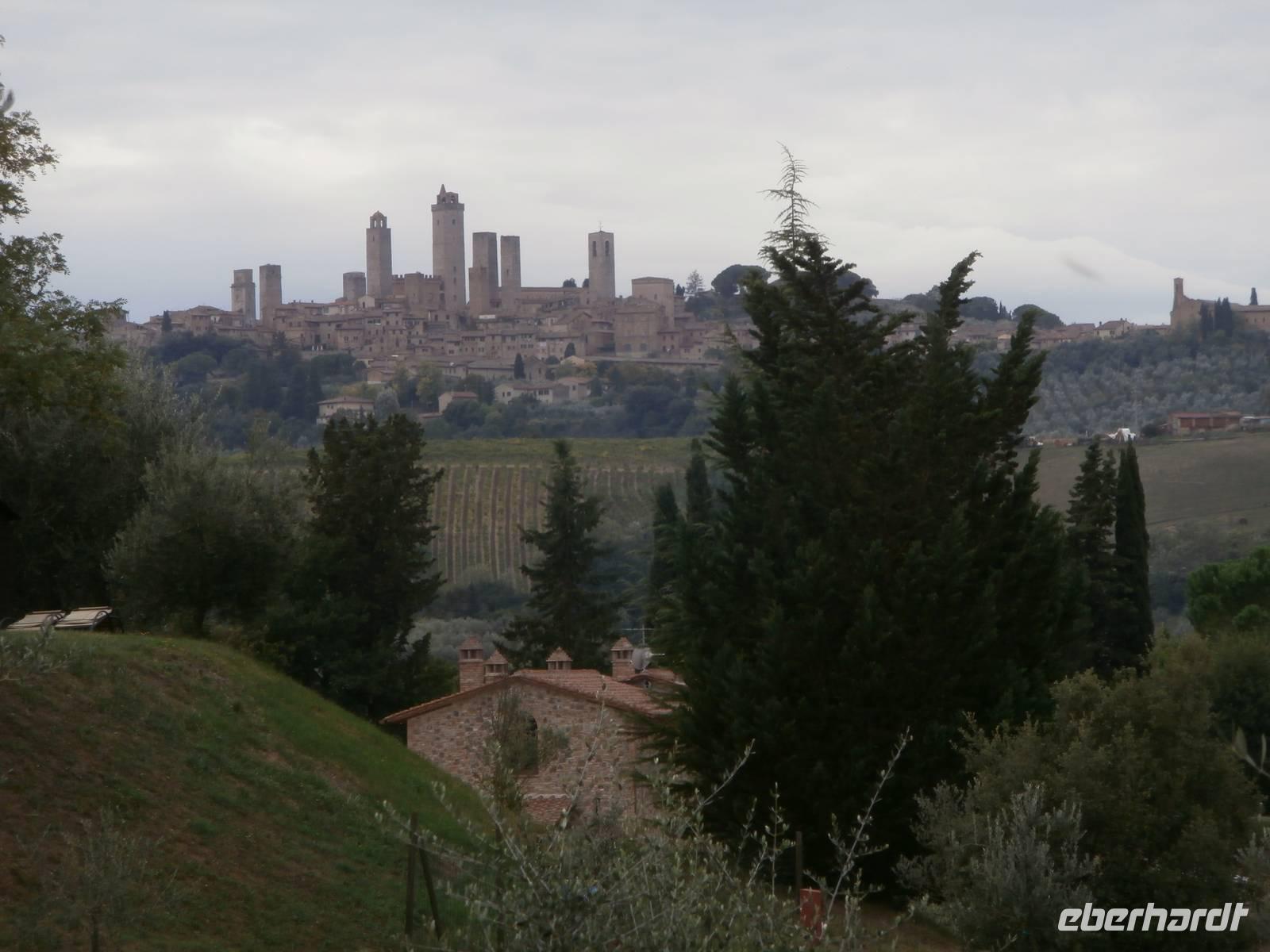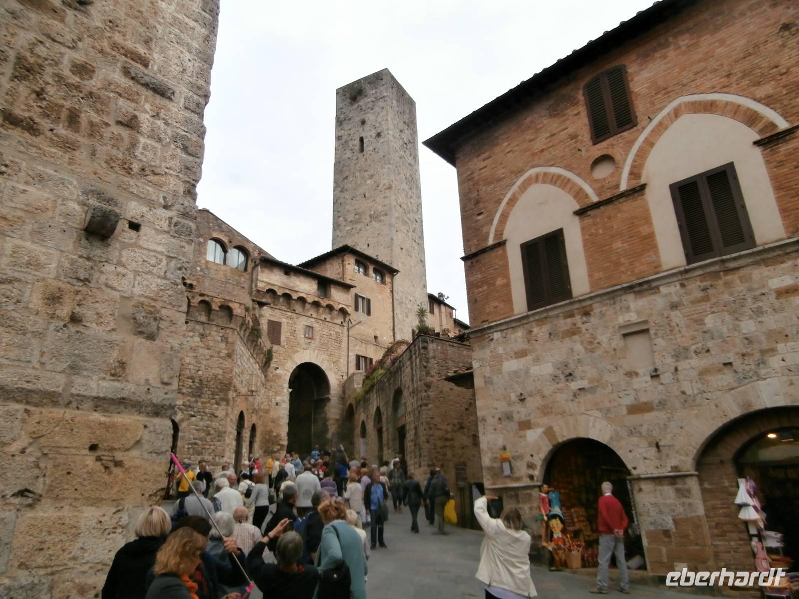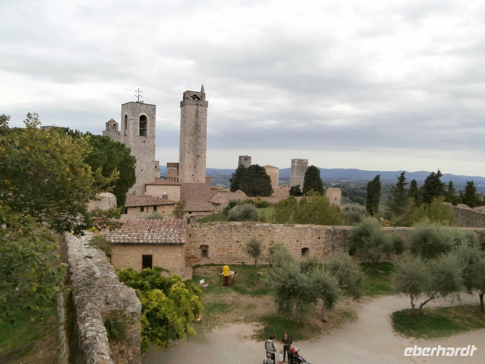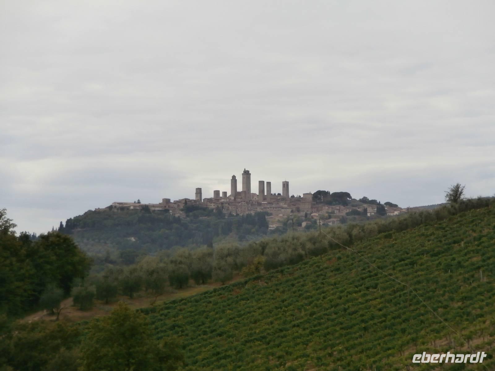 Danach fahren wir nicht sehr weit nur noch bis San Gimignano, der Stadt mit den heute noch 14 Geschlechtertürmen, die sich rivalisierende Adelsfamilien im 12./13. Jahrhundert errichtet haben. 73 waren es am Ende des Mittelalters, später erhielt die Stadt deshalb den Beinamen Manhattan des Mittelalters. San Gimignano ist heute eine sehr