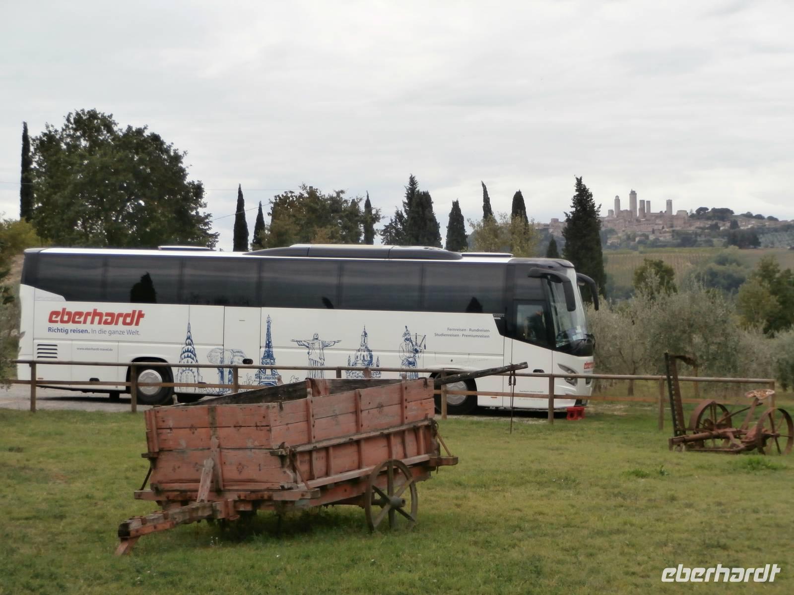 Safran ist ein feines Gewürz, es wird aber selten in unserer Küche verwendet. Wir fahren am Morgen mit unserem Gepäck von Montecatini Terme ab, um über Safran auf einem Bauernhof südlich von Empoli Informationen zu bekommen. Nach anfänglichen Schwierigkeiten, den Agriturismo Il Veccio Maneggio zu finden, gibt es den entscheidenden Hinweis am Straßenrand, endlich führt uns ein Weg zum Bauernhof, wo wir schon erwartet werden. Die vieltürmige mittelalterliche Stadt San Gimignano sehen wir schon von Weiten und Peter hält auch den Bus für einen Fotostopp an.