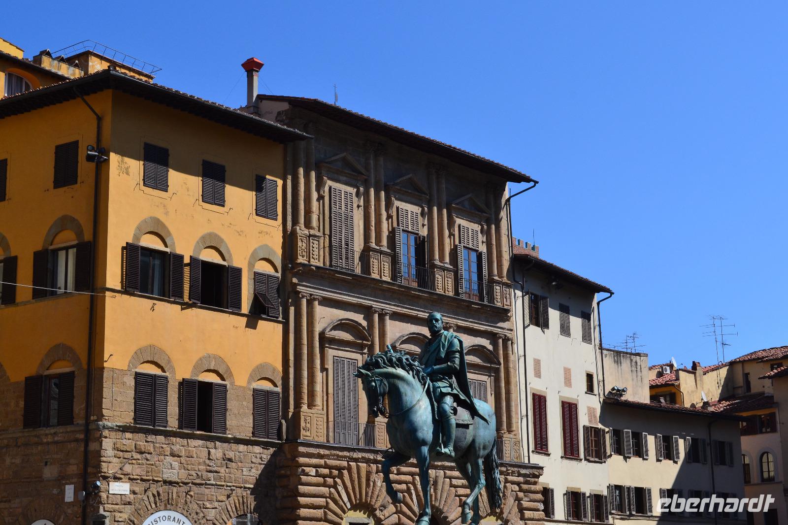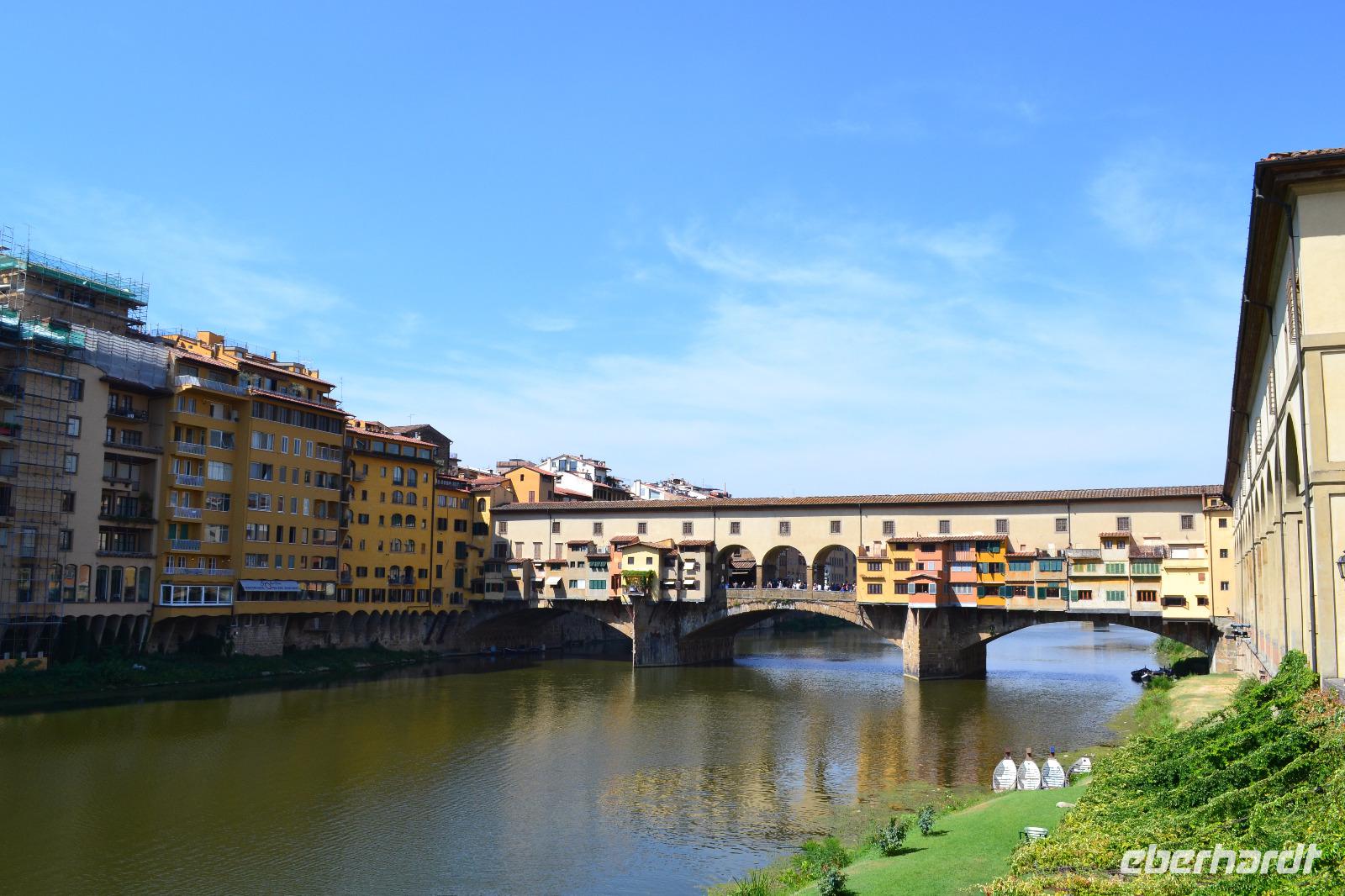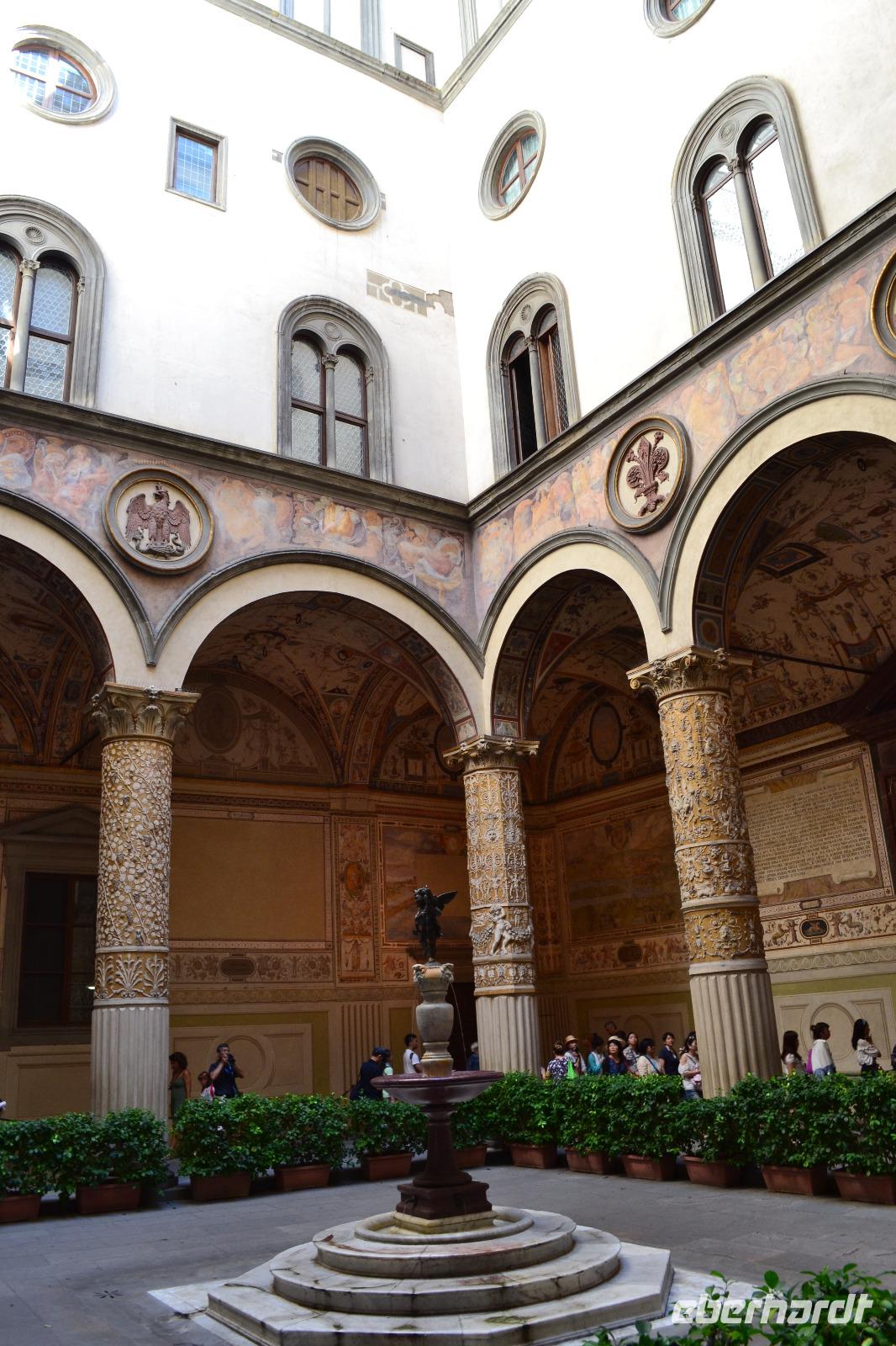 Vom "Elbflorenz" Dresden bis ins "richtige" Florenz hat uns unsere Reise schon geführt. Heute stürzen wir uns kopfüber hinein in die Intrigen der Familie Medici, das Florenz der Zeit Dantes, die Machtkämpfe zwischen Kaisertreuen und Papstanhängern. Zunächst verschaffen wir uns vom Piazzale Michelangelo aus einen Überblick über das Stadtpanorama. Dann geht es wieder hinunter ans Ufer des Arno, wo wir den Bus verlassen und mit der Stadtführung beginnen. Unser Stadtführer Matthias beeindruckt mit seinem unheimlichen Fachwissen und zieht uns schnell in seinen Bann. An der Nationalbibliothek vorbei laufen wir langsam in Richtung Piazza della Signoria, wo sich das Rathaus der Stadt, der Palazzo Vecchio, befindet. Wir besichtigen den Innenhof des Rathauses und der Uffizien, bevor wir in einem Bogen wieder auf dem Piazza della Signoria ankommen und uns zur Mittagspause verabschieden.