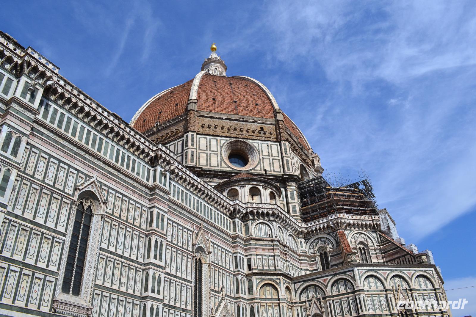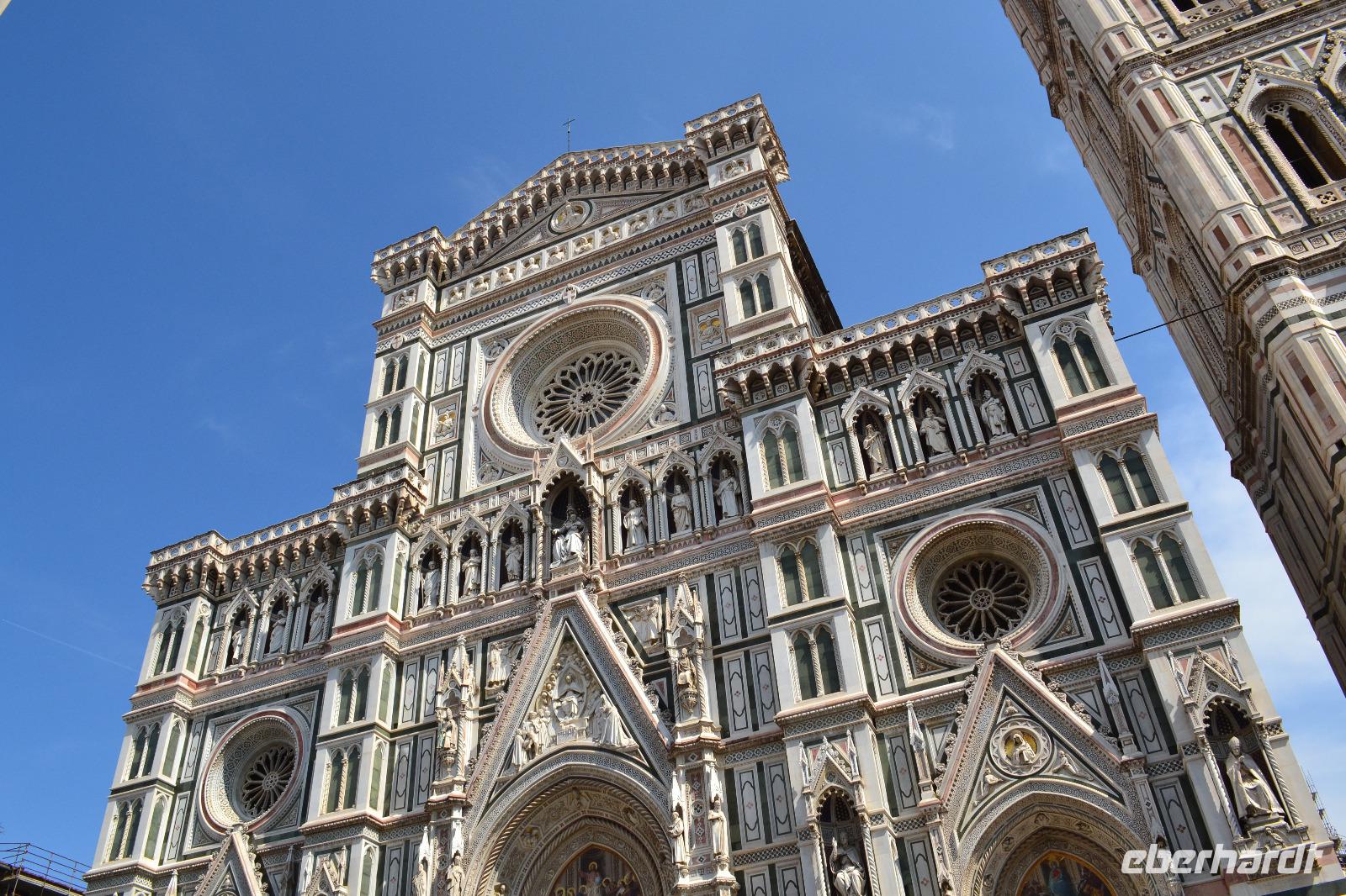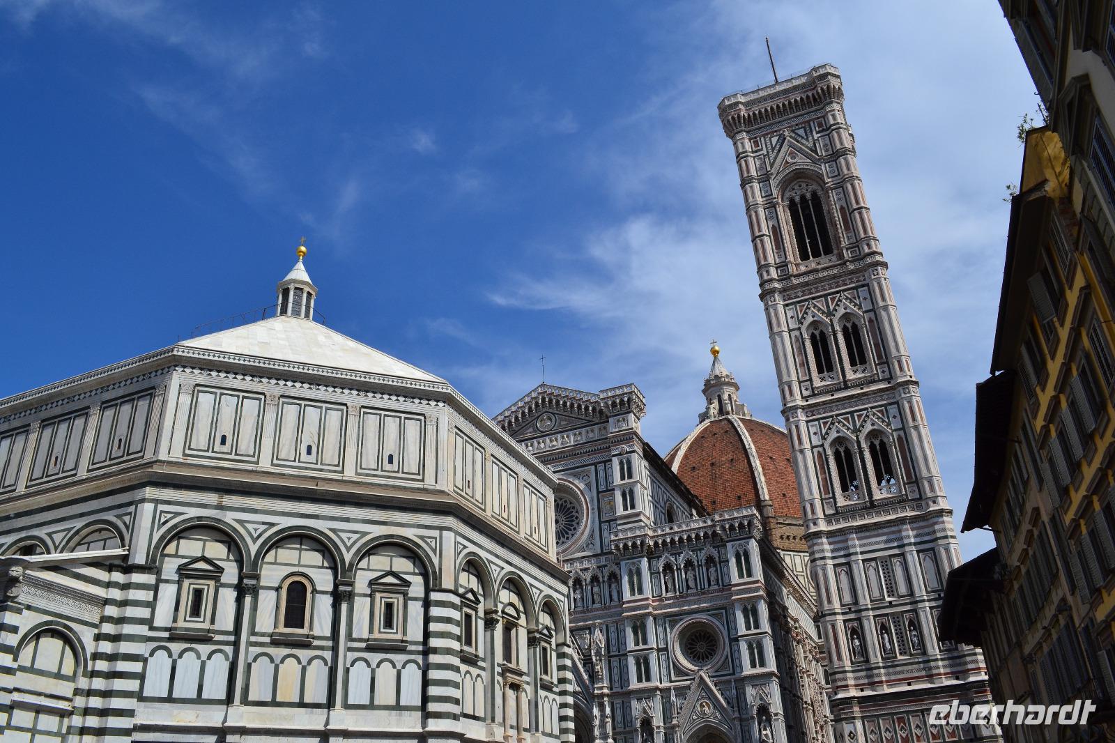 Nach einer Stunde treffen wir uns wieder und spazieren über den Piazza della Repubblica in Richtung Domplatz. Als wir um die Ecke biegen und das Baptisterium, die Fassade der Cattedrale Santa Maria del Fiore und den hoch aufragenden Glockenturm zum ersten Mal vor uns sehen bietet sich uns ein erhabener und überwältigender Anblick. Das bestimmende Element ist natürlich die Kuppel des genialen Architekten Filippo Brunelleschi. Es ist ein Wunder, dass sie überhaupt existiert. Lange Zeit zerbrachen sich die Florentiner den Kopf, wie und ob sie die Kuppel überhaupt erbauen können. Im Wettstreit mit den anderen toskanischen Städten hatten sich die Florentiner etwas übernommen als sie 1296 mit dem Bau begannen und erst Brunelleschi konnte mit einem kühnen Entwurf und viel Überzeugungsarbeit 1436 den Dom vollenden. Der Innenraum ist im Vergleich mit anderen sakralen Bauten der Toskana vielleicht nicht ganz so beeindruckend, imponiert aber durch seine Größe. Anschließend besichtigen wir noch das Franziskanerkloster mit der Kirche Santa Croce, in der sich viele Gräber berühmter Persönlichkeiten befinden, z. B. die Grabmäler Galileo Galileis, Machiavellis und Michelangelos. Von der Hitze etwas geschafft beenden wir unsere Stadtführung und gönnen uns individuell zur Abkühlung ein Eis, bevor wir mit dem Bus zurück nach Montecatini Terme in das Grand Hotel Panoramic fahren.