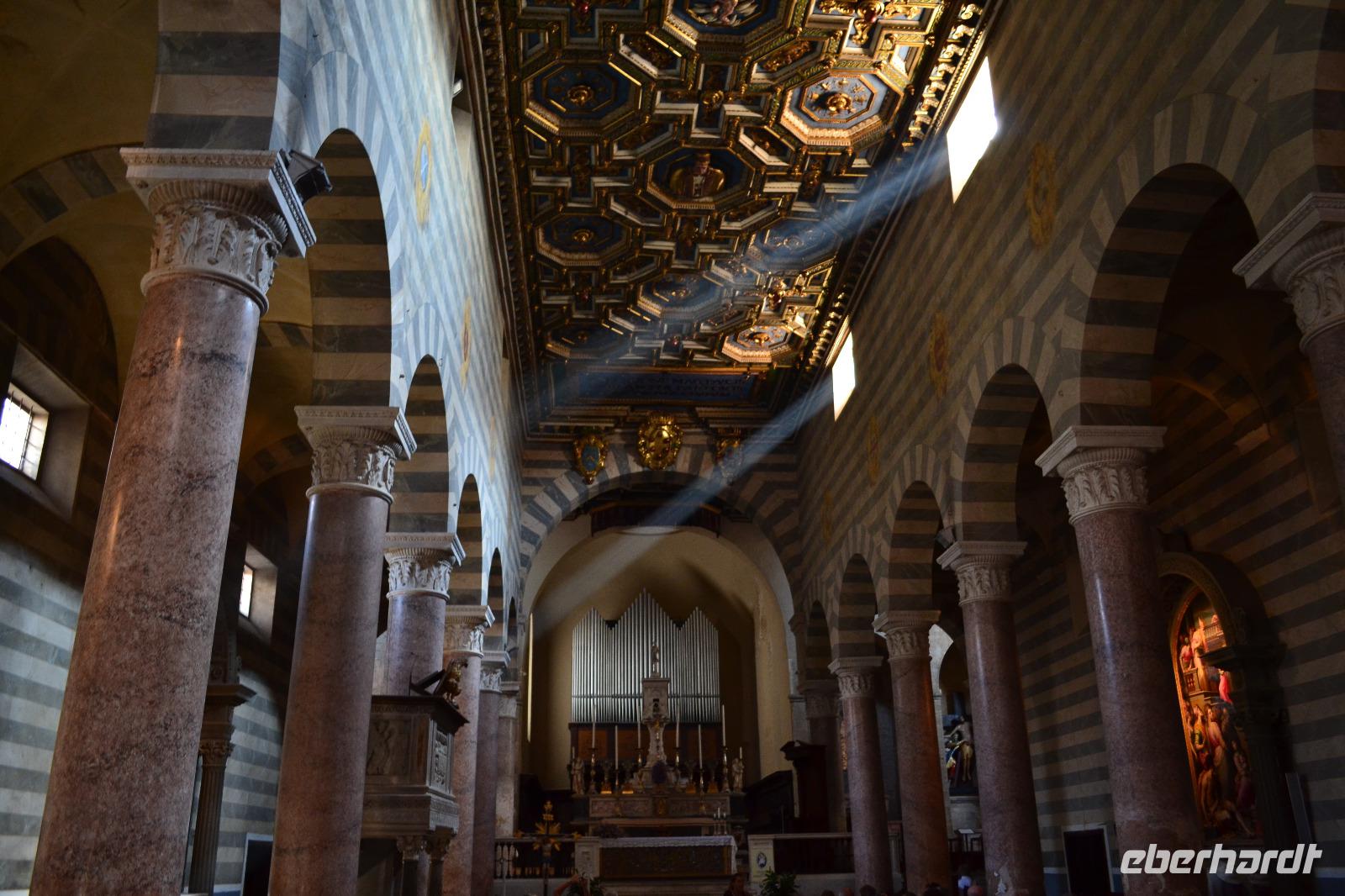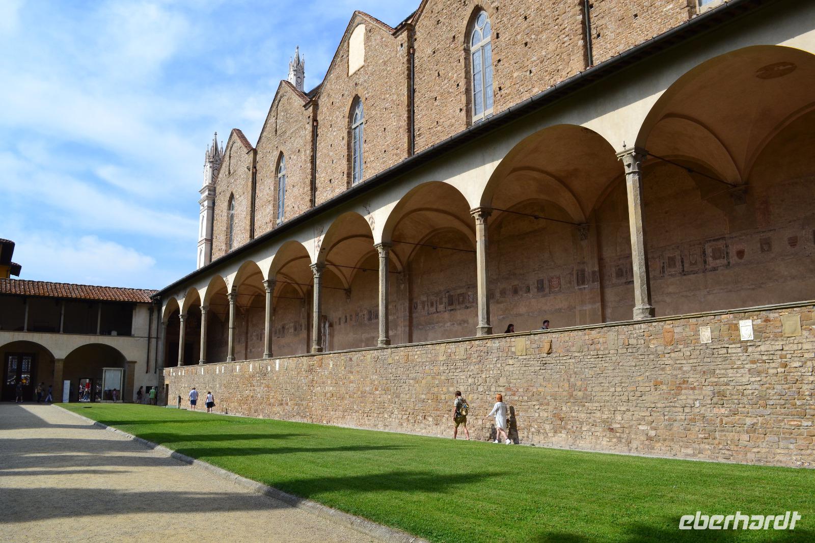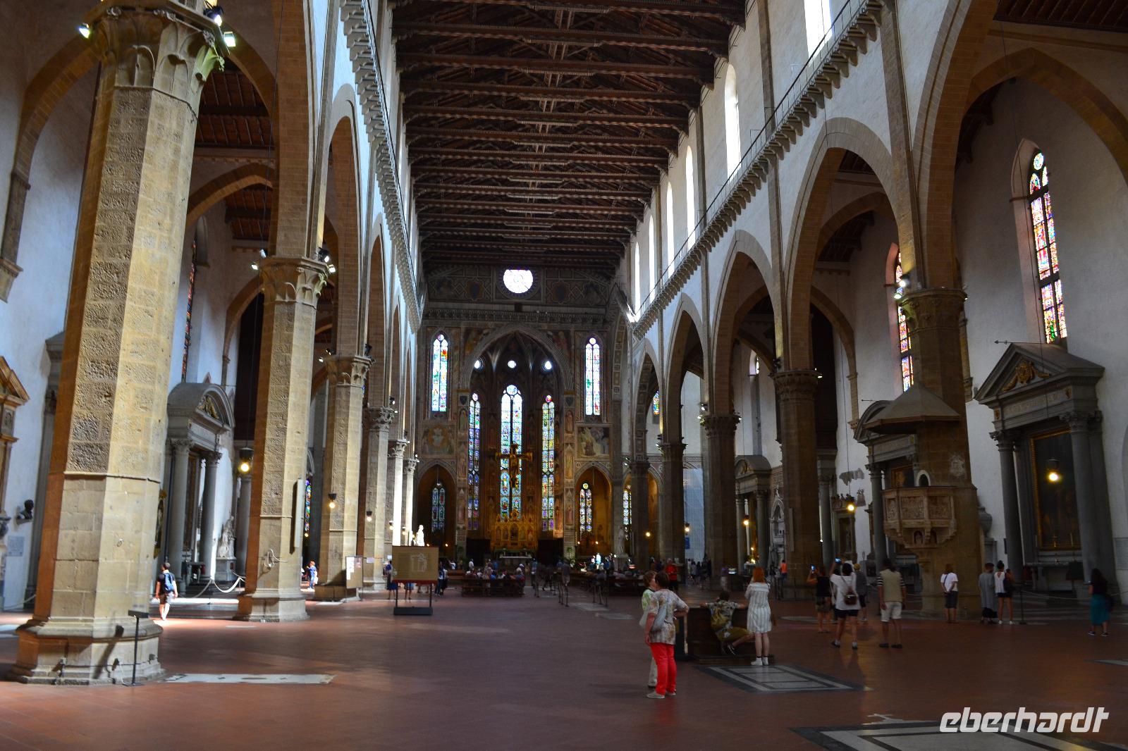 Nach einer Stunde treffen wir uns wieder und spazieren über den Piazza della Repubblica in Richtung Domplatz. Als wir um die Ecke biegen und das Baptisterium, die Fassade der Cattedrale Santa Maria del Fiore und den hoch aufragenden Glockenturm zum ersten Mal vor uns sehen bietet sich uns ein erhabener und überwältigender Anblick. Das bestimmende Element ist natürlich die Kuppel des genialen Architekten Filippo Brunelleschi. Es ist ein Wunder, dass sie überhaupt existiert. Lange Zeit zerbrachen sich die Florentiner den Kopf, wie und ob sie die Kuppel überhaupt erbauen können. Im Wettstreit mit den anderen toskanischen Städten hatten sich die Florentiner etwas übernommen als sie 1296 mit dem Bau begannen und erst Brunelleschi konnte mit einem kühnen Entwurf und viel Überzeugungsarbeit 1436 den Dom vollenden. Der Innenraum ist im Vergleich mit anderen sakralen Bauten der Toskana vielleicht nicht ganz so beeindruckend, imponiert aber durch seine Größe. Anschließend besichtigen wir noch das Franziskanerkloster mit der Kirche Santa Croce, in der sich viele Gräber berühmter Persönlichkeiten befinden, z. B. die Grabmäler Galileo Galileis, Machiavellis und Michelangelos. Von der Hitze etwas geschafft beenden wir unsere Stadtführung und gönnen uns individuell zur Abkühlung ein Eis, bevor wir mit dem Bus zurück nach Montecatini Terme in das Grand Hotel Panoramic fahren.