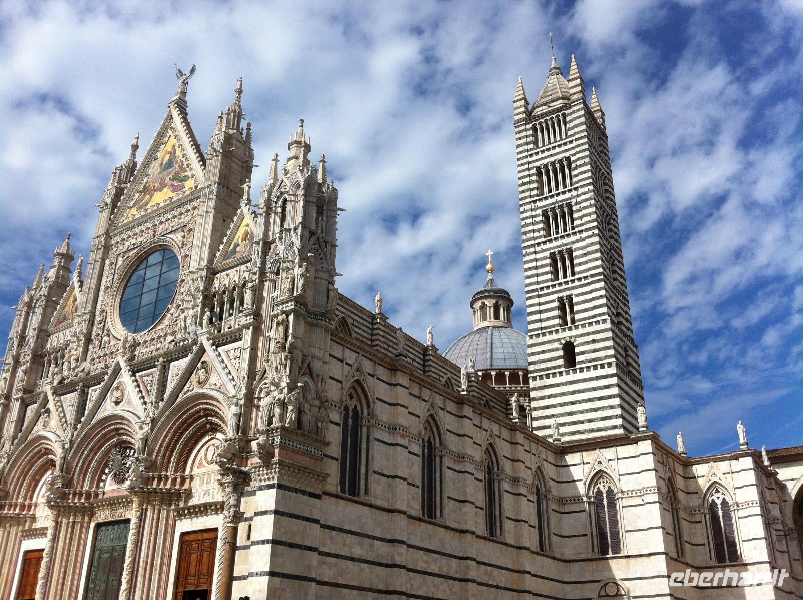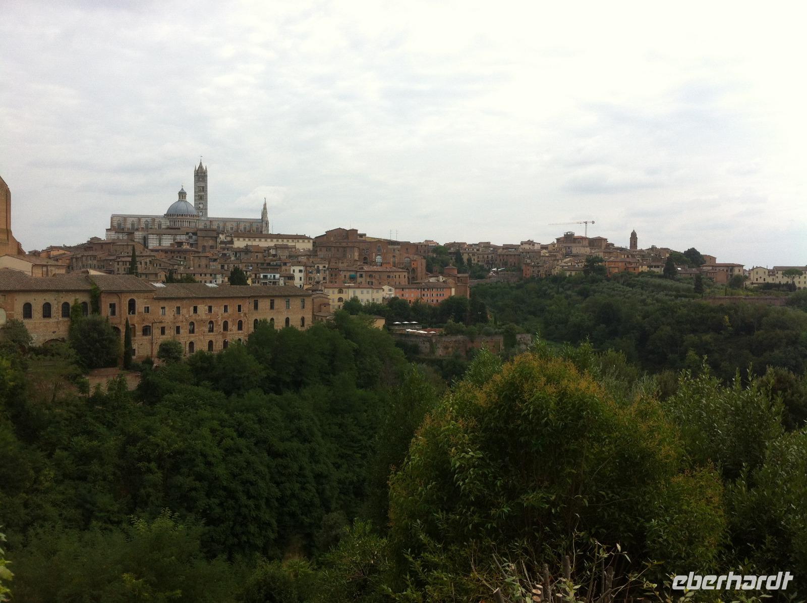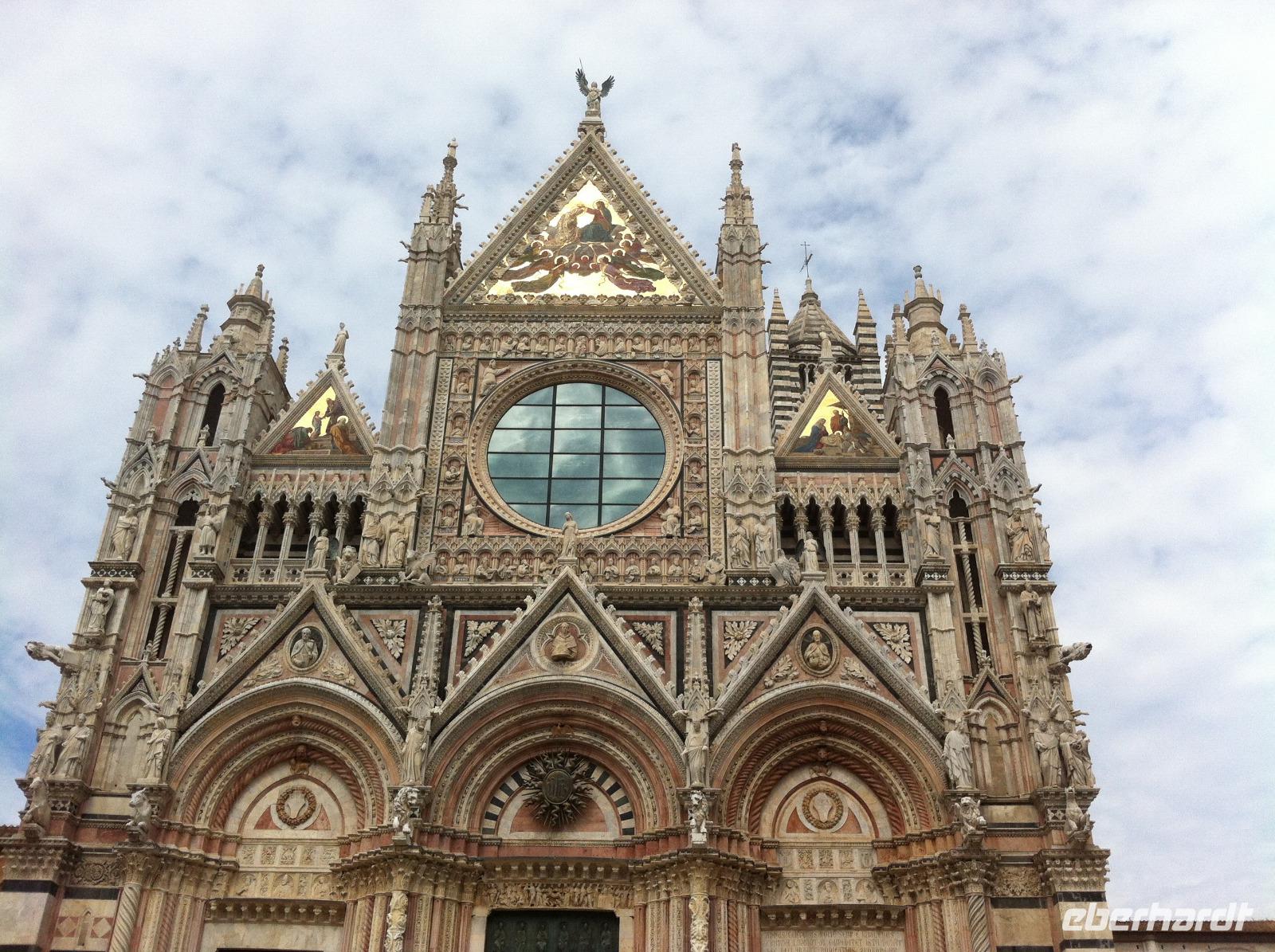 Auf der Fahrt nach Siena bietet sich die Gelegenheit für einen kurzen Mittagsschlaf, auch wenn man dann die reizvolle Landschaft des Chianti-Gebietes verpasst. An der Fortezza Medicea in Siena wartet schon unsere Stadtführerin Susanne, die uns sehr charmant an der Geschichte der Stadt, ihrem Aufstieg, der Rivalität zwischen Siena und Florenz und schließlich ihrer Niederlage, teilhaben lässt. Wir starten an der Basilica Cateriniana und laufen dann gemütlich zum Domplatz. Wir haben Glück und können im Dom auch den Marmorfußboden mit seinen insgesamt 56 Bildern besichtigen, der den Großteil des Jahres aus Konservierungsgründen mit Teppichen abgedeckt ist. Unsere Führung endet im Herzen der Stadt, auf dem Piazza del Campo. Hier findet zweimal im Jahr das berühmte Pferderennen statt, bei dem die verfeindeten Stadtteile heutzutage vor allem um die Ehre kämpfen. Auf einem Bildschirm in einem Café läuft auch ein kurzer Videoclip, der die Atmosphäre vor und während des Rennens sehr gut einfängt. Wir haben etwas Freizeit und laufen dann entspannt zur Festung zurück. Aufgrund eines Verkehrsunfalls müssen wir leider ein bisschen auf unseren Bus warten, aber wir sitzen im Schatten und tragen es mit Fassung.