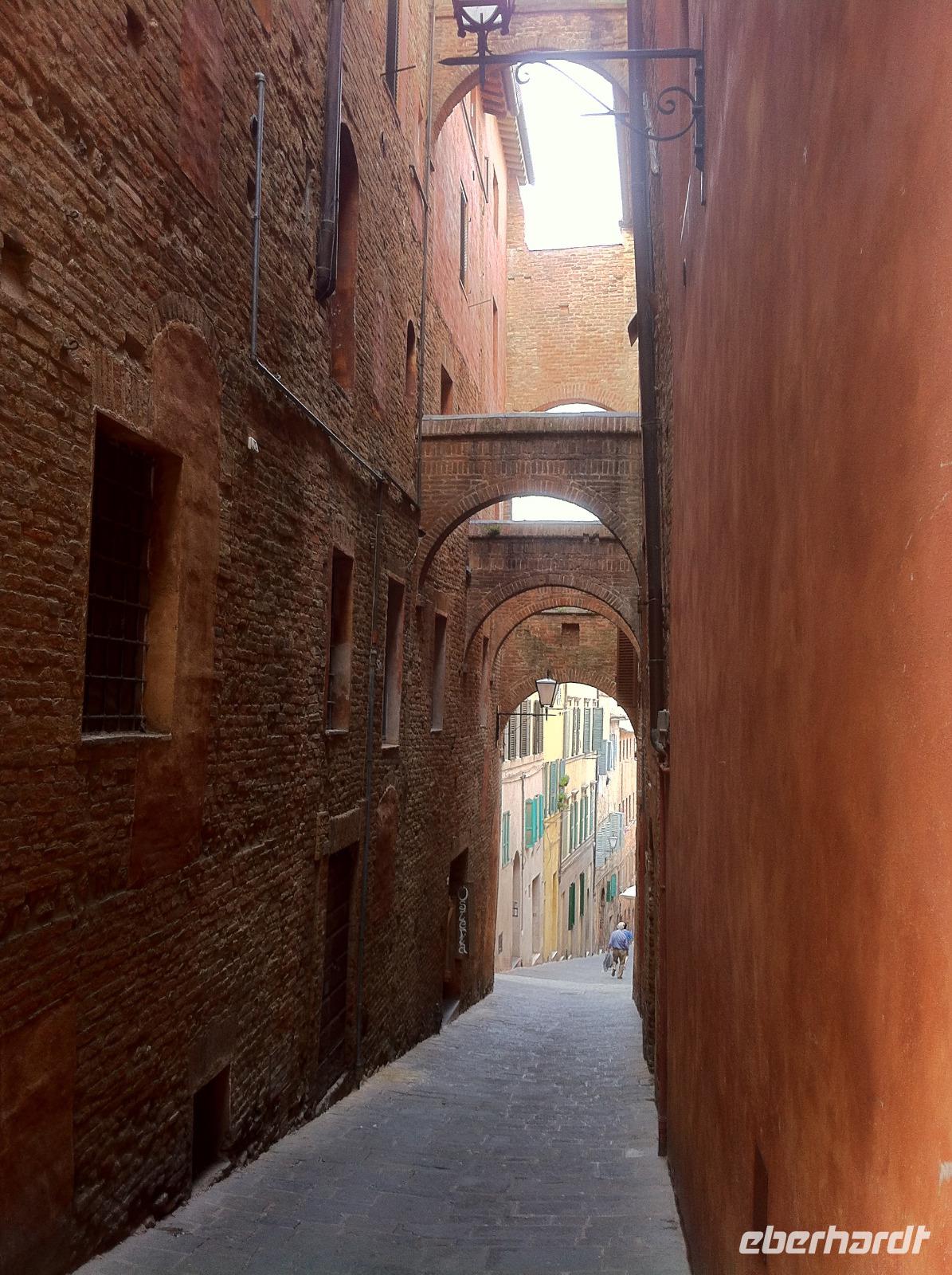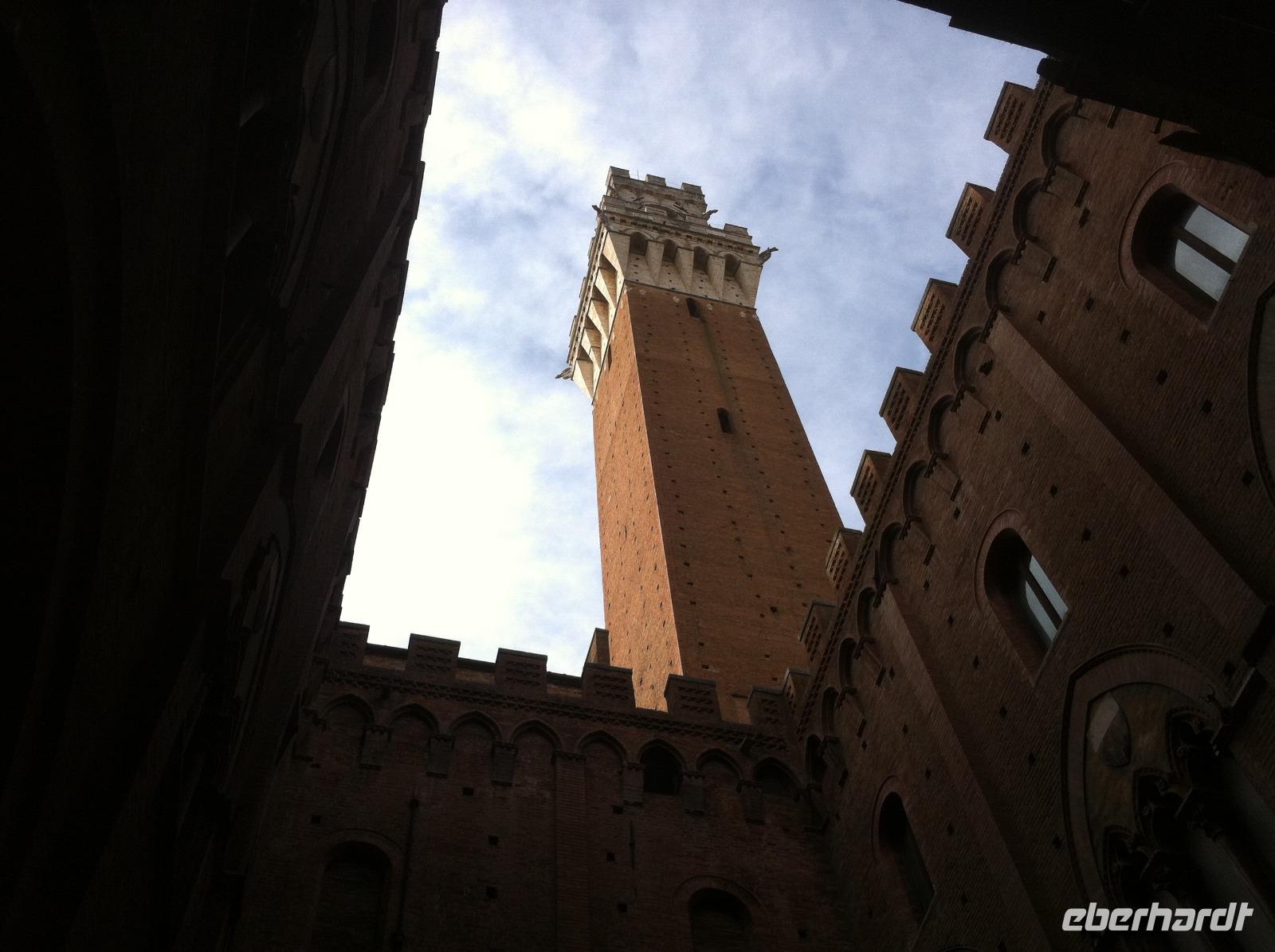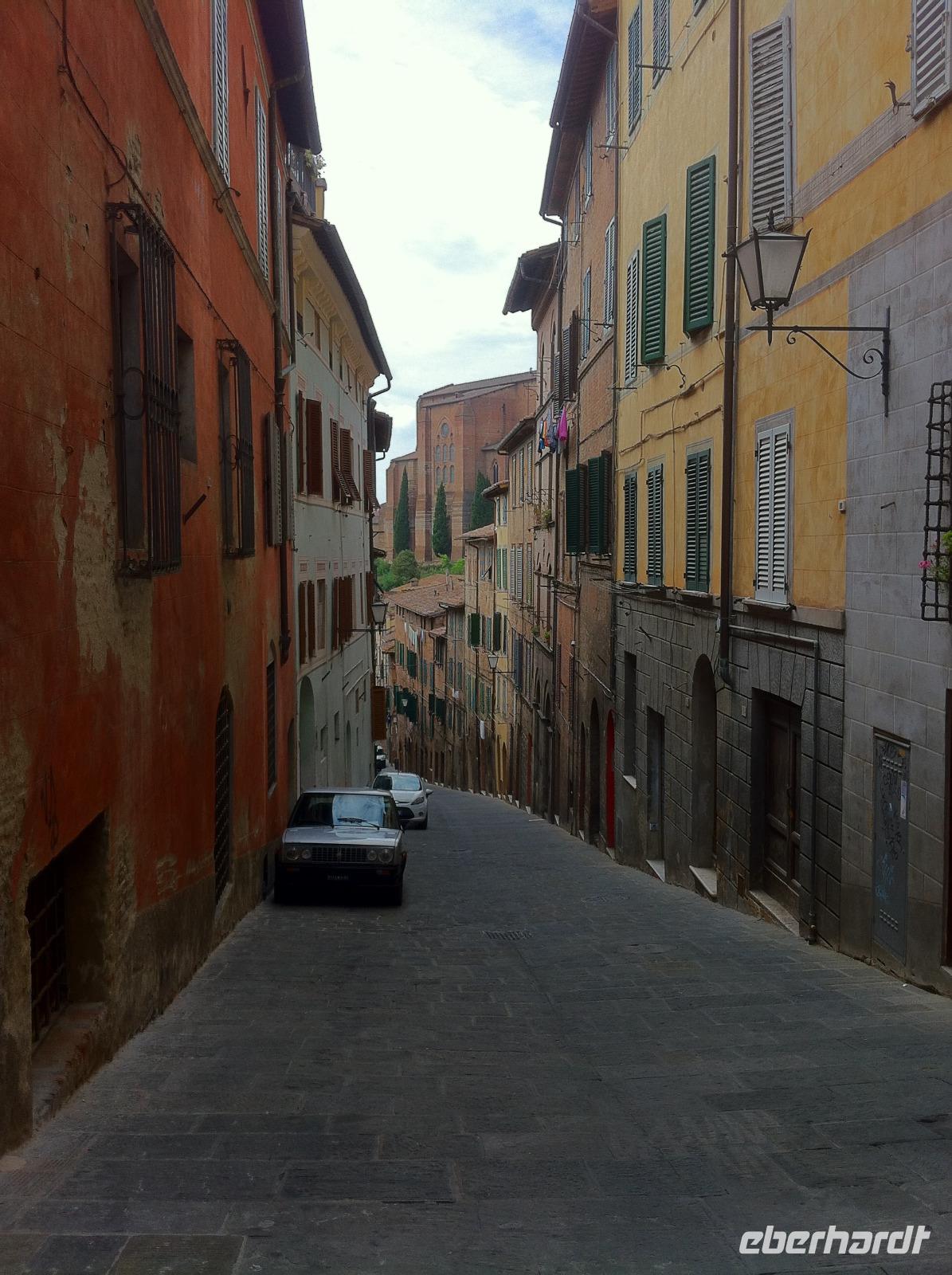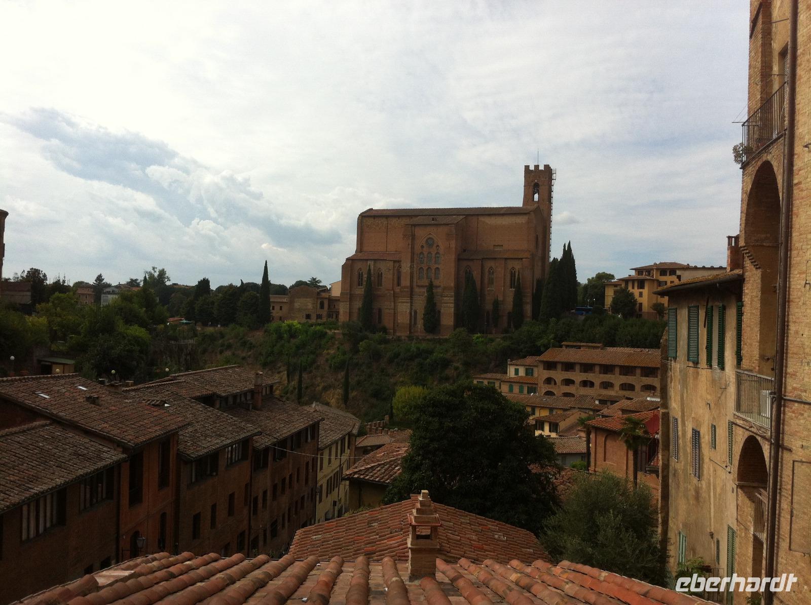 Auf der Fahrt nach Siena bietet sich die Gelegenheit für einen kurzen Mittagsschlaf, auch wenn man dann die reizvolle Landschaft des Chianti-Gebietes verpasst. An der Fortezza Medicea in Siena wartet schon unsere Stadtführerin Susanne, die uns sehr charmant an der Geschichte der Stadt, ihrem Aufstieg, der Rivalität zwischen Siena und Florenz und schließlich ihrer Niederlage, teilhaben lässt. Wir starten an der Basilica Cateriniana und laufen dann gemütlich zum Domplatz. Wir haben Glück und können im Dom auch den Marmorfußboden mit seinen insgesamt 56 Bildern besichtigen, der den Großteil des Jahres aus Konservierungsgründen mit Teppichen abgedeckt ist. Unsere Führung endet im Herzen der Stadt, auf dem Piazza del Campo. Hier findet zweimal im Jahr das berühmte Pferderennen statt, bei dem die verfeindeten Stadtteile heutzutage vor allem um die Ehre kämpfen. Auf einem Bildschirm in einem Café läuft auch ein kurzer Videoclip, der die Atmosphäre vor und während des Rennens sehr gut einfängt. Wir haben etwas Freizeit und laufen dann entspannt zur Festung zurück. Aufgrund eines Verkehrsunfalls müssen wir leider ein bisschen auf unseren Bus warten, aber wir sitzen im Schatten und tragen es mit Fassung.