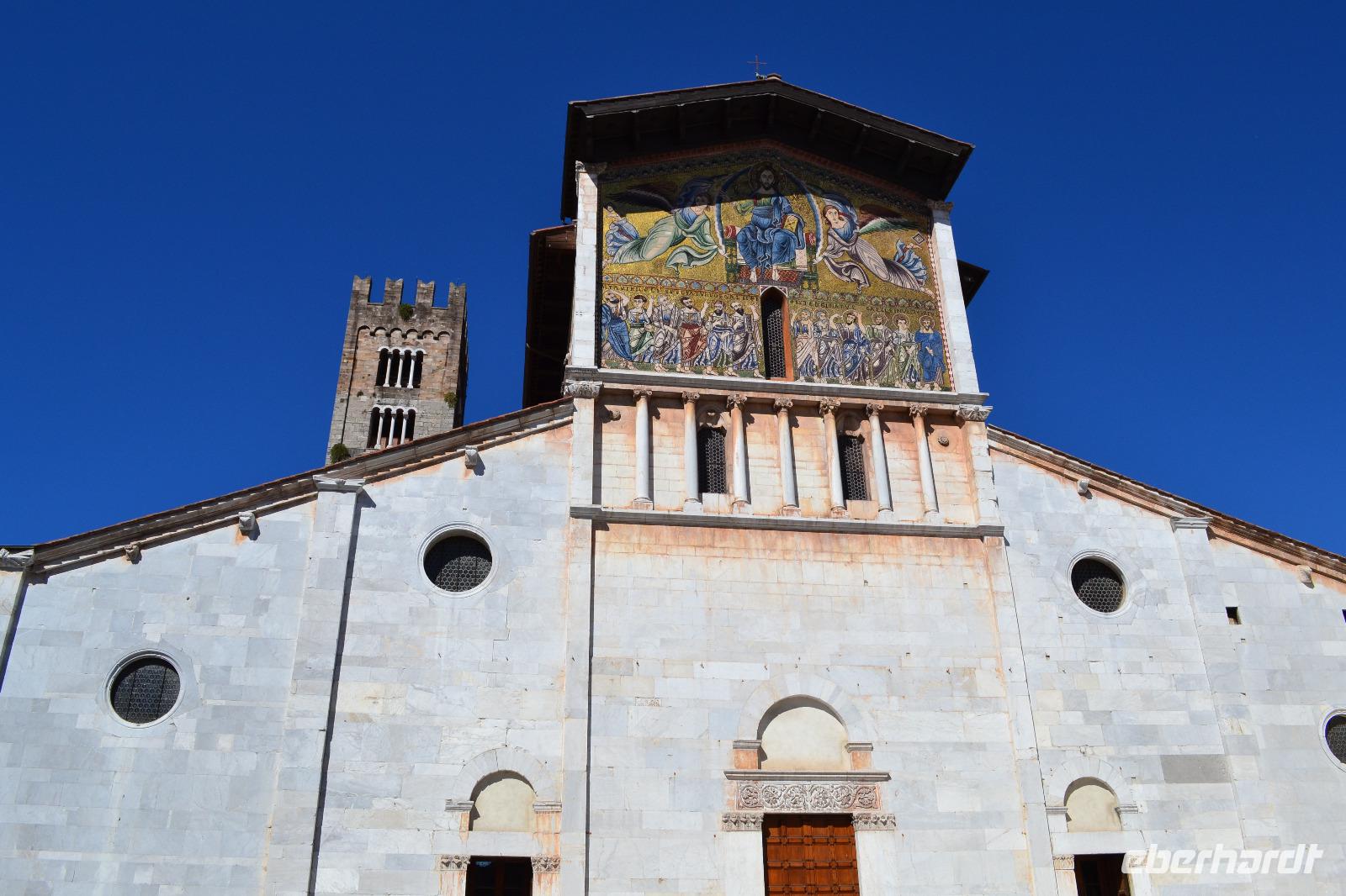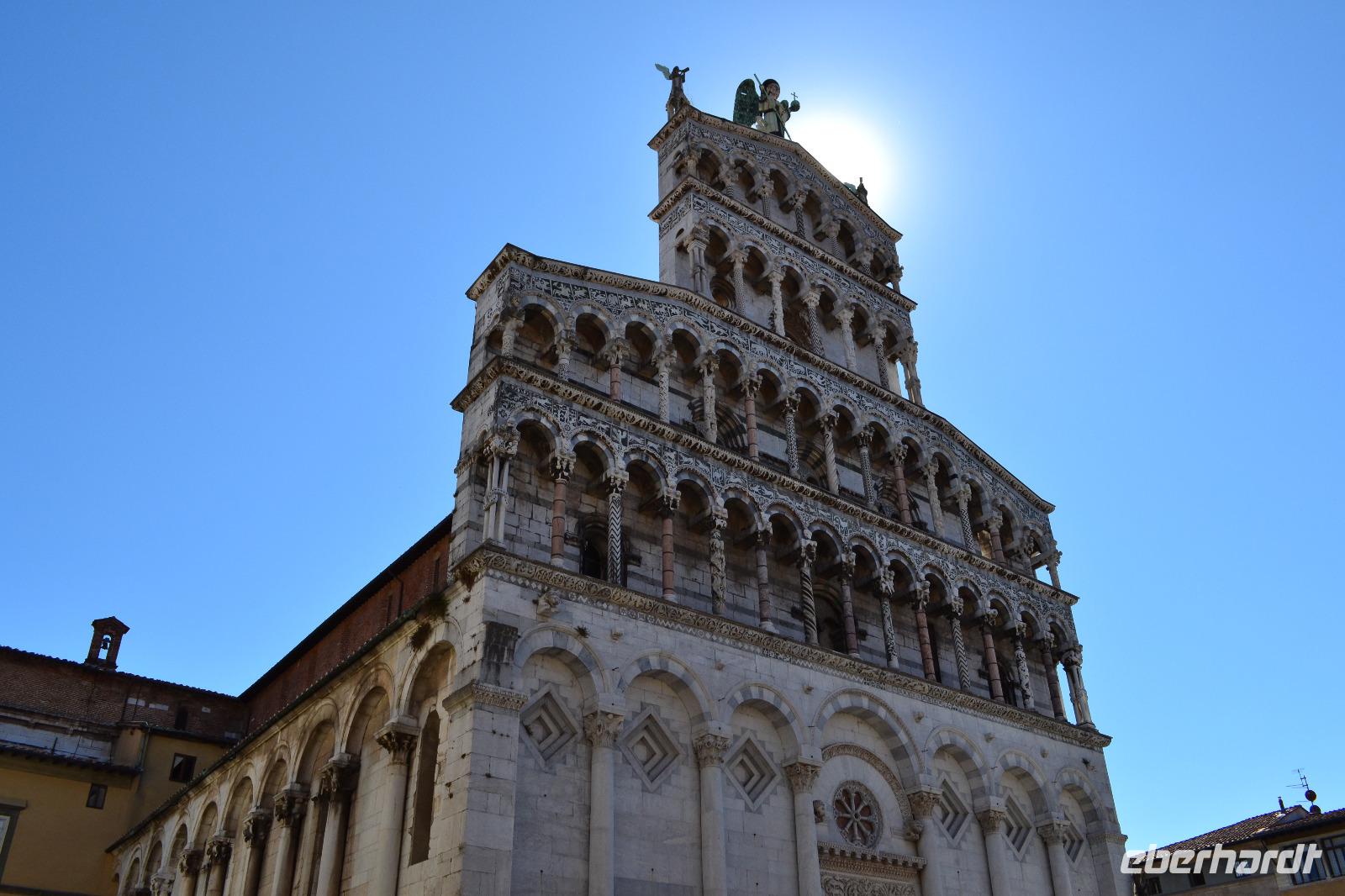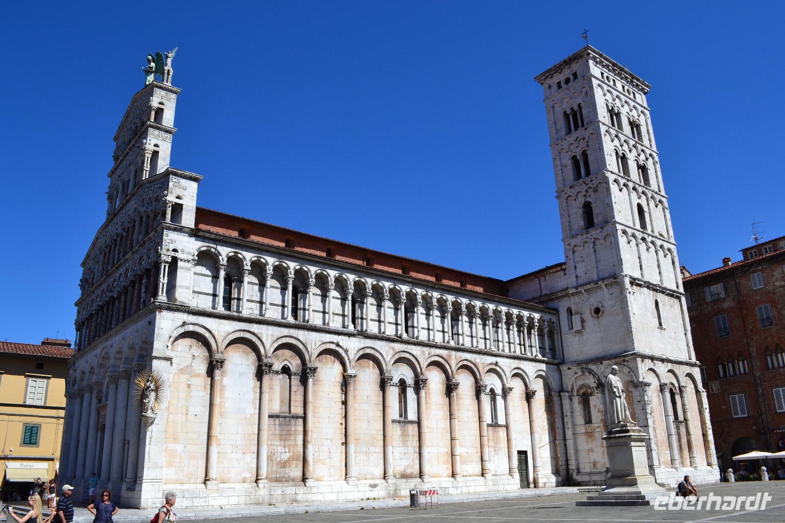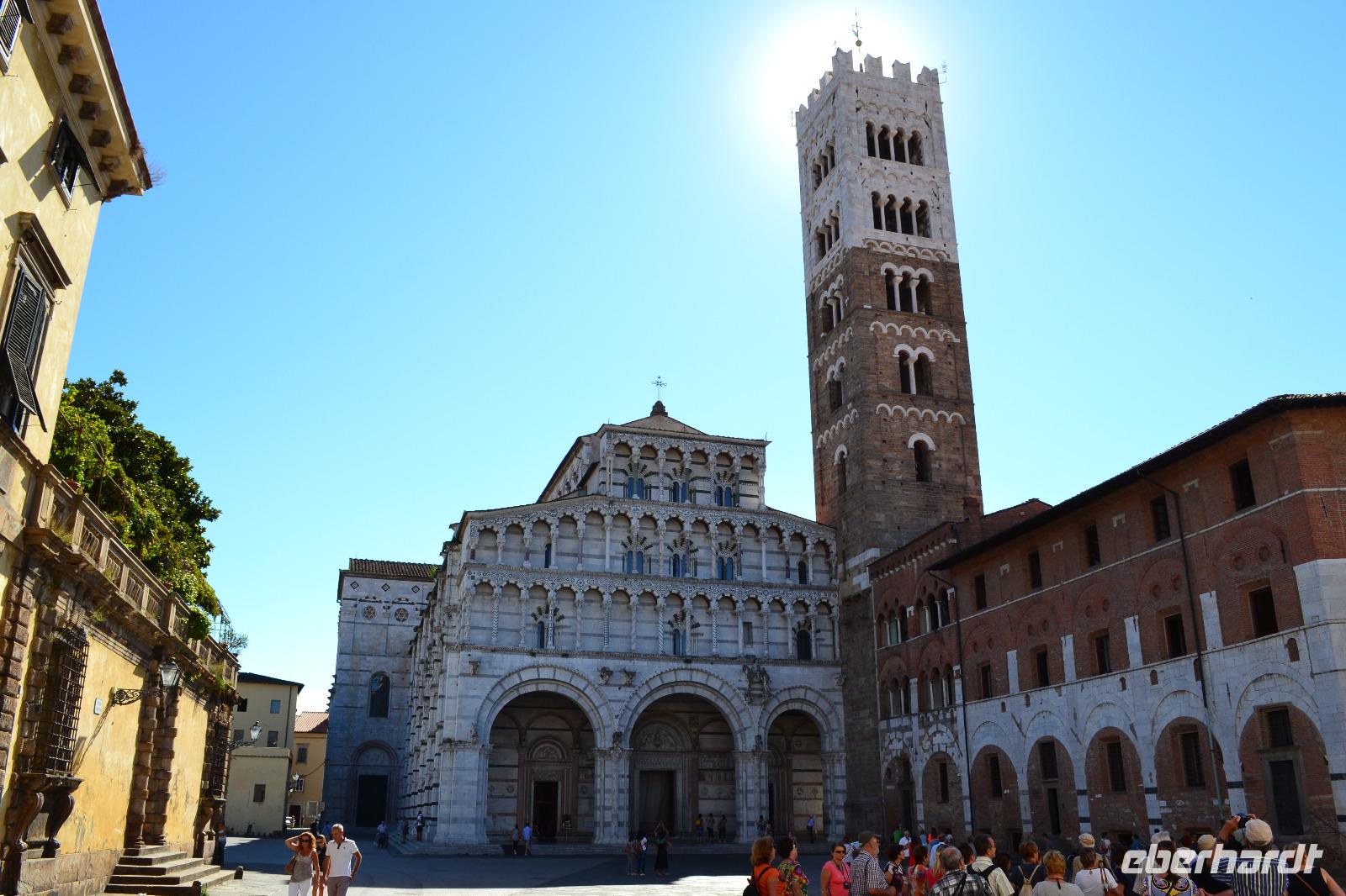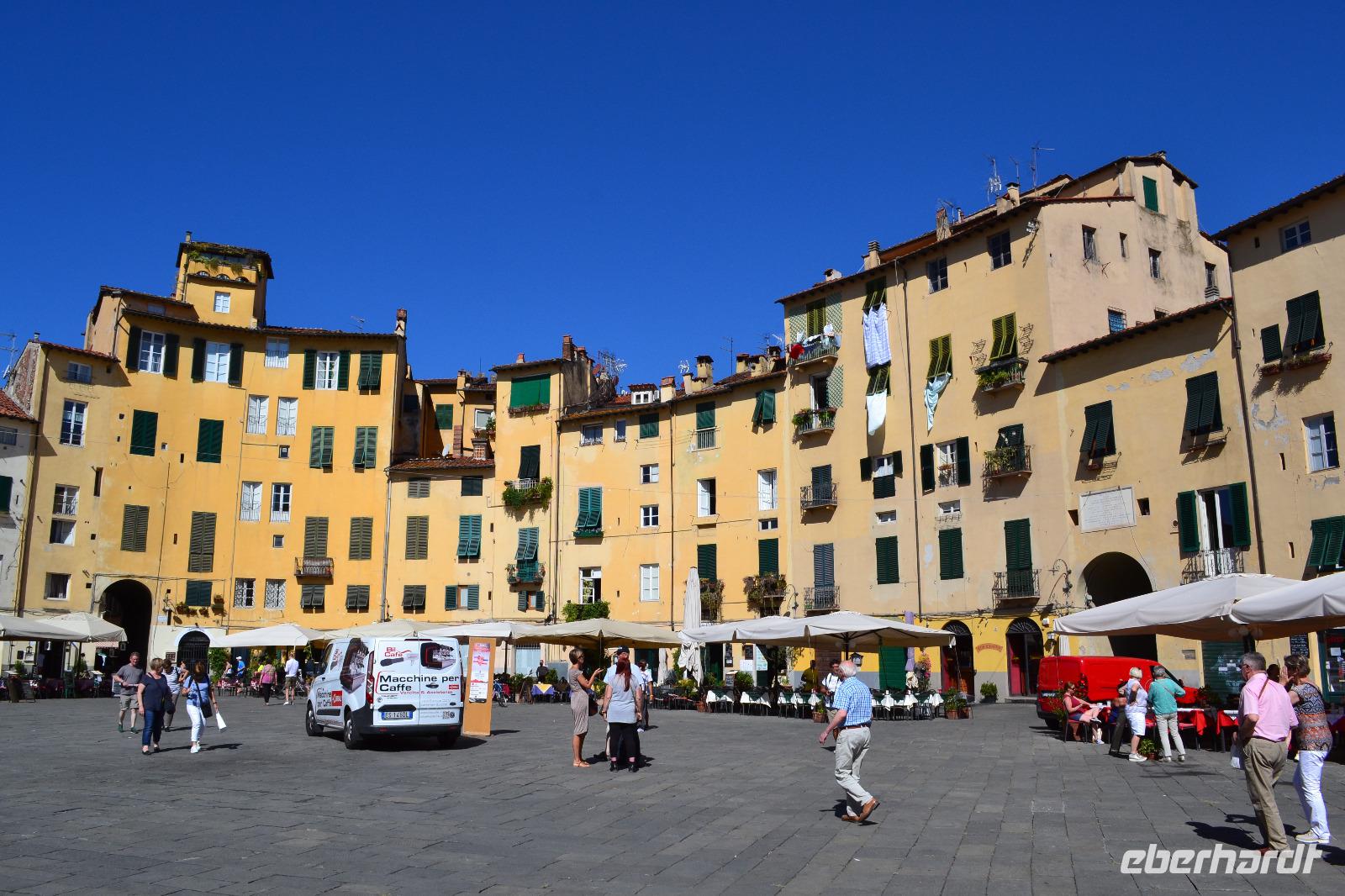 Heute können wir ein bisschen länger schlafen. Auf der Fahrt nach Lucca steigt schon an der nächsten Ausfahrt unsere Stadtführerin Nada zu und legt auch gleich los. Sie ist genauso herzlich und temperamentvoll, wie man sich eine Italienerin vorstellt. In Lucca umfahren wir zunächst die Stadtmauer um uns einen Überblick über die Ausmaße der Altstadt zu verschaffen. Durch das Tor San Pietro betreten wir diese dann zu Fuß. Auf der Stadtmauer befindet sich heute eine von Bäumen gesäumte Allee, die für den motorisierten Verkehr gesperrt ist. Lucca war nicht nur eine Stadt, die sich erfolgreich den Expansionsbestrebungen von Florenz widersetzt hat, sondern zuvor unter den Goten und Langobarden auch Hauptstadt der Toskana. Auch unter Napoleon kam ihr eine wichtige Rolle zu. Wir erkunden den Piazza Napoleone, den Domplatz und den Piazza del Mercato, der auf den Überresten des alten römischen Amphitheaters erbaut wurde und dessen ovale Form widerspiegelt. Am Puccini-Denkmal beenden wir unsere Stadtführung und haben noch gut eine Stunde Freizeit.