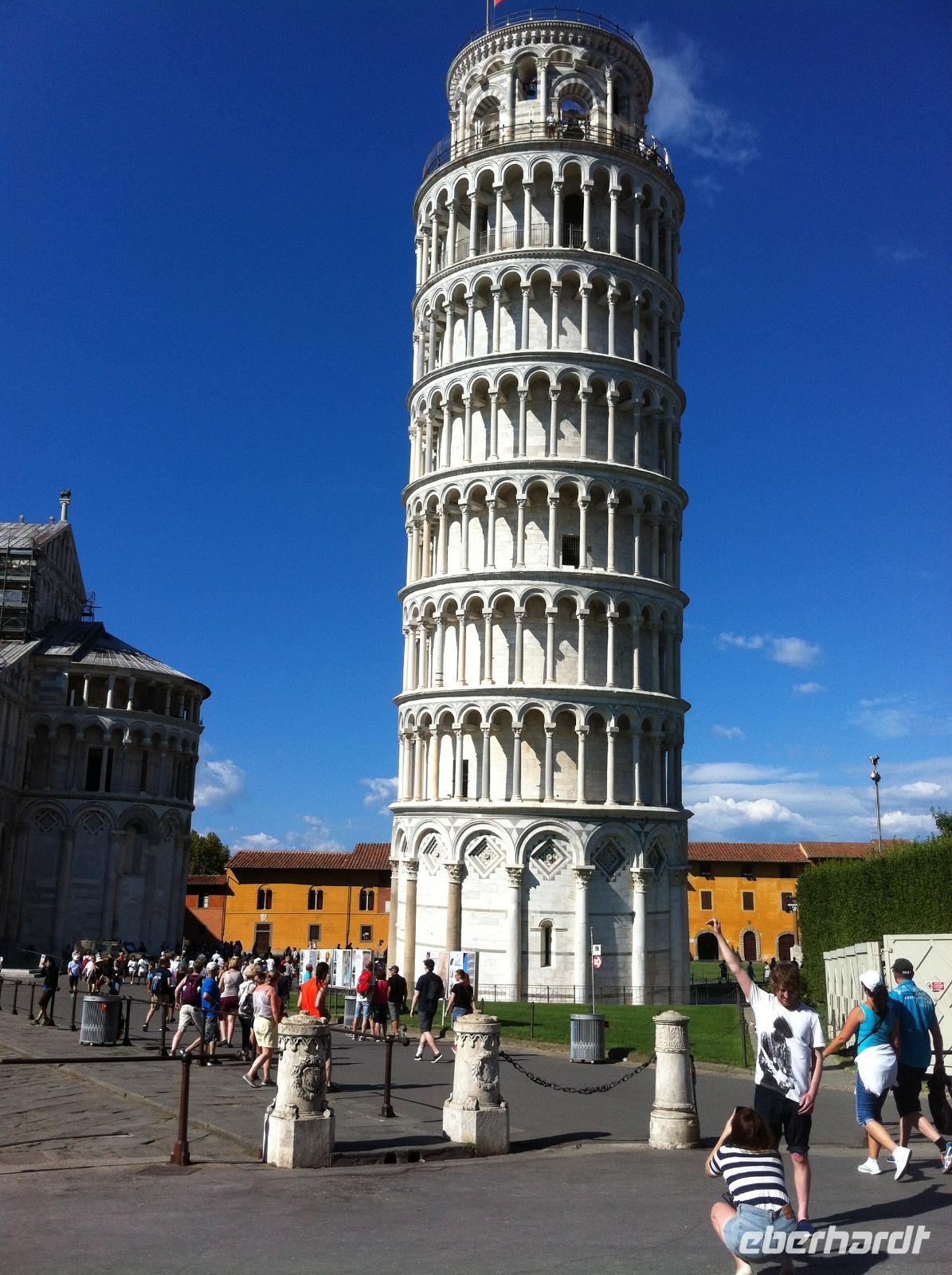 Unser Bus wartet pünktlich 13 Uhr wieder am Tor San Pietro. Wir steigen ein und fahren voller Vorfreude nach Pisa. Die Gäste freuen sich auf den Platz der Wunder mit Dom, Baptisterium und dem weltberühmten "Schiefen Turm", ich auf ein Eisessen mit einer Freundin, die ich seit fast zwei Jahren nicht mehr gesehen habe und die erst vor einer Woche nach Pisa gezogen ist. Die Welt ist klein! Nadas Angebot, auch in Pisa gemeinsam eine kleine Stadtführung zu unternehmen, nehmen die Gäste dankbar an, ebenso den Vorschlag mit der Bimmelbahn vom Busparkplatz ins Zentrum zu fahren. So entkommen wir für eine Weile den sengenden Strahlen der Sonne. Die Temperaturen liegen schließlich immer noch bei über 30 Grad! Während Nada mit den Gästen zu ihrer kleinen Führung aufbricht, besorge ich in der Zwischenzeit die Eintrittskarten für den Campanile bzw. für Dom und Baptisterium. Danach können die Gäste dem Getümmel entfliehen und den Platz der Wunder und auch das Stadtzentrum auf eigene Faust erkunden. Ich hingegen gönne mir ein wohlverdientes Gelato! Zurück in Montecatini Terme unternehme ich mit einigen Gästen vor dem Abendessen noch einen gemütlichen Bummel durch den Kurpark hinunter ins Stadtzentrum.