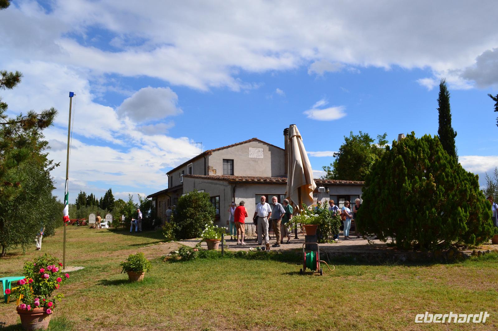 Um uns vom Trubel der Großstadt Florenz zu erholen kehren wir auf einem Weingut in der Nähe von Empoli ein. Der Papa holt uns am Bahnhof in Empoli ab. Die Familie spricht kein Deutsch, wir sprechen kein Italienisch - beste Voraussetzungen für einen lustigen Vormittag. Doch spätestens nach einem Glas Weißwein und bis zu vier gut gefüllten Gläsern Rotwein plus auf Wunsch noch einem Schlückchen Dessertwein spielt die Sprachbarriere keine Rolle mehr. Unsere Gastgeber lassen sich wahrlich nicht lumpen und tischen toskanisches Brot mit Olivenöl, Salami, Prosciutto und Käse auf. Gut gelaunt heißt es nach der Verkostung Aufstellung nehmen zum Gruppenfoto vor einer herrlichen Kulisse. Als Gott die Erde erschuf, hat er sich die schönsten Hügel für die Toskana aufgehoben. Auch die Mama kommt mit aufs Bild. Zurück im Bus besteht dann kein Bedarf an Würstchen mehr, alle sind satt und glücklich.
