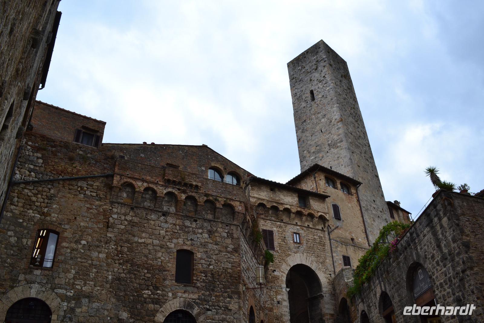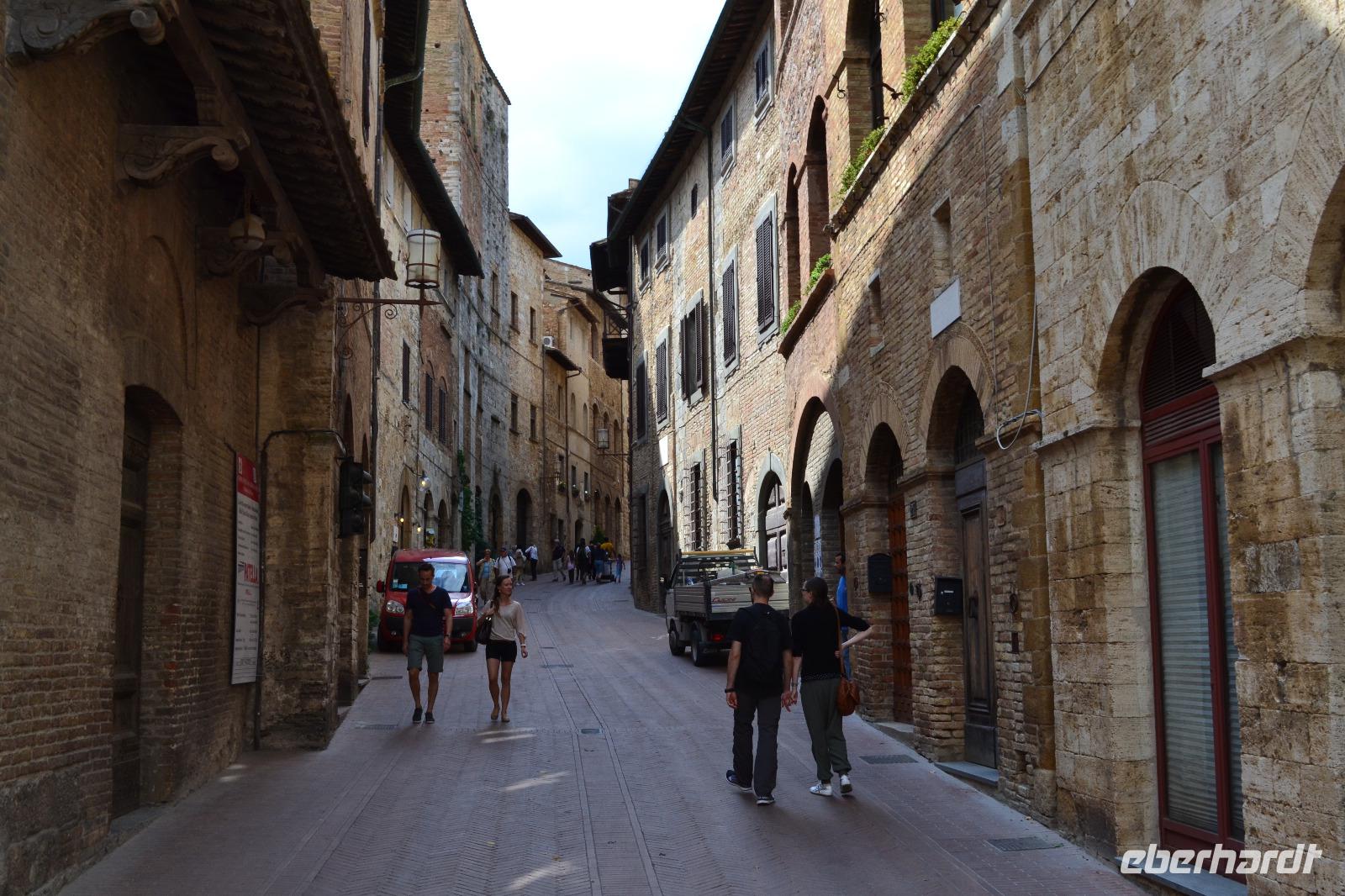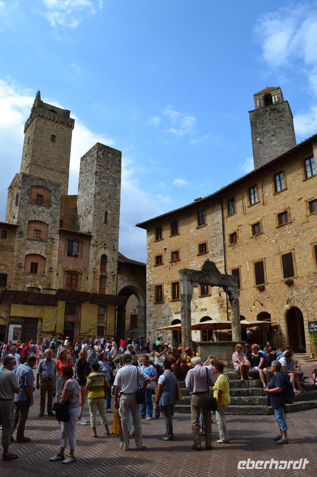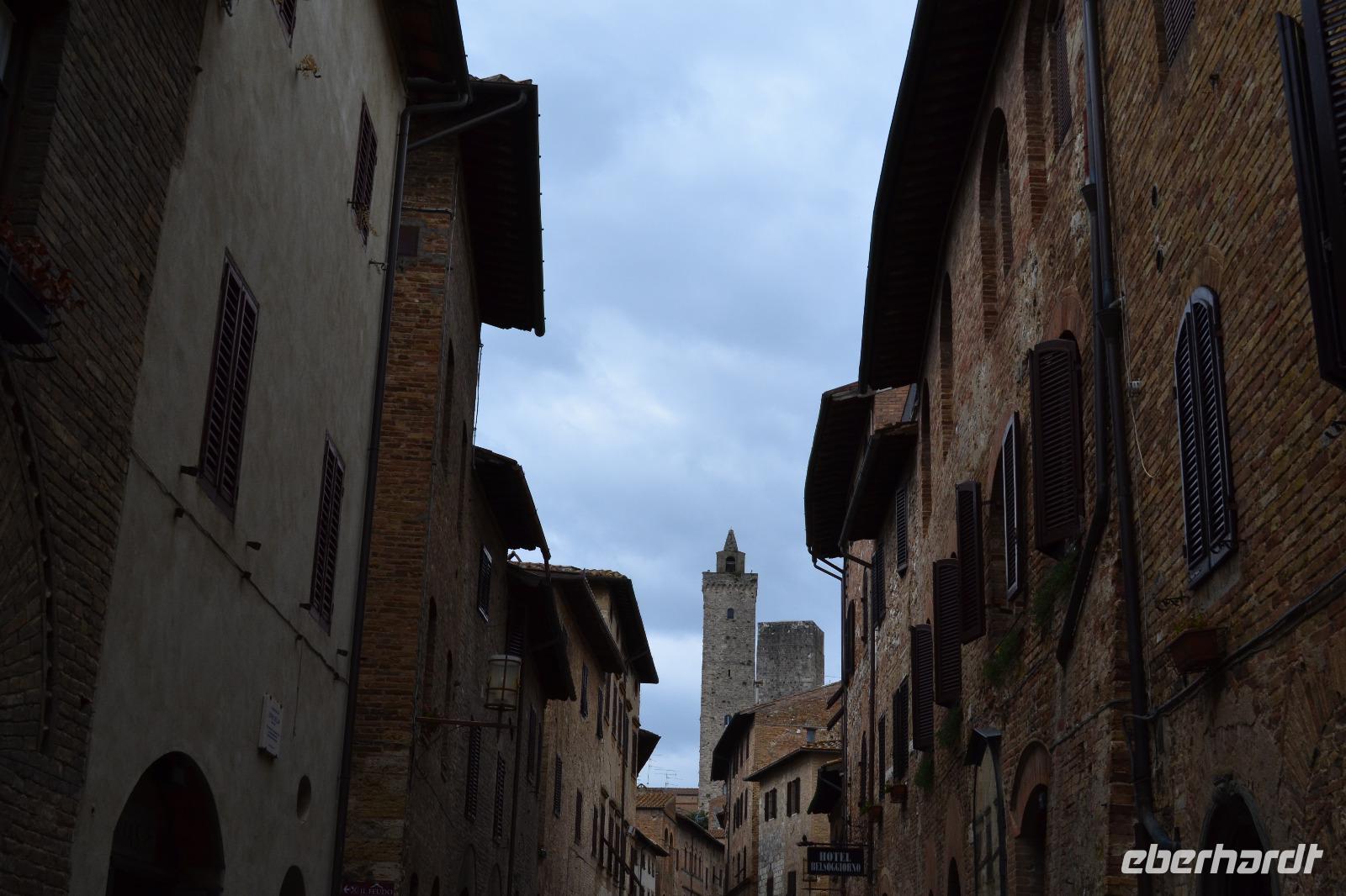 Am Nachmittag fahren wir dann schließlich hinauf nach San Gimignano. Auf dem Busparkplatz treffen wir Nada wieder, die gerade eine Führung mit einer anderen Reisegruppe hinter sich hat. Und dann kommt auch schon Susanne, unserer Stadtführerin aus Siena, und wir können mit der Besichtigung beginnen. Ich habe allerdings die Vermutung, dass in Wirklichkeit alle nur das Gelato des "Weltmeisters" testen wollen, der auf dem Hauptplatz von San Gimignano seine Eisdiele betreibt. (Wie wir von ihm später persönlich erfahren, lebt seine Tochter im Waldstraßenviertel in Leipzig. Die Welt ist ein Dorf!) Aber zuerst genießen wir den Blick von der Stadtmauer auf das malerische Umland, werfen einen Blick in das alte Gefängnis und lassen unsere Blicke vor allem immer wieder nach oben schweifen, hinauf zu den Geschlechtertürmen, die von einer lange vergangenen Zeit zeugen, als die Familien von San Gimignano unvorstellbar reich und mächtig gewesen sind. Nach der Eroberung durch Florenz ist die Zeit in diesem Städtchen 1563 stehengeblieben, als Großherzog Cosimo I. de' Medici erließ, dass kein noch so geringer Betrag mehr in San Gimignano investiert werden dürfe. Um 17 Uhr müssen wir das "Manhattan des Mittelalters" wieder verlassen, besteigen den Bus und fahren an die Küste des Tyrrhenischen Meeres, wo wir in Marina di Grosseto im Grand Hotel Terme Marine Leopoldo II unser Quartier für die nächsten drei Tage beziehen.