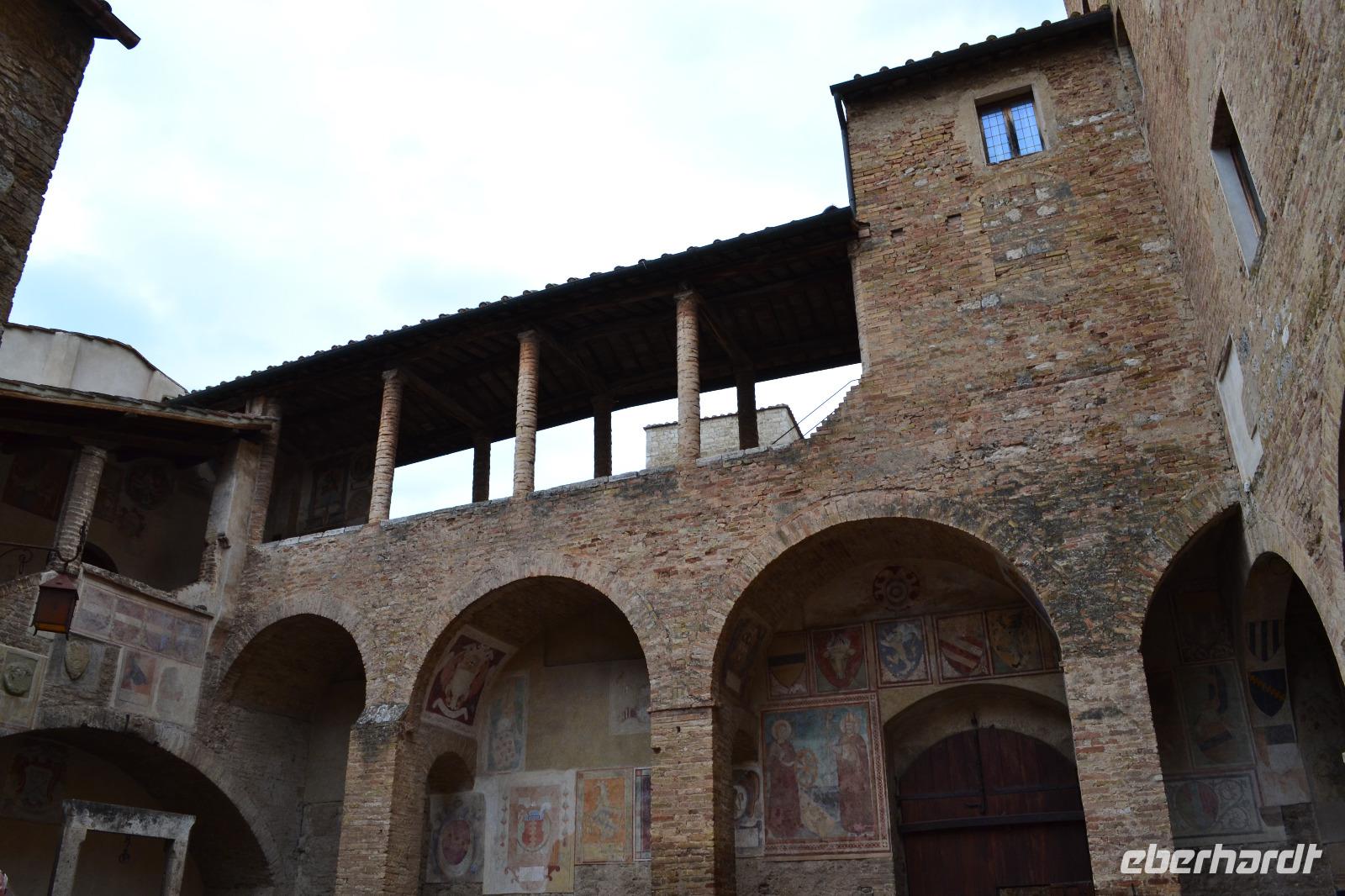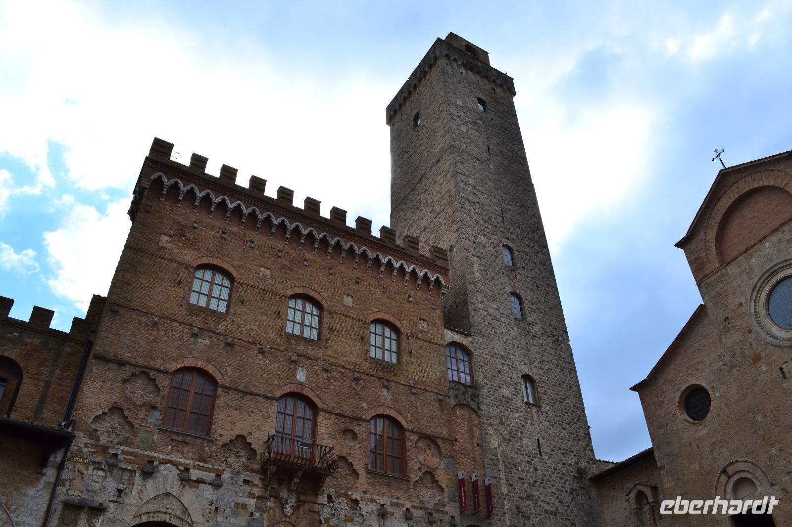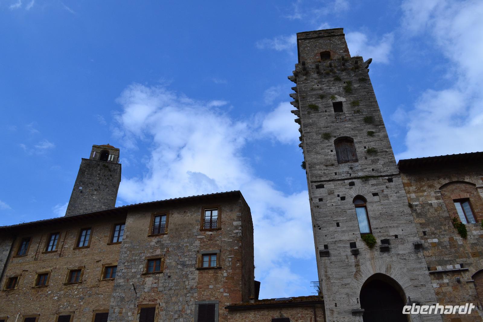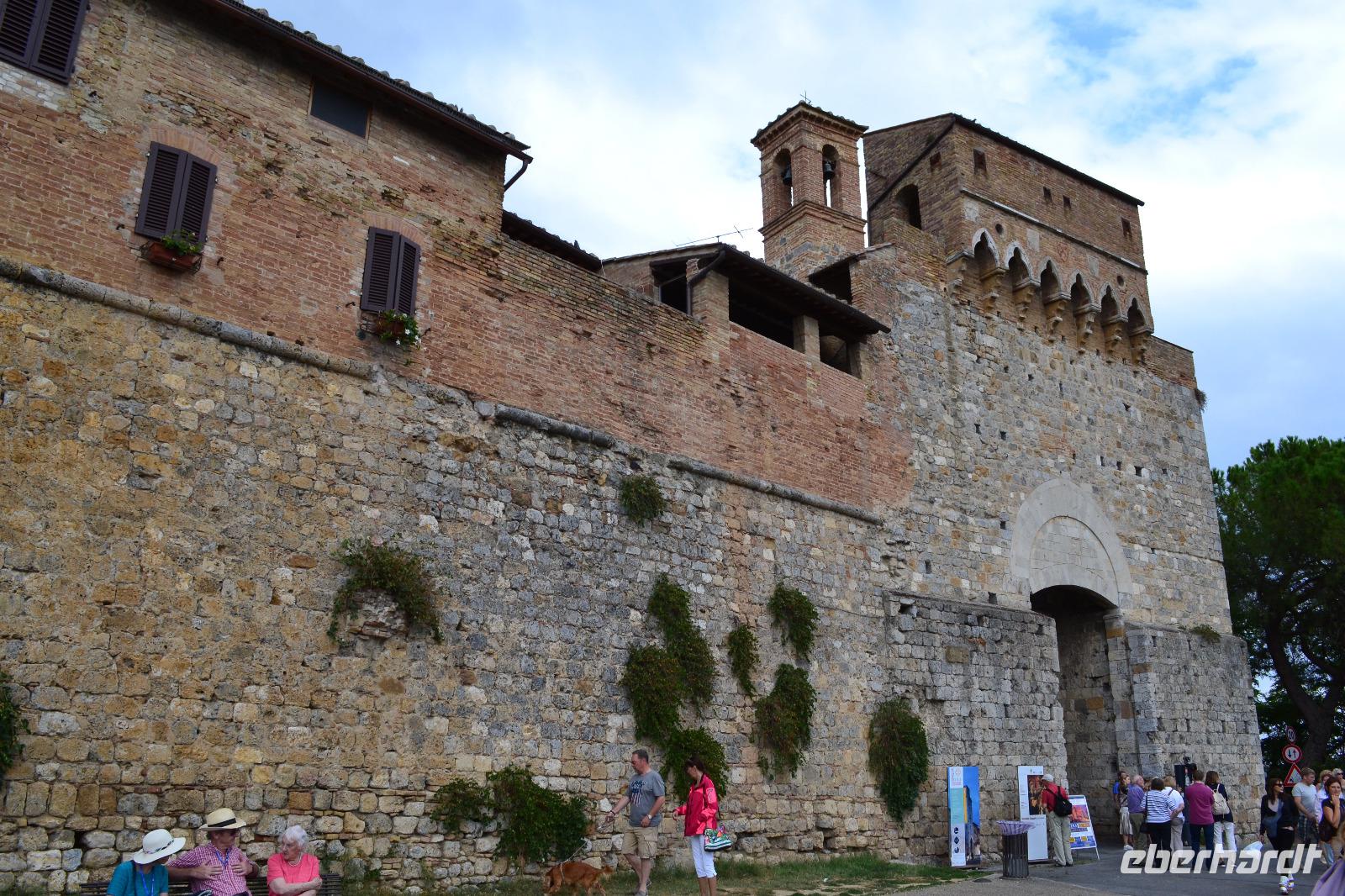 Am Nachmittag fahren wir dann schließlich hinauf nach San Gimignano. Auf dem Busparkplatz treffen wir Nada wieder, die gerade eine Führung mit einer anderen Reisegruppe hinter sich hat. Und dann kommt auch schon Susanne, unserer Stadtführerin aus Siena, und wir können mit der Besichtigung beginnen. Ich habe allerdings die Vermutung, dass in Wirklichkeit alle nur das Gelato des "Weltmeisters" testen wollen, der auf dem Hauptplatz von San Gimignano seine Eisdiele betreibt. (Wie wir von ihm später persönlich erfahren, lebt seine Tochter im Waldstraßenviertel in Leipzig. Die Welt ist ein Dorf!) Aber zuerst genießen wir den Blick von der Stadtmauer auf das malerische Umland, werfen einen Blick in das alte Gefängnis und lassen unsere Blicke vor allem immer wieder nach oben schweifen, hinauf zu den Geschlechtertürmen, die von einer lange vergangenen Zeit zeugen, als die Familien von San Gimignano unvorstellbar reich und mächtig gewesen sind. Nach der Eroberung durch Florenz ist die Zeit in diesem Städtchen 1563 stehengeblieben, als Großherzog Cosimo I. de' Medici erließ, dass kein noch so geringer Betrag mehr in San Gimignano investiert werden dürfe. Um 17 Uhr müssen wir das "Manhattan des Mittelalters" wieder verlassen, besteigen den Bus und fahren an die Küste des Tyrrhenischen Meeres, wo wir in Marina di Grosseto im Grand Hotel Terme Marine Leopoldo II unser Quartier für die nächsten drei Tage beziehen.