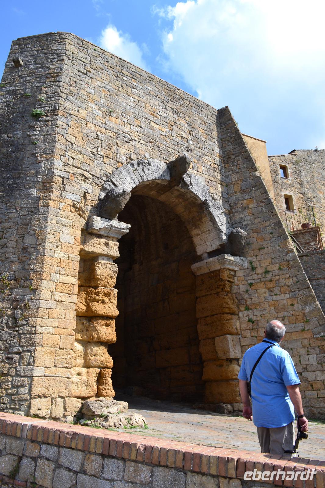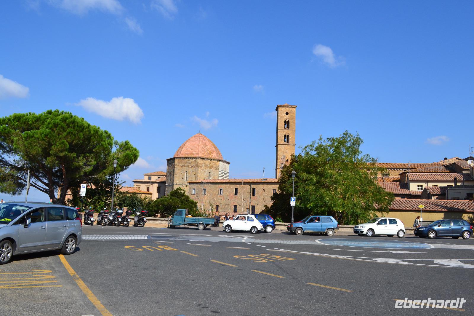 Auch heute geht es wieder recht hoch hinaus, denn die Stadt Volterra thront auf einem Hügel 550 m über dem Tal. Dementsprechend ist die Aussicht. Unsere Stadtführerin Bettina zeigt uns den Hauptplatz mit dem ersten Rathaus der Toskana, den Dom und das Baptisterium. Danach laufen wir ein Stück hinunter zum Etruskertor. Es ist eines der wenigen Zeugnisse aus der Herrschaftszeit dieses geheimnisvollen Volkes, das die Toskana lange vor den Römern beherrschte und einen Großteil des Mittelmeeres kontrollierte. Letztendlich verweist ja auch der Name "Toskana" auf die Etrusker. Interessant sind auch die Ruinen des römischen Amphitheaters und der Thermen. Heute ist Volterra vor allem als Zentrum der Alabasterverarbeitung bekannt. Überall finden sich kleine Werkstätten und Läden. Nach der Mittagspause fahren wir nach Marina di Grosseto zurück, wo die Gäste den Nachmittag zur freien Verfügung haben.