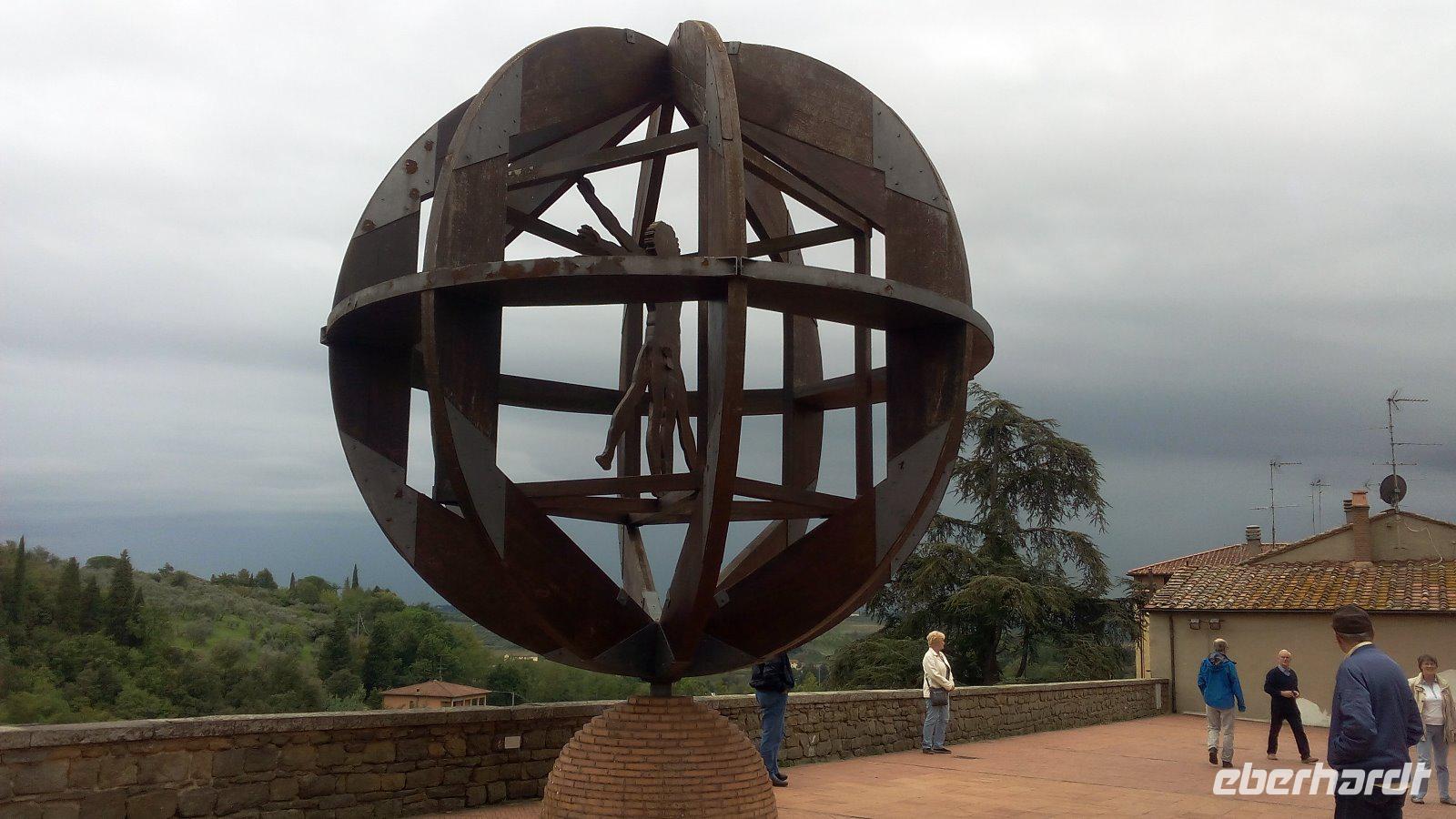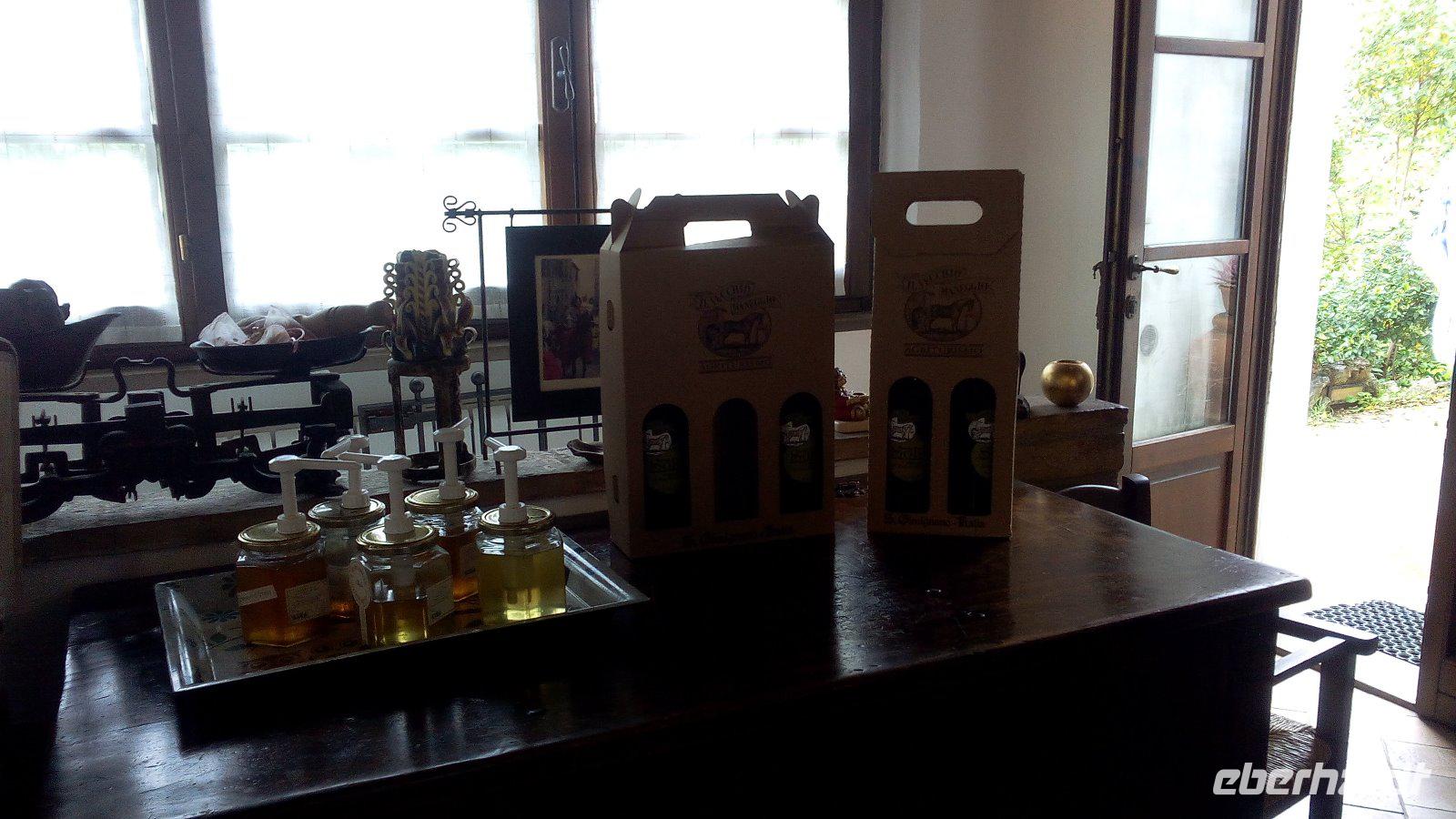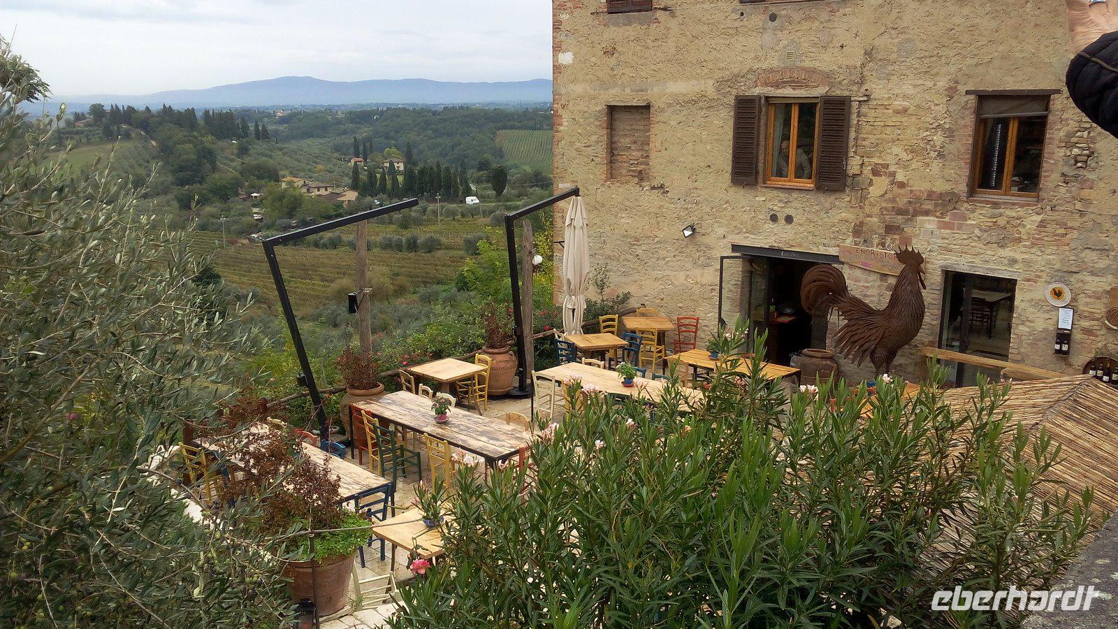 Heute ist es so weit. Endlich fahren wir in eine Region, in der es die typische (die wir von Bildern kennen) Toskana gibt. Zeitig machen wir uns auf die Beine und fahren in Richtung Empoli. Wir haben Zeit und planen zuvor einen Abstecher nach Vinci, nach dem sich das Universalgenie Leonardo benannte, auch wenn er im benachbarten Anchiano geboren wurde. An der mittelalterlichen Burg, in der sich das Museo Leonardo befindet, legen wir eine einen Fotostopp ein. Nun aber weiter nach Empoli. Zwischenzeitlich drängt die Zeit. Am Bahnhof wartet schon ein Familienmitglied des familiengeführten Bauernhofs und möchte uns abholen. Wir fahren ein Stück aus der Stadt , Richtung Siena und erleben das Wein- und Olivenöl- Anbaugebiet. Leider regnet es immer wieder und trotzdem gelingen einige Fotos auf der Terrasse des Hauses. Nach dem uns alle Generationen der Familie begrüßt haben beginnen wir mit der Weinverkostung. Die unterschiedlichen guten Weine heben die Stimmung. Wir probieren aber auch das Olivenöl, Brot, Schinken, Wurst und Käse. Alles bestens!