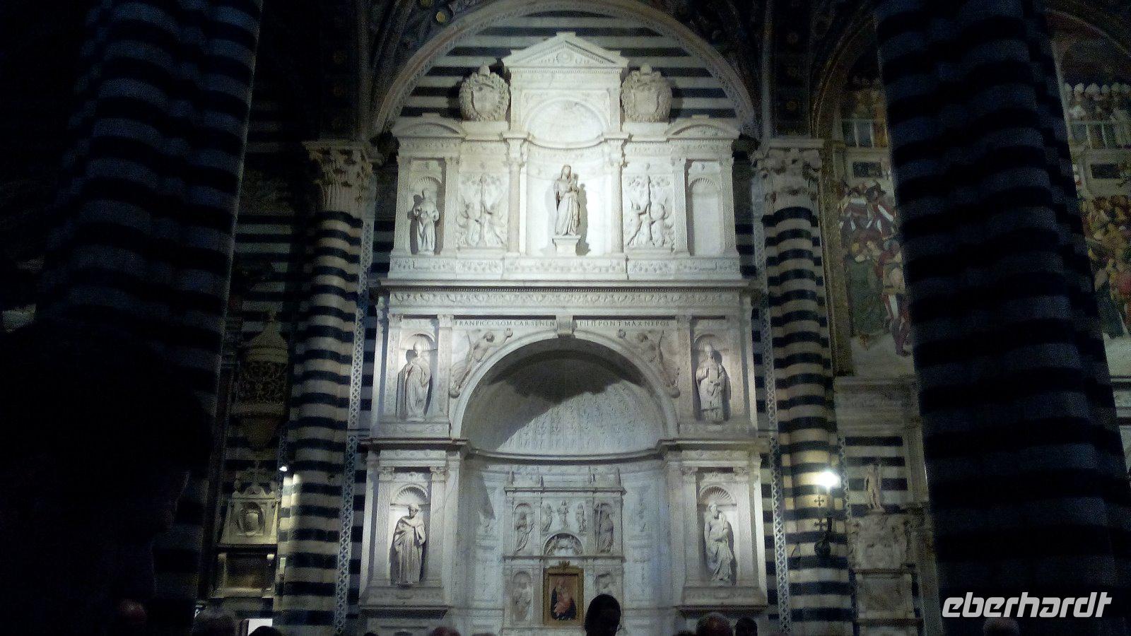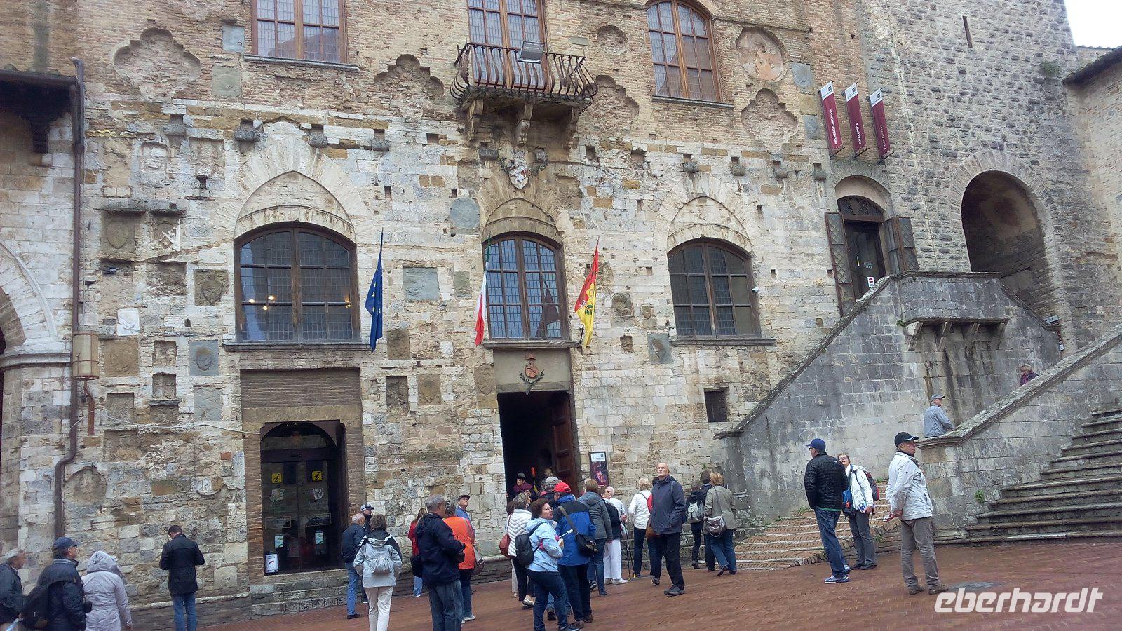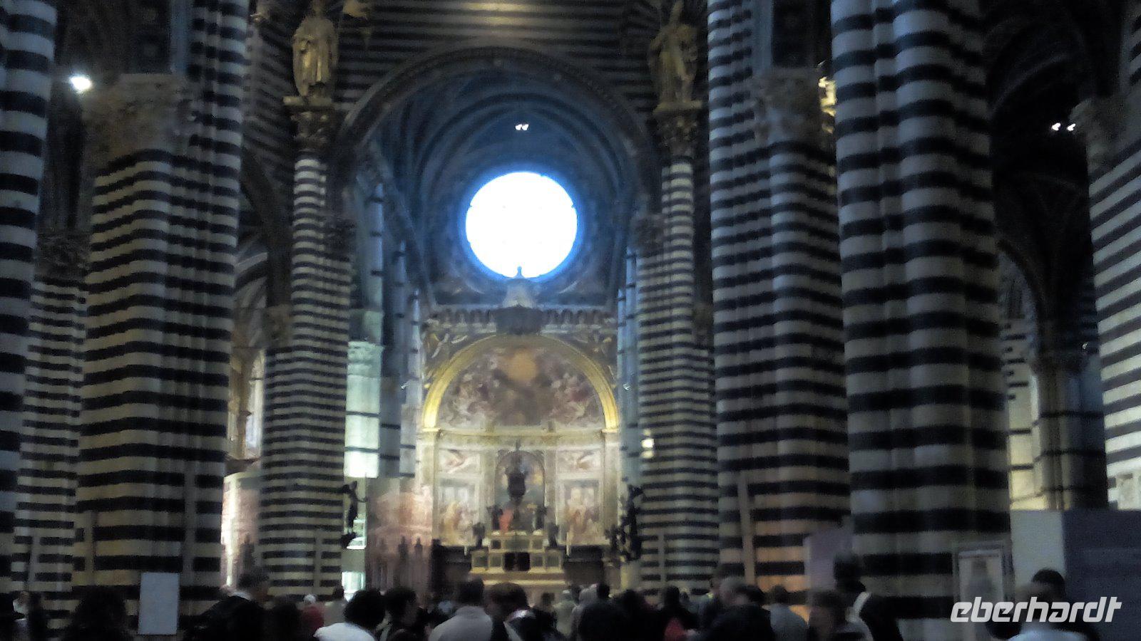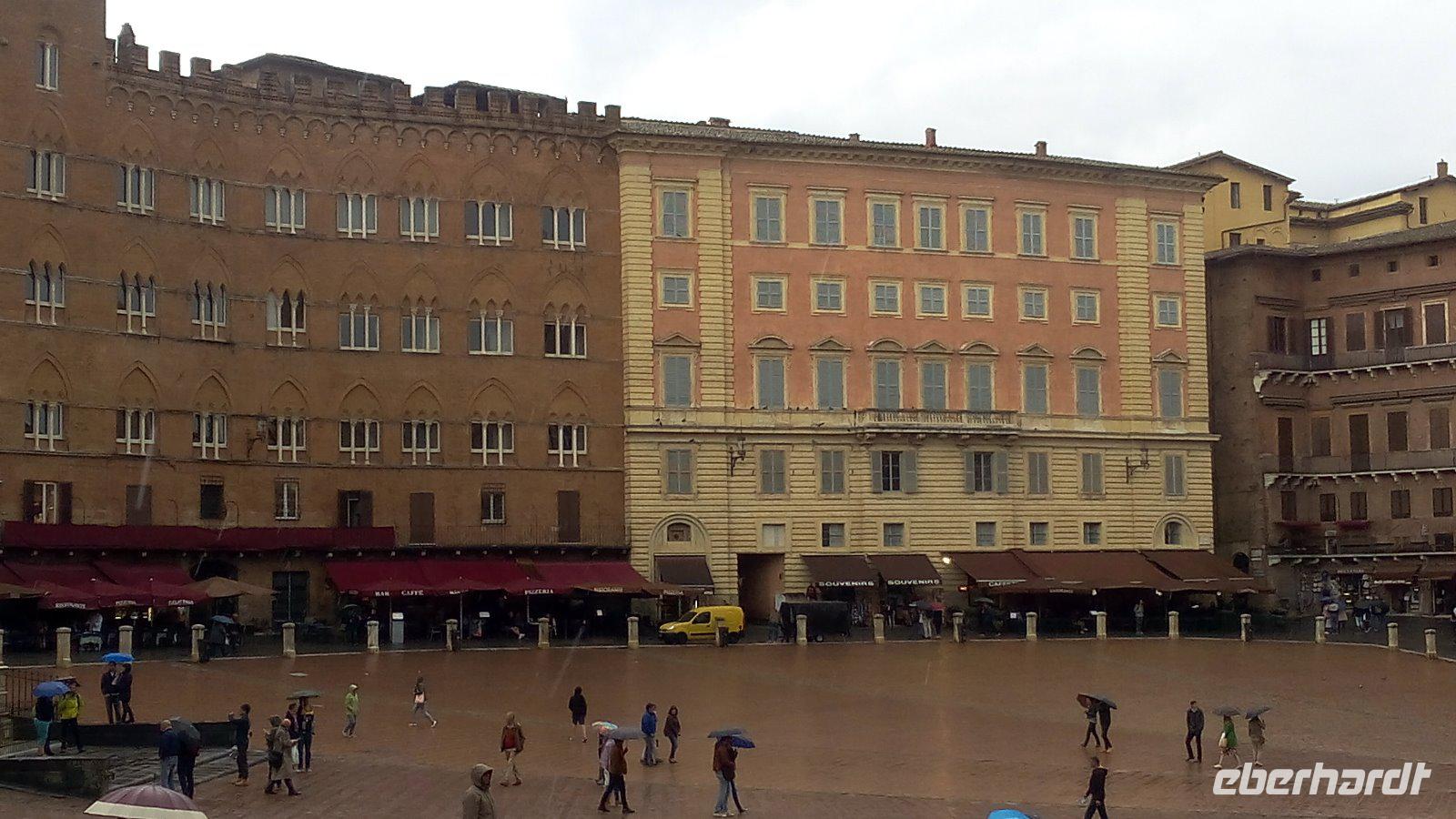 Piazza del Duoma zu kommen. Susanne führt uns im Dom. Dabei kommt dem Marmorfußboden mit seinen insgesamt 56 Bildern und auch der Bibliothek eine besondere Bedeutung zu. Danach laufen wir (zwischenzeitlich regnet es)zum Mittelpunkt und Herz der Stadt dem Piazza del Campo zurück. Susanne gibt Informationen zur Stadt und zum Pferderennen. Wir konnten es uns vorstellen, wie es zu geht, wenn am 2. Juli und 16. August die Pferderennen stattfinden.