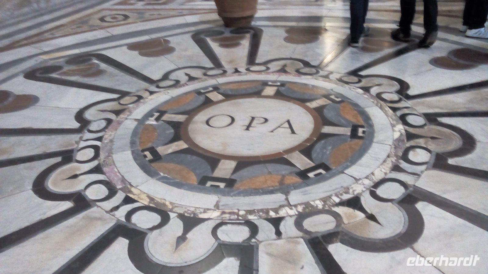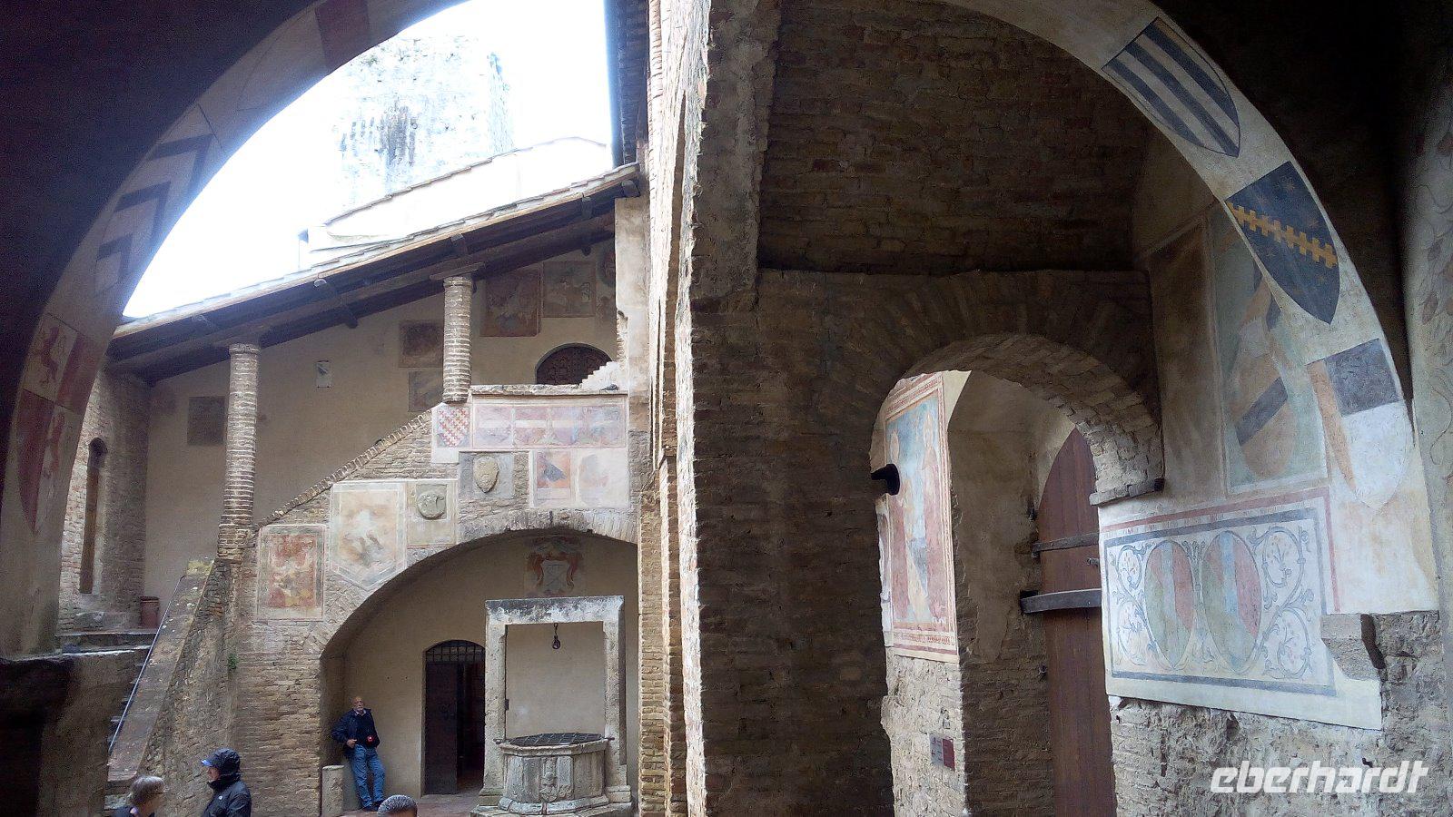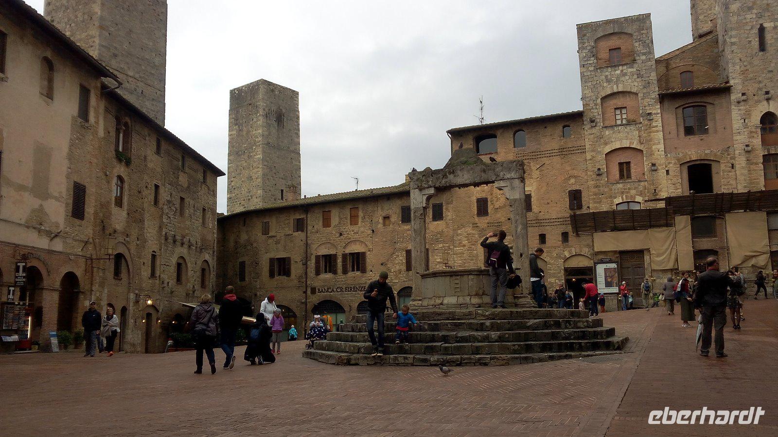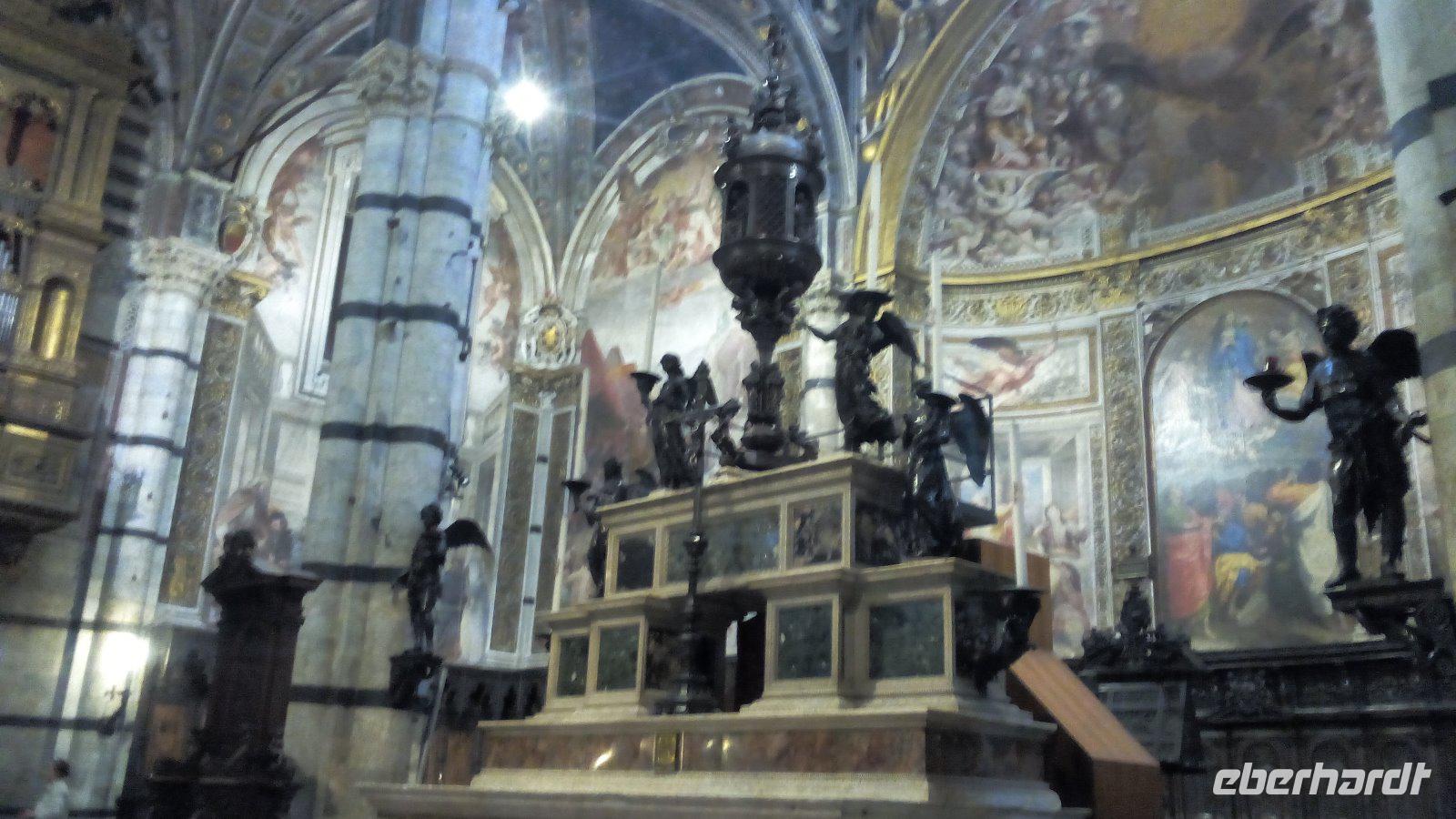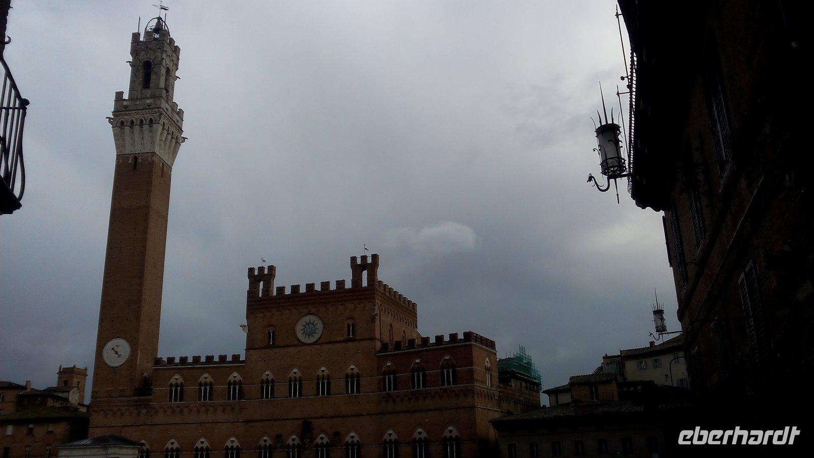 Piazza del Duoma zu kommen. Susanne führt uns im Dom. Dabei kommt dem Marmorfußboden mit seinen insgesamt 56 Bildern und auch der Bibliothek eine besondere Bedeutung zu. Danach laufen wir (zwischenzeitlich regnet es)zum Mittelpunkt und Herz der Stadt dem Piazza del Campo zurück. Susanne gibt Informationen zur Stadt und zum Pferderennen. Wir konnten es uns vorstellen, wie es zu geht, wenn am 2. Juli und 16. August die Pferderennen stattfinden.