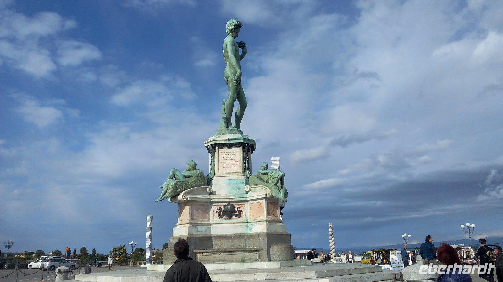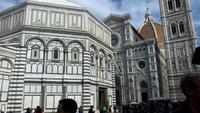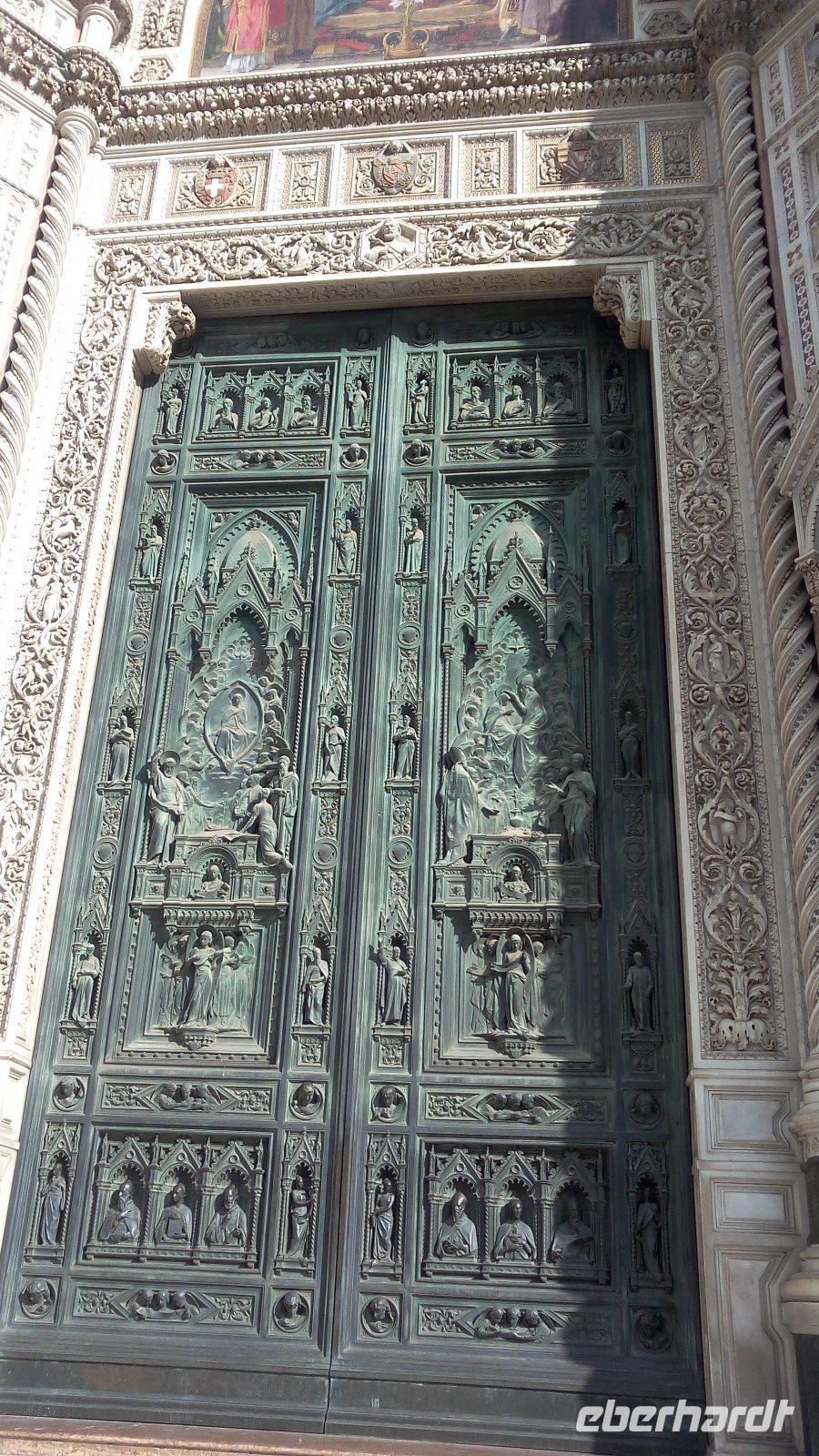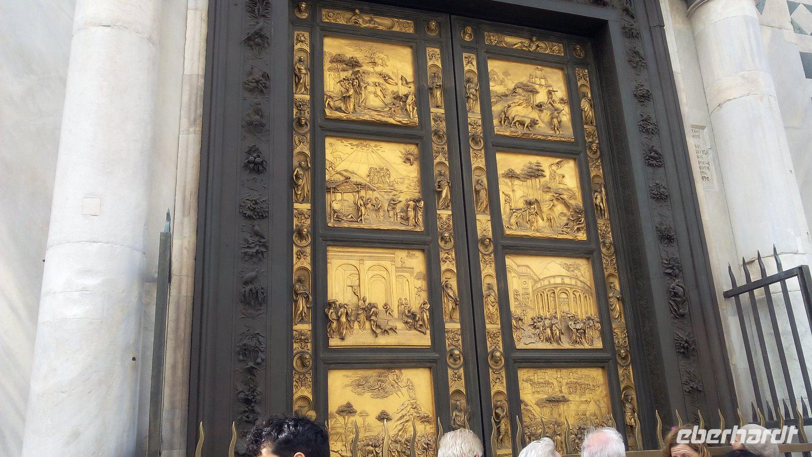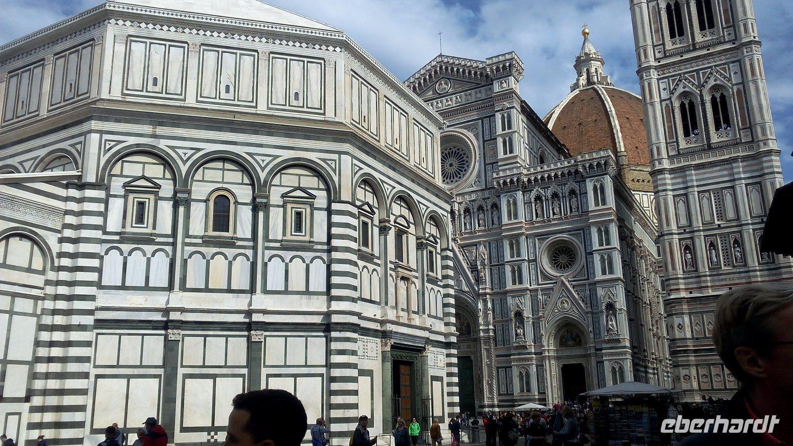 In Florenz treffen wir uns mit unserer Stadtführerin Angela Solda zu Beginn unserer Stadtführung fahren wir mit dem Bus zum Migelangelo Platz. Es ist schön auf dem Balkon der Stadt zu stehen und die unterschiedlichen Gebäude von "oben" zu sehen. Diesen Moment halten wir auf unserem Gruppenbild fest. Nachdem wir wieder am Torre della Zecca angekommen sind, spazieren wir entlang des Arno zur Nationalbibliothek, zum Piazza S.Croce. Wir haben eine Führung in der Kirche S. Croce, in der man die Gräber bedeutender Persönlichkeiten, wie z.B. Michelangelo und Galilei, sieht. Unser Rundgang führt uns weiter zum Piazza Della Signoria, den Uffizien, zur Ponte Viccio die älteste Brücke der Stadt (14Jh) auf der heute die Goldgeschäfte die Kunden in ihren Bann ziehen. Nach einer Mittagspause sehen wir den Piazza del Duomo mit der Cathedrale di S. Maria del Flore(Dom). Glück haben wir an der Taufkapelle(Baptisterium) um die Paradies-Tür am Ostportal sehen zu können. In den goldenen Tafeln (Kopien) werden Szenen des Alten Testaments in perfekter tiefenräumlicher Darstellung mit lebendiger Mimik und Gestik gezeigt.(Originale entstanden zwischen 1425-1452). Nach einem Blick auf das Babtistero San Giovanni, den Dom Santa Maria Del Flore mit dem Campanile endet unsere Stadtführung. Gegen 17:00 Uhr treffen wir uns wieder am Bus und sind uns einig, Florenz erfordert weitere Besuche um die Stadt in ihrer ganzen Schönheit aufnehmen zu können.