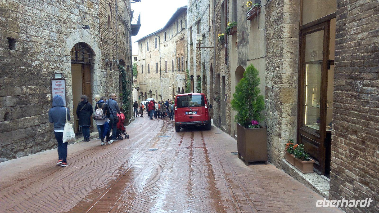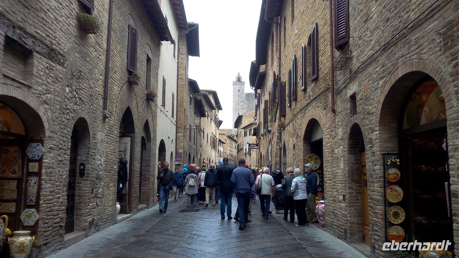 Weiter führt uns unsere Fahrt jetzt nach San Gimignana. Während der Fahrt haben Blicke auf die eindrucksvollen -Skyline-. Susanne wartet schon auf uns und somit beginnen wir gleich mit der Stadtführung. Die vielen Geschlechter- und Wehrtürme zeugen von der Geschichte als San Gimingnano im Mittelalter eine wohlhabende und freie Kommune war. Susanne vermittelt uns die Geschichte sehr anschaulich. Nach der Führung haben wir noch Zeit für ein Eis vom "Weltmeister" und einen Bummel durch die vielen kleinen Geschäfte. Gegen 16:30 Uhr müssen wir das „Manhattan des Mittelalters" verlassen. Unsere Fahrt geht weiter an Volterra vorbei nach S.Vincenzo ins Hotel I Lecci. Unsere Hotelanlage liegt direkt am Wasser und hoffentlich haben wir noch die Chance an einem Tag die Wassertemperatur zu testen.