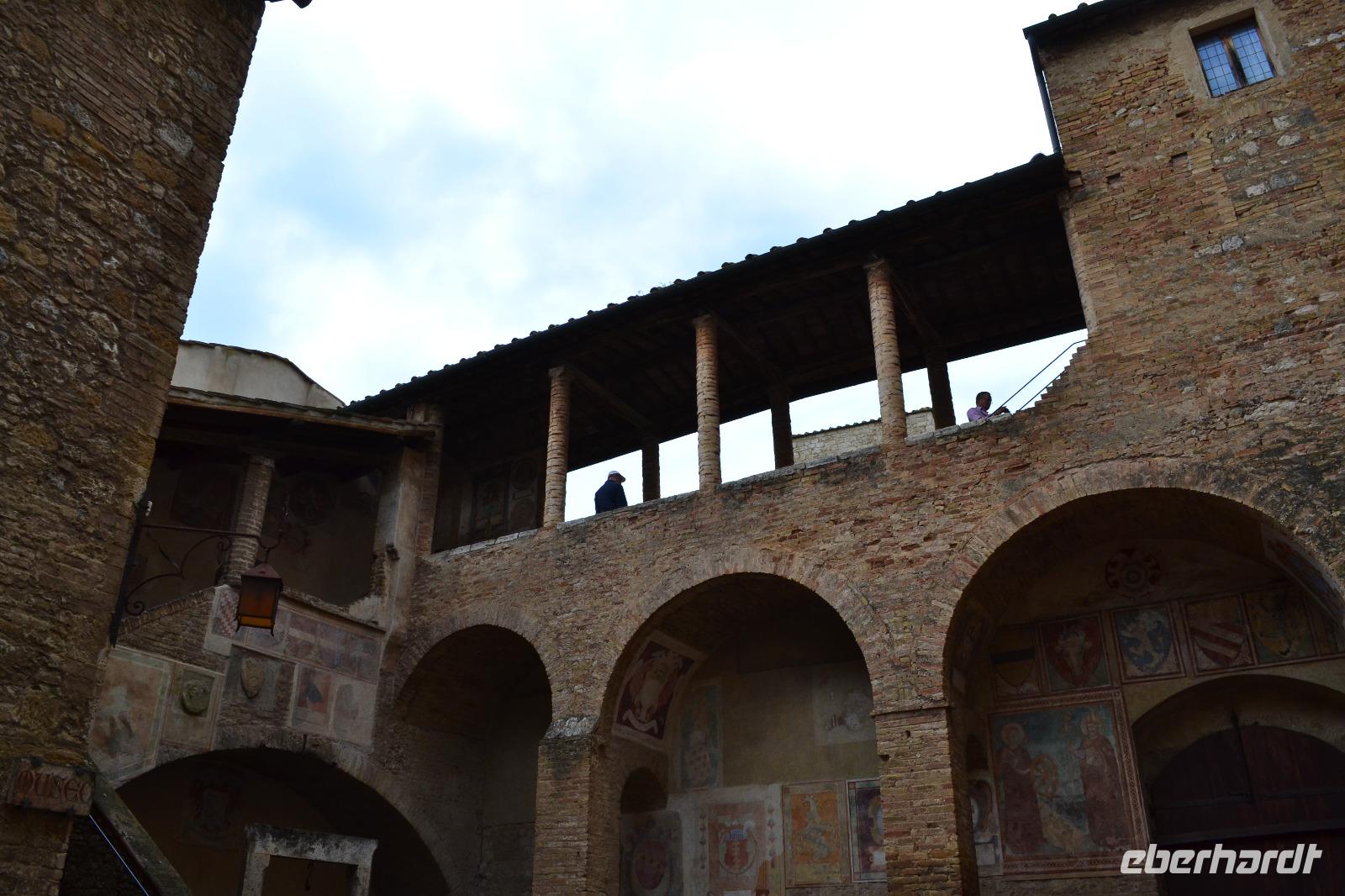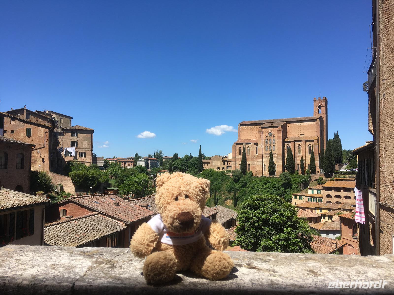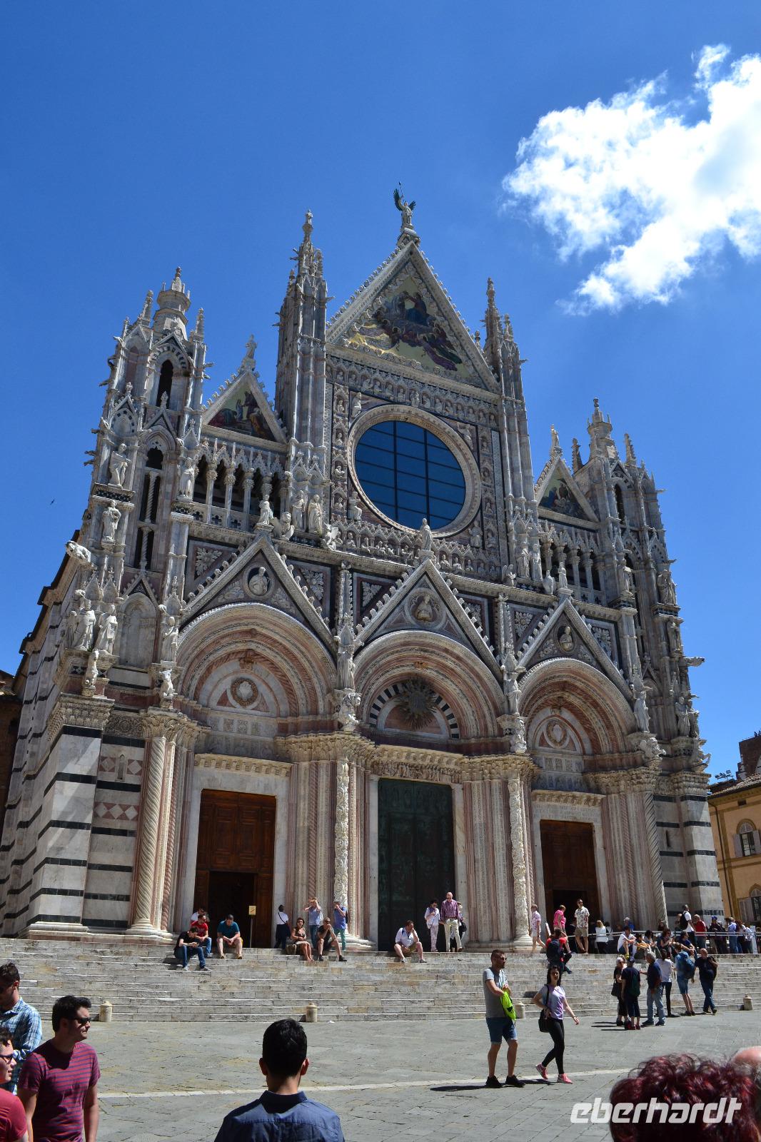 Ach Siena, dir gehört mein Herz! Für mich bist du die schönste der toskanischen Städte. Von deinen Hügeln aus darf man weit ins Umland blicken und man kann stundenlang durch deine alten Gassen schlendern und immer etwas Neues entdecken. Unsere Stadtführerin Luisa hat nicht nur unsere bestellten Briefmarken im Gepäck, sondern auch jede Menge Geschichten und Anekdoten. Wir starten an der noch heute von den Sienesern verhassten Fortezza Medicea, die an die schmachvolle Unterwerfung unter Florenz erinnert. Schnell lassen wir die Festung daher hinter uns und spazieren weiter zur Basilica Cateriniana San Domenico, in der die Heilige Katharina verehrt wird. Anschließend können wir im prächtigen Dom einen Teil der 56 Bilder des Marmorfußbodens bewundern. Mit dem Bau des Doms wurde Anfang des 13. Jh. begonnen. Vor dem in der Toskana allgegenwärtigen Größenwahn waren auch die Sieneser nicht gefeit, und so planten sie Anfang des 14. Jh., den Dom großzügig zu erweitern - er sollte die größte Kirche der Christenheit werden. Doch nur das Nordseitenschiff und ein Teil der neuen Fassade wurden fertig, bevor die Pest über die Stadt hereinbrach und den Niedergang besiegelte. Am Piazza del Campo, Schauplatz des zweimal jährlich stattfindenden berühmt-berüchtigten Pferderennes, endet unsere Führung, und wir können noch etwas auf eigene Faust durch die belebten Straßen bummeln. Zweiter Tagesordnungspunkt für heute ist die inzwischen bei mir schon berüchtigte Weinverkostung auf einem kleinen Bauernhof bei Empoli. Am Anfang fängt es mit einem Glas Weißwein noch recht harmlos an, doch dann kommen noch vier gut gefüllte Gläser Rotwein und ein Dessertwein dazu. Anhand der Etiketten der Weinflaschen lernen wir nach und nach auch die Geschichte der Eigentümerfamilie kennen. Wir werden von ihr sehr herzlich bewirtet - man reicht uns leckeren Schinken, Salami, Käse und natürlich Brot mit Olivenöl, sodass der vergorene Traubensaft nicht auf einen vollkommen nüchternen Magen trifft. Als wir uns auf den Rückweg machen, vermag ich nur noch grob zu schätzen, ob wir alle da sind - die Stimmung aber ist ausgezeichnet.