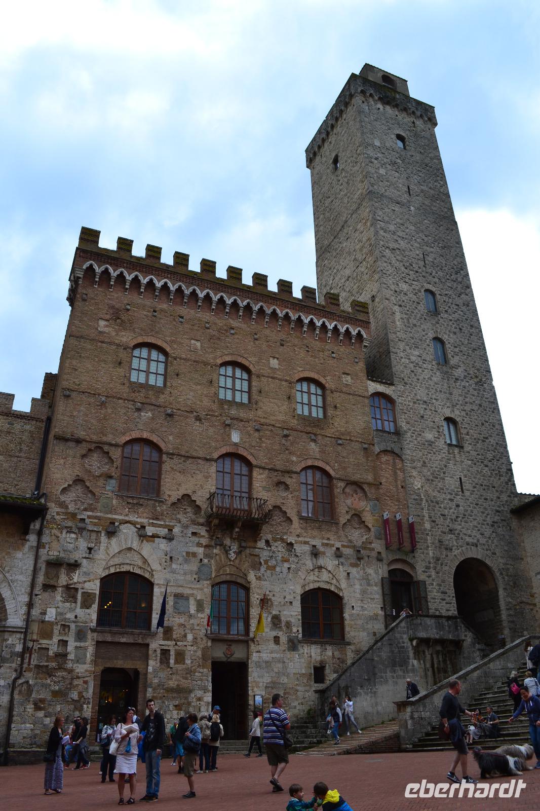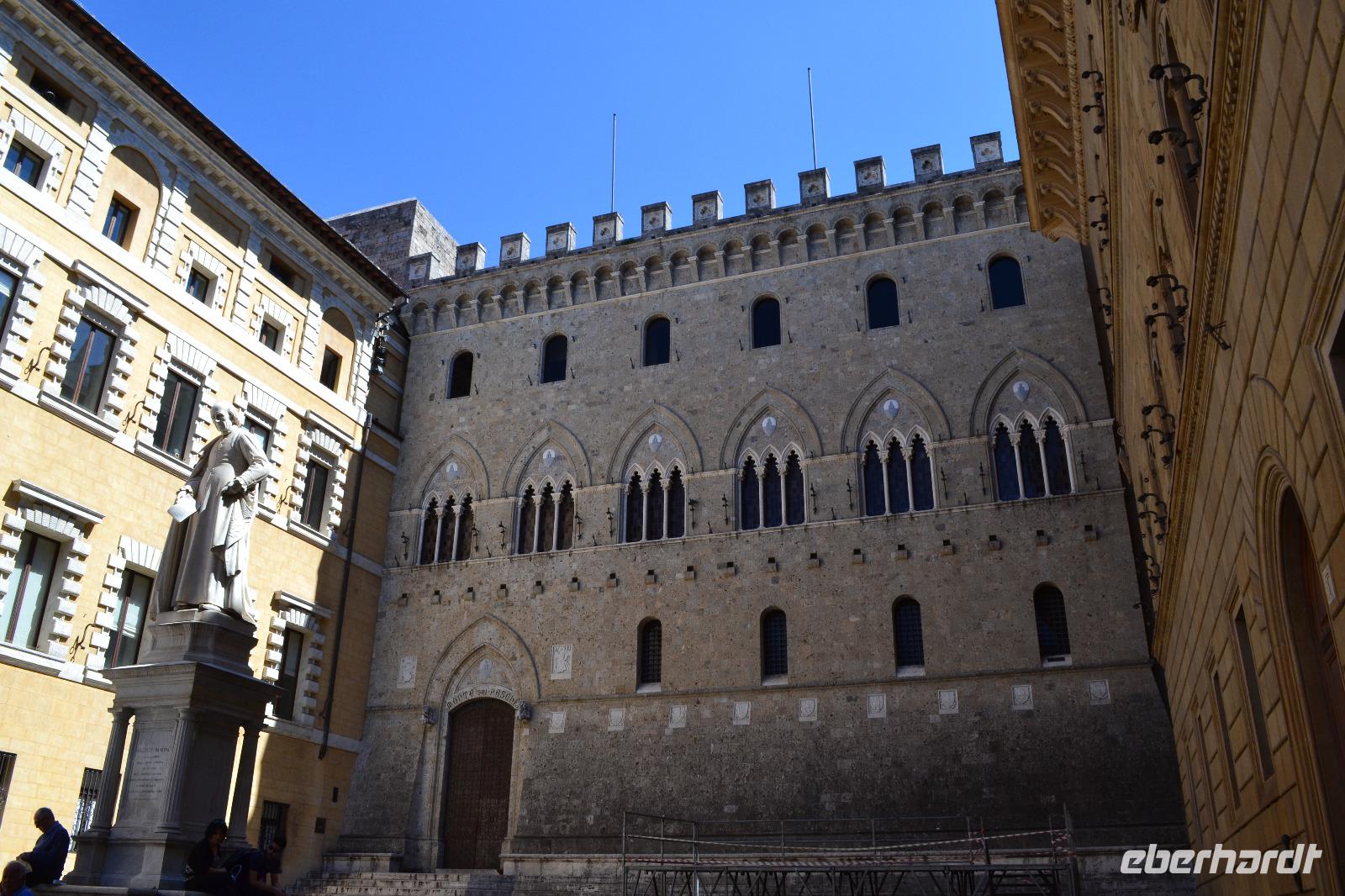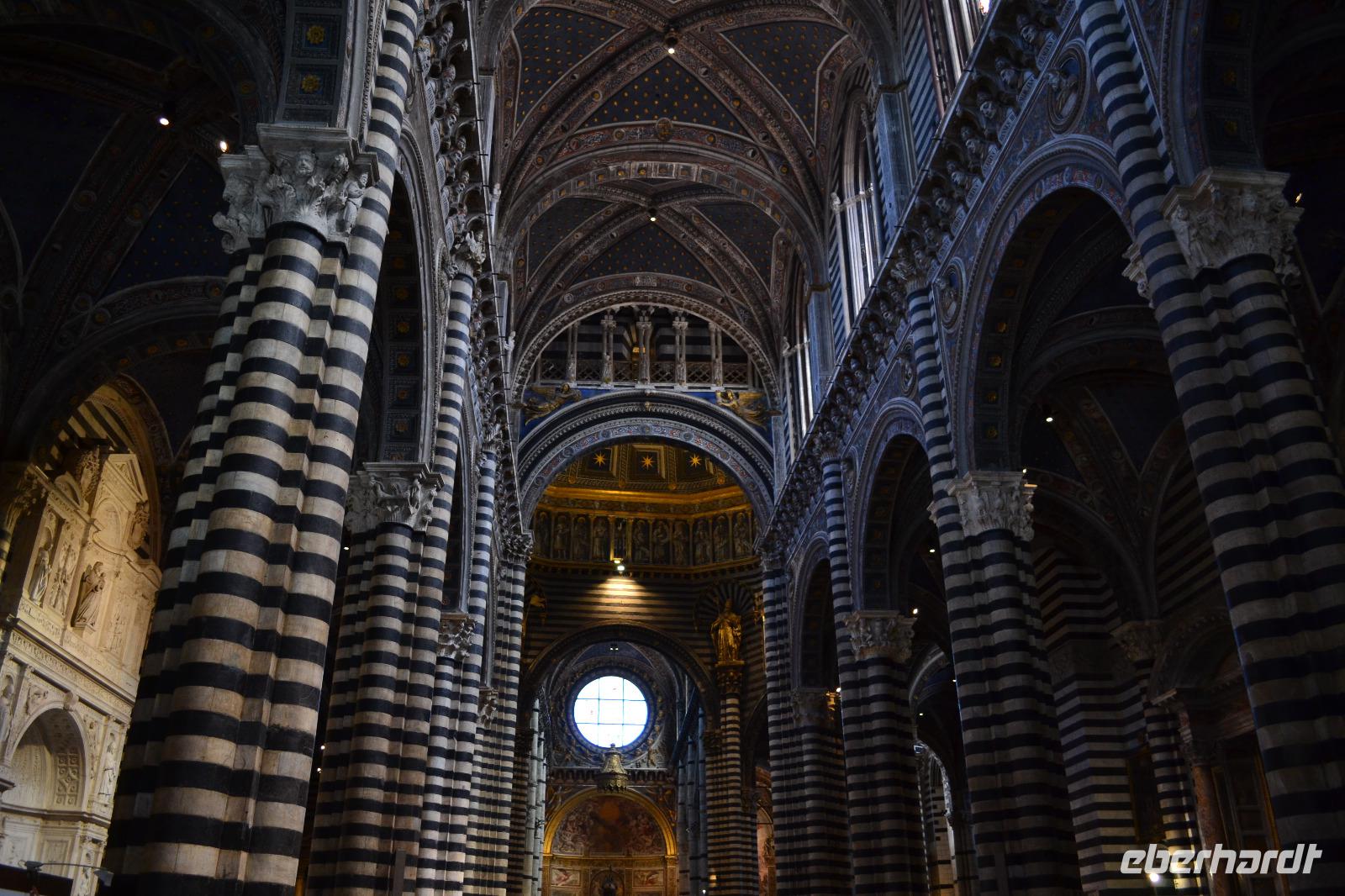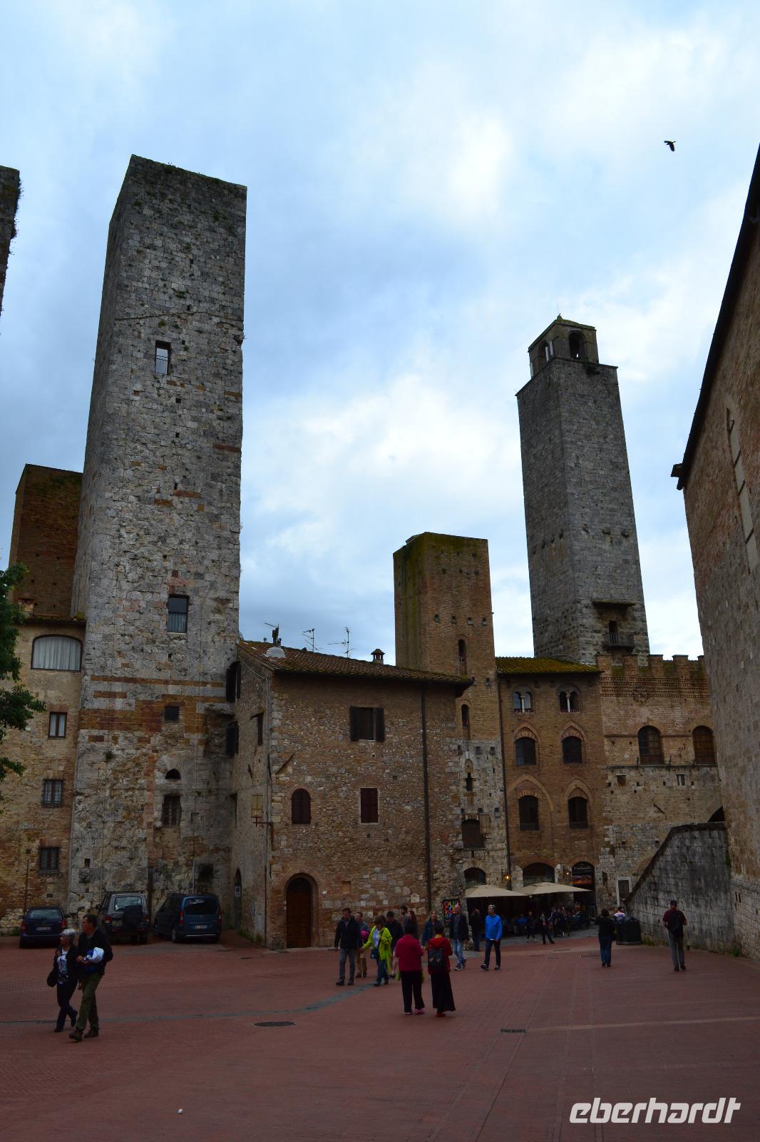 Ach Siena, dir gehört mein Herz! Für mich bist du die schönste der toskanischen Städte. Von deinen Hügeln aus darf man weit ins Umland blicken und man kann stundenlang durch deine alten Gassen schlendern und immer etwas Neues entdecken. Unsere Stadtführerin Luisa hat nicht nur unsere bestellten Briefmarken im Gepäck, sondern auch jede Menge Geschichten und Anekdoten. Wir starten an der noch heute von den Sienesern verhassten Fortezza Medicea, die an die schmachvolle Unterwerfung unter Florenz erinnert. Schnell lassen wir die Festung daher hinter uns und spazieren weiter zur Basilica Cateriniana San Domenico, in der die Heilige Katharina verehrt wird. Anschließend können wir im prächtigen Dom einen Teil der 56 Bilder des Marmorfußbodens bewundern. Mit dem Bau des Doms wurde Anfang des 13. Jh. begonnen. Vor dem in der Toskana allgegenwärtigen Größenwahn waren auch die Sieneser nicht gefeit, und so planten sie Anfang des 14. Jh., den Dom großzügig zu erweitern - er sollte die größte Kirche der Christenheit werden. Doch nur das Nordseitenschiff und ein Teil der neuen Fassade wurden fertig, bevor die Pest über die Stadt hereinbrach und den Niedergang besiegelte. Am Piazza del Campo, Schauplatz des zweimal jährlich stattfindenden berühmt-berüchtigten Pferderennes, endet unsere Führung, und wir können noch etwas auf eigene Faust durch die belebten Straßen bummeln. Zweiter Tagesordnungspunkt für heute ist die inzwischen bei mir schon berüchtigte Weinverkostung auf einem kleinen Bauernhof bei Empoli. Am Anfang fängt es mit einem Glas Weißwein noch recht harmlos an, doch dann kommen noch vier gut gefüllte Gläser Rotwein und ein Dessertwein dazu. Anhand der Etiketten der Weinflaschen lernen wir nach und nach auch die Geschichte der Eigentümerfamilie kennen. Wir werden von ihr sehr herzlich bewirtet - man reicht uns leckeren Schinken, Salami, Käse und natürlich Brot mit Olivenöl, sodass der vergorene Traubensaft nicht auf einen vollkommen nüchternen Magen trifft. Als wir uns auf den Rückweg machen, vermag ich nur noch grob zu schätzen, ob wir alle da sind - die Stimmung aber ist ausgezeichnet.