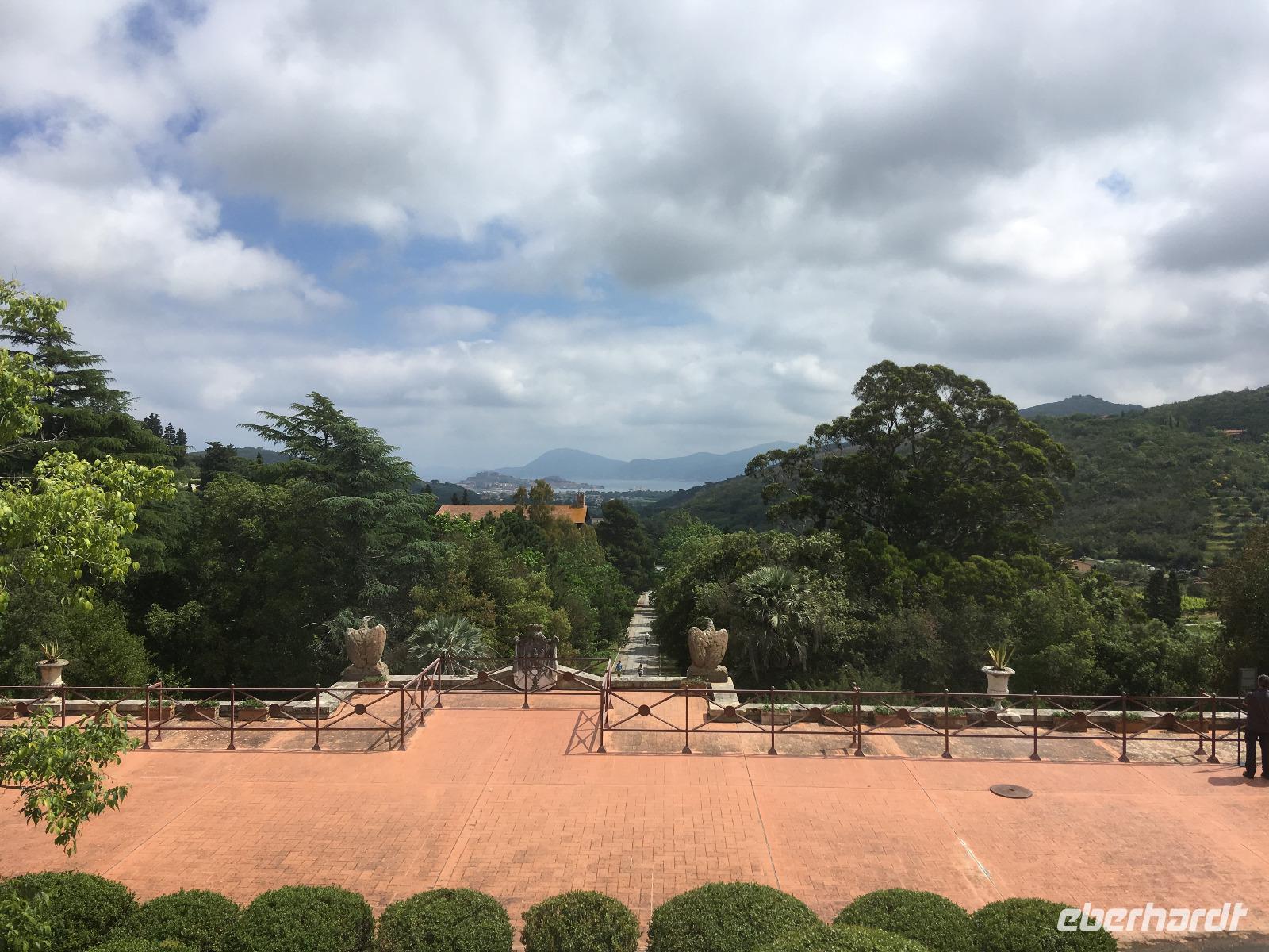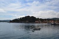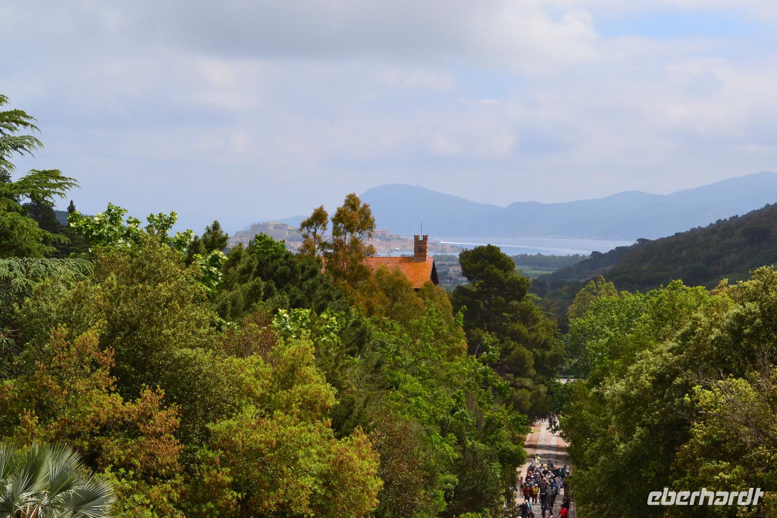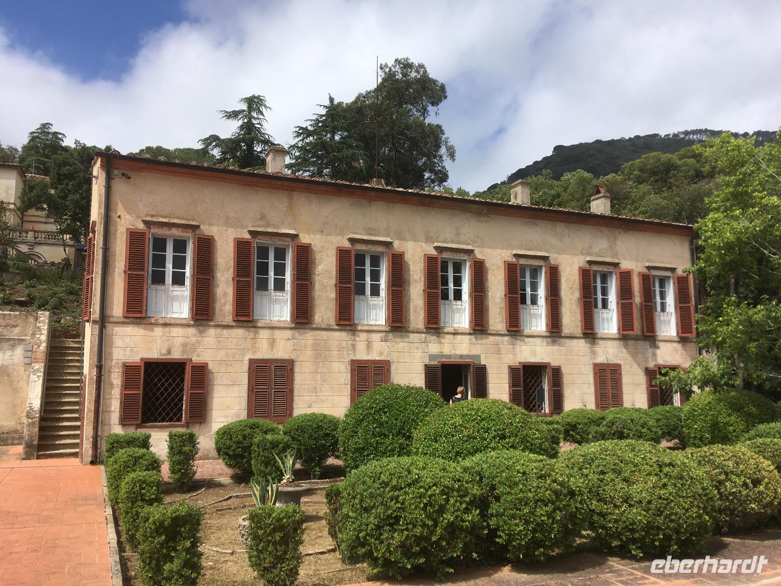 Der heutige Tag steht ganz im Schatten des großen Imperators Napoleon Bonaparte. Auf Schritt und Tritt wird er uns bei unserem Ausflug nach Elba verfolgen, obwohl er in seinem ersten Exil nicht einmal 10 Monate auf der Insel verbrachte. Gleichwohl hat er in dieser Zeit viel für die Entwicklung der Insel getan, wie uns unsere heutige örtliche Reiseleiterin Jo zu berichten weiß. Auch wenn sein Name heutzutage allerorts hauptsächlich aus Marketinggründen fällt - ein bisschen Bewunderung schwingt doch immer noch mit, wenn die rot-weiße Fahne mit den drei fleißigen Bienen im Winde flattert. Mit der Fähre setzen wir also am Morgen in gut einer Stunde vom Hafen in Piombino nach Porto Ferraio auf Elba über und beginnen dort unsere Rundfahrt. Zum Baden mag es heute dank des kräftigen Windes zu kalt sein, aber der blaue Himmel ist endgültig zurück und die Sonne lacht vom Himmel. Wir besichtigen zunächst die Villa San Martino, die Sommerresidenz Napoleons auf Elba. Zwar handelt es sich letztendlich nur um ein erweitertes Bauernhaus, doch vermochte es Napoleon mit Fantasie und Improvisationstalent, diesem Gebäude herrschaftliches Flair zu verleihen. Viel wichtiger war ihm jedoch der Ausblick auf die Bucht von Porto Ferraio, sodass er die ein- und auslaufenden Schiffe immer im Auge behalten konnte - schließlich plante er ja von langer Hand seine Flucht. An der Bucht von Procchio machen wir anschließend einen Fotostopp und durchqueren dann die Insel bis Marina die Campo, wo wir am Hafen unsere Mittagspause einlegen. Der Rückweg zum Bus führt auch hier dummerweise wieder an einer Eisdiele vorbei. Wer soll/kann denn da widerstehen? Nach einem weiteren Fotostopp an der Südküste, bei dem wir im Dunst auch die schemenhaften Umrisse der sagenumwobenen Insel Monte Christo erkennen können, erreichen wir Porto Azzurro, wo sich uns Gelegenheit für eine Kaffeepause bietet. In Porto Ferraio erwartet uns dann ein kleiner Schockmoment: die Fähre ist kaputt! Zum Glück müssen wir aber nur eine halbe Stunde warten, dann können wir mit der nächsten Fähre wieder auf's Festland übersetzen.