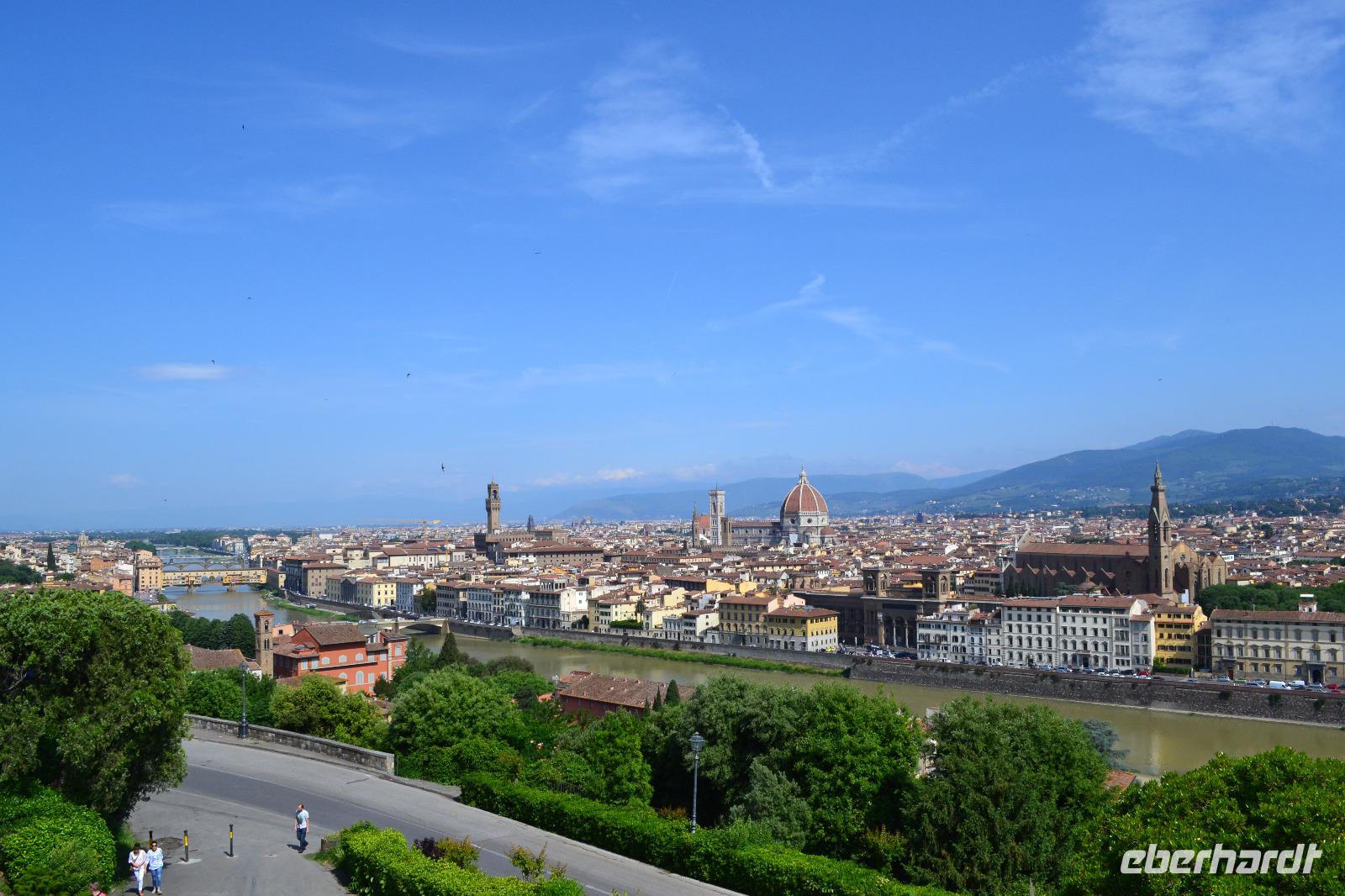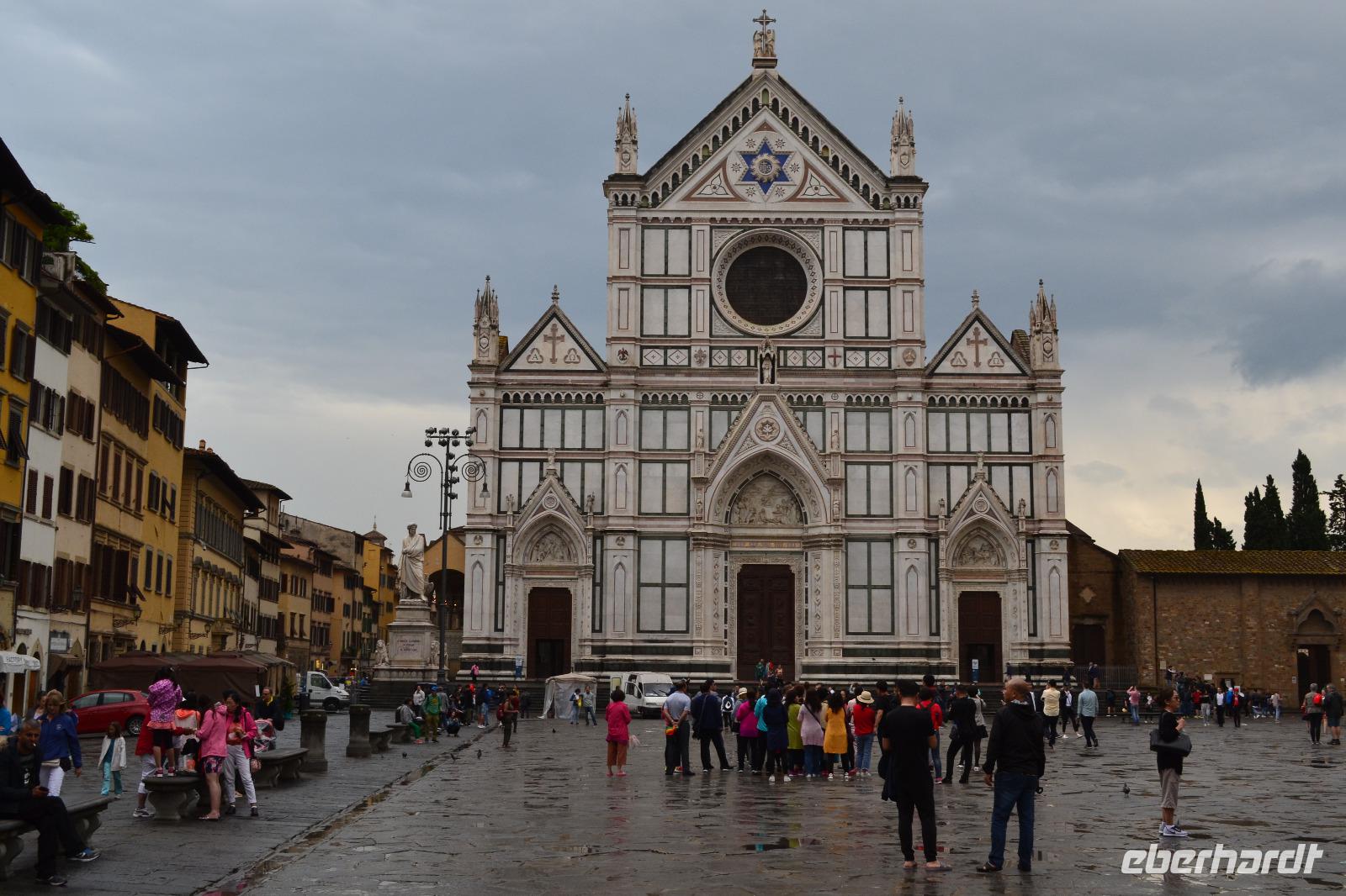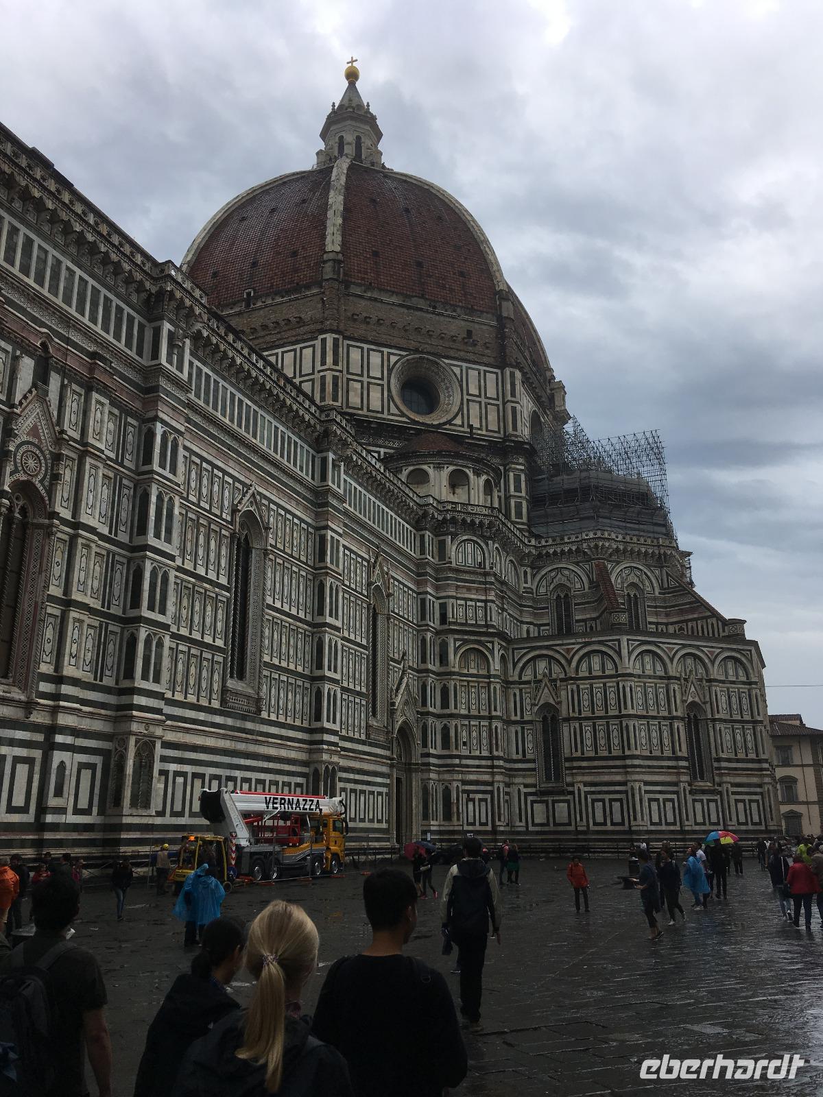 Unter den Medici hat sich Florenz zum unumstößlichen Zentrum der Toskana emporgekämpft. Auch heute bildet die Metropole am Arno das Herz der Toskana, wenn nicht sogar das Herz der Menschheit. Warum? Fast 50 % aller Kunst- und Kulturschätze der gesamten Menschheitsgeschichte befinden sich in Italien, allein 10 % in Florenz. So kann unsere heutige Stadtbesichtigung natürlich von Anfang an nur ein Streifzug bleiben. Von der Piazzale Michelangelo verschaffen wir uns zusammen mit unserer Stadtführerin Angela einen ersten Überblick. Unter uns fließt der Arno, dort ist die berühmte Ponte Vecchio, dort thront die berühmte Kuppel von Brunelleschi auf dem Dom. Zu Fuß erkunden wir dann die Altstadt. Unser erstes Ziel: das Franziskanerkloster mit der Kirche Santa Croce, in der sich viele Gräber berühmter Persönlichkeiten befinden, z. B. die Grabmäler Galileo Galileis, Machiavellis und Michelangelos. Auch Dante wollte man hier gern beerdigen, doch Ravenna rückt die sterblichen Überreste des ins Exil verbannten Dichterfürsten nicht raus. So erinnert nur ein Kenotaph und das berühmte, draußen vor der Fassade stehende Denkmal an das wohl berühmteste Kind der Stadt. Durch die Gassen der Altstadt ziehen wir weiter bis zum Palazzi Vecchio an der Piazza della Signoria. Nach der Besichtigung des Innenhofes trennen wir uns hier zur Mittagspause. Nachdem wir am Vormittag noch ganz schönes Wetter hatten, fängt es - wie vom Wetterbericht vorhergesagt - pünktlich auf die Minute um genau 13:00 Uhr zu regnen an - und wie! Schnell flüchten wir uns in nahe gelegene Restaurants. Als die Mittagspause vorbei ist, hat der Wolkenguss noch nicht aufgehört, sodass Angela und ich erst einmal alle Gäste einsammeln und Kriegsrat halten. In der Zwischenzeit verdienen sich die Straßenhändler mit ihren Regencapes an uns eine goldene Nase. Nach einer Weile lässt der Regen dann doch nach, und wir beschließen, zum Domplatz zu gehen. Der Anblick des Baptisteriums, der Fassade der Cattedrale Santa Maria del Fiore und des hoch aufragenden Glockenturms ist für mich auch beim dritten Besuch in der Toskana überwältigend. Das bestimmende Element des Ensembles ist natürlich die überdimensionale Kuppel des genialen Architekten Filippo Brunelleschi. Seit Beginn der Bauarbeiten 1296 zerbrachen sich die Florentiner den Kopf, wie und ob sie die Kuppel überhaupt erbauen können. Erst Brunelleschi schaffte es dann mit seinem kühnen Entwurf und viel Überzeugungsarbeit, 1436 den Dom zu vollenden. Anschließend steht natürlich noch die Brücke der Goldschmiede, die Ponte Vecchio, auf dem Programm sowie ein Spaziergang entlang der Uffizien, der weltberühmten Gemäldegalerie. Unsere Führung beenden wir in der Kirche Orsanmichele, die aus einer Markthalle entstanden ist. Meine Gäste haben noch etwas Freizeit, bis wir uns wieder am Torre della Zecca treffen und gemeinsam mit dem Bus die Rückfahrt nach Montecatini Terme antreten.