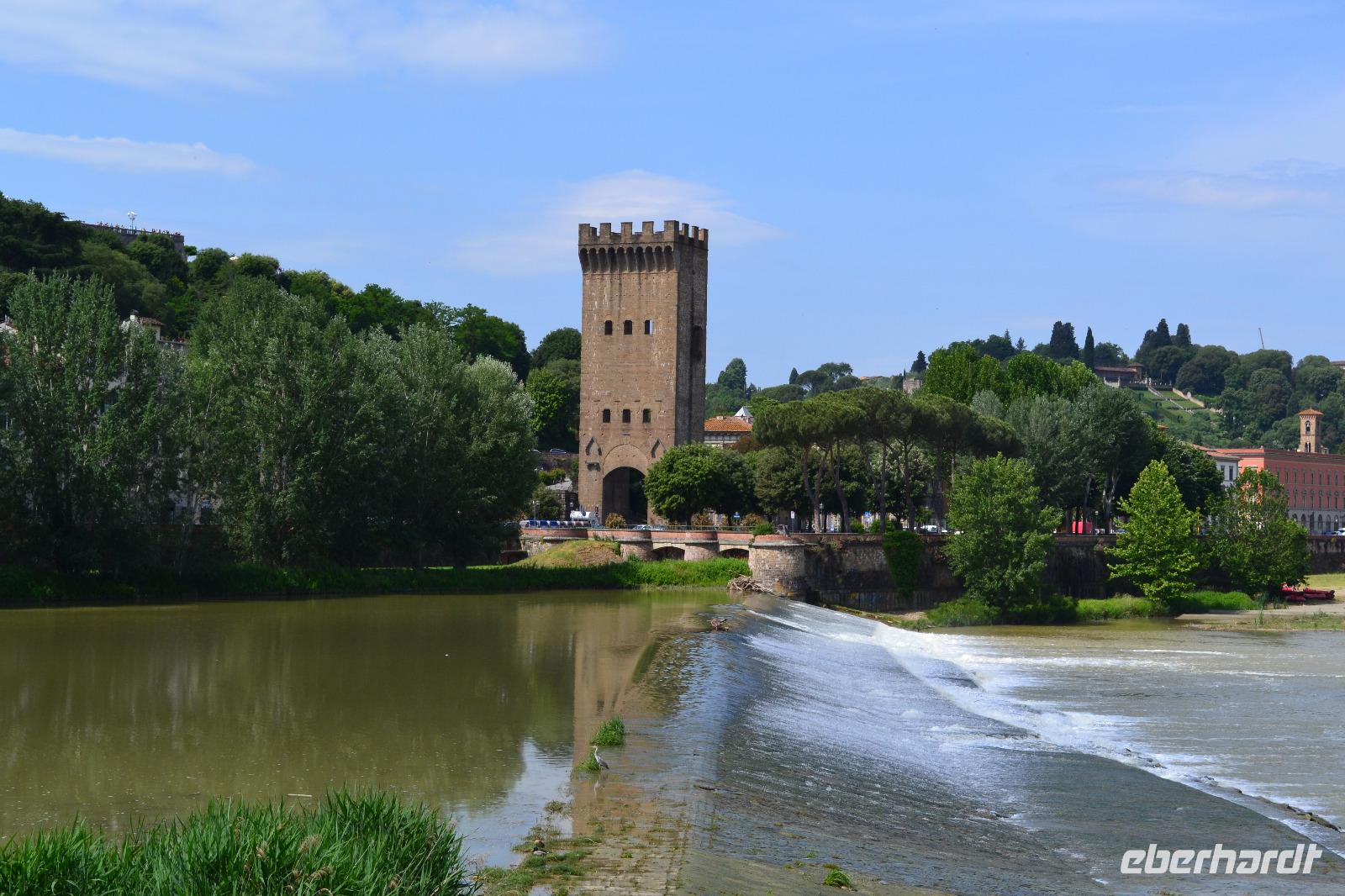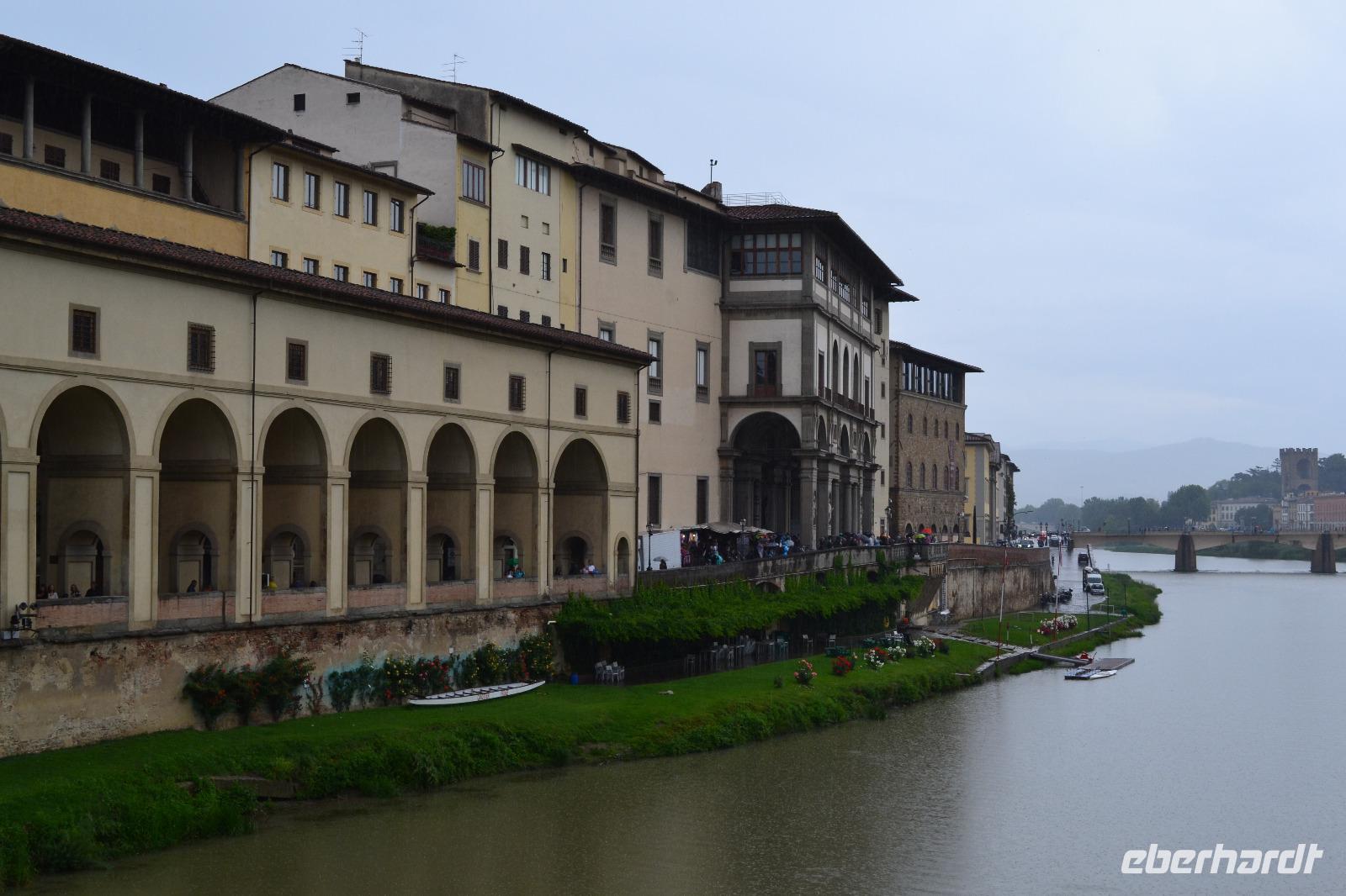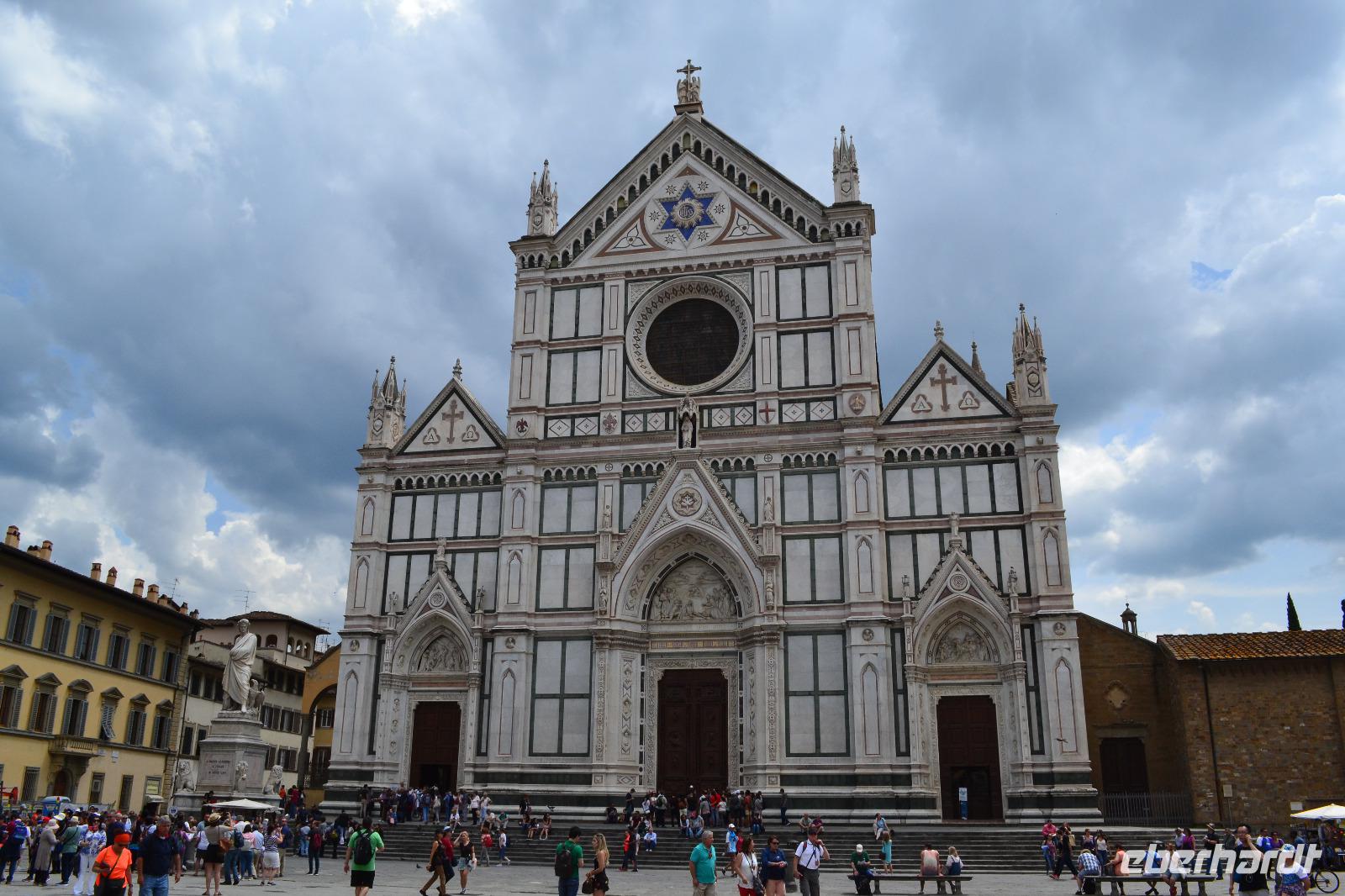 Unter den Medici hat sich Florenz zum unumstößlichen Zentrum der Toskana emporgekämpft. Auch heute bildet die Metropole am Arno das Herz der Toskana, wenn nicht sogar das Herz der Menschheit. Warum? Fast 50 % aller Kunst- und Kulturschätze der gesamten Menschheitsgeschichte befinden sich in Italien, allein 10 % in Florenz. So kann unsere heutige Stadtbesichtigung natürlich von Anfang an nur ein Streifzug bleiben. Von der Piazzale Michelangelo verschaffen wir uns zusammen mit unserer Stadtführerin Angela einen ersten Überblick. Unter uns fließt der Arno, dort ist die berühmte Ponte Vecchio, dort thront die berühmte Kuppel von Brunelleschi auf dem Dom. Zu Fuß erkunden wir dann die Altstadt. Unser erstes Ziel: das Franziskanerkloster mit der Kirche Santa Croce, in der sich viele Gräber berühmter Persönlichkeiten befinden, z. B. die Grabmäler Galileo Galileis, Machiavellis und Michelangelos. Auch Dante wollte man hier gern beerdigen, doch Ravenna rückt die sterblichen Überreste des ins Exil verbannten Dichterfürsten nicht raus. So erinnert nur ein Kenotaph und das berühmte, draußen vor der Fassade stehende Denkmal an das wohl berühmteste Kind der Stadt. Durch die Gassen der Altstadt ziehen wir weiter bis zum Palazzi Vecchio an der Piazza della Signoria. Nach der Besichtigung des Innenhofes trennen wir uns hier zur Mittagspause. Nachdem wir am Vormittag noch ganz schönes Wetter hatten, fängt es - wie vom Wetterbericht vorhergesagt - pünktlich auf die Minute um genau 13:00 Uhr zu regnen an - und wie! Schnell flüchten wir uns in nahe gelegene Restaurants. Als die Mittagspause vorbei ist, hat der Wolkenguss noch nicht aufgehört, sodass Angela und ich erst einmal alle Gäste einsammeln und Kriegsrat halten. In der Zwischenzeit verdienen sich die Straßenhändler mit ihren Regencapes an uns eine goldene Nase. Nach einer Weile lässt der Regen dann doch nach, und wir beschließen, zum Domplatz zu gehen. Der Anblick des Baptisteriums, der Fassade der Cattedrale Santa Maria del Fiore und des hoch aufragenden Glockenturms ist für mich auch beim dritten Besuch in der Toskana überwältigend. Das bestimmende Element des Ensembles ist natürlich die überdimensionale Kuppel des genialen Architekten Filippo Brunelleschi. Seit Beginn der Bauarbeiten 1296 zerbrachen sich die Florentiner den Kopf, wie und ob sie die Kuppel überhaupt erbauen können. Erst Brunelleschi schaffte es dann mit seinem kühnen Entwurf und viel Überzeugungsarbeit, 1436 den Dom zu vollenden. Anschließend steht natürlich noch die Brücke der Goldschmiede, die Ponte Vecchio, auf dem Programm sowie ein Spaziergang entlang der Uffizien, der weltberühmten Gemäldegalerie. Unsere Führung beenden wir in der Kirche Orsanmichele, die aus einer Markthalle entstanden ist. Meine Gäste haben noch etwas Freizeit, bis wir uns wieder am Torre della Zecca treffen und gemeinsam mit dem Bus die Rückfahrt nach Montecatini Terme antreten.
