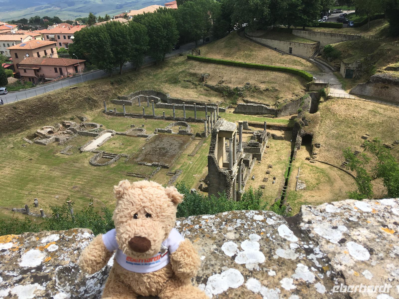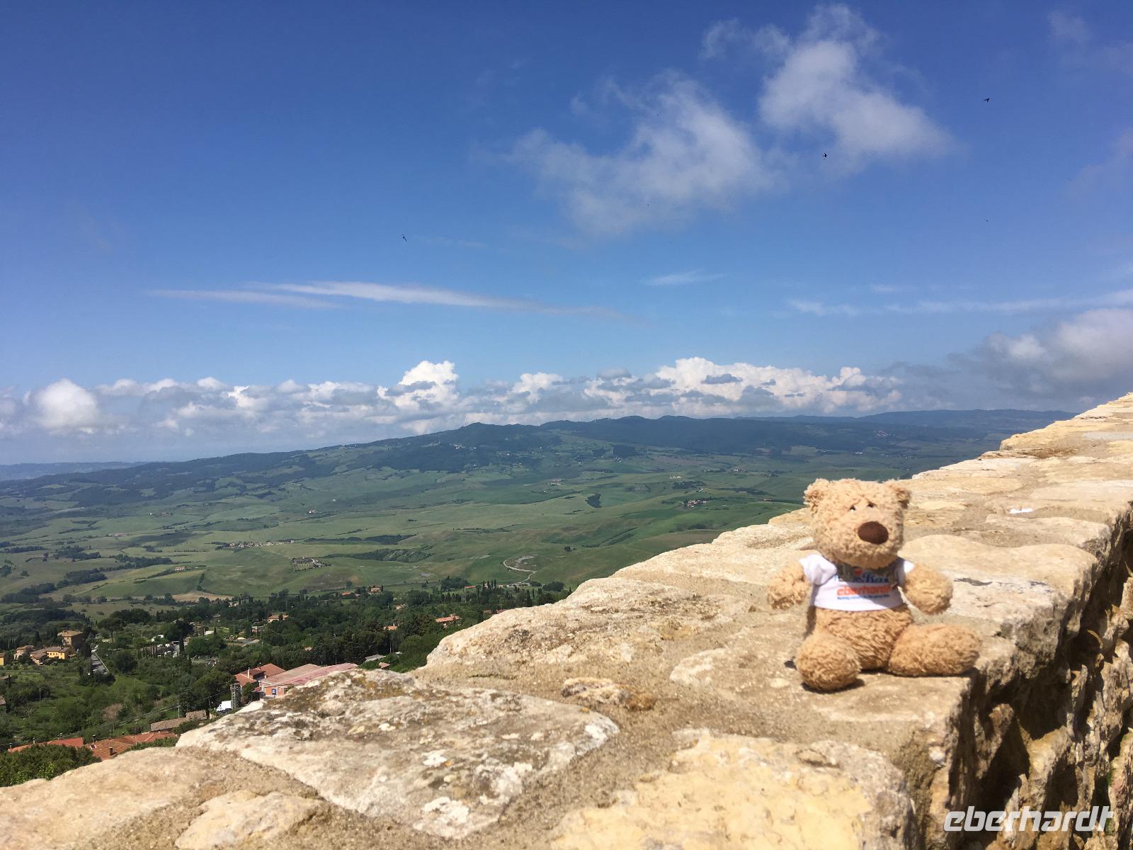 Hoch hinaus geht es heute für uns, denn Volterra liegt auf einem Hügel 550 m über dem Tal der Cecina. Von der Stadtmauer aus bietet sich uns ein herrlicher Fernblick. Das Stadtbild der alten Etruskerstadt wird beherrscht von der Medici-Festung, in der heute ein Gefängnis ist, in welchem man sich von den Gefangenen bekochen lassen kann - angeblich ein außerordentlich gut nachgefragtes Angebot, das man lange im Voraus reservieren muss. Wir sind aber vor allem hierher gekommen, damit uns unsere Stadtführerin Maria das alte Etruskertor aus dem 4. Jahrhundert vor Chr. zeigt sowie die Überreste des römischen Amphitheaters und der Thermen. Denn obwohl wir in Italien sind, hatten wir bisher ja noch recht wenig Kontakt mit den Römern. Die Anlagen in Volterra stammen aus der Zeit des Kaisers Augustus, wurde also um den Beginn unserer Zeitrechnung erbaut. Damit sind die Ruinen ungefähr 2.000 Jahre alt - wenn Mauern reden könnten... Volterra besitzt außerdem mit dem Palazzo dei Priori den ältesten erhaltenen Kommunalpalast der Toskana und gilt als Zentrum der Alabasterverarbeitung. Wir können eine der bekanntesten Werkstätten, die heute noch in Betrieb ist, besichtigen. Nach der Stadtführung haben meine Gäste Zeit, etwas zu essen oder die Souvenirläden zu durchstöbern. Wieder werde ich beim Eistesten erwischt - sie passen aber auch wirklich gut auf! Am frühen Nachmittag fahren wir ins Hotel zurück und haben dann noch ein bisschen Freizeit bis zum Abendessen, in der wir z. B. den Strand erkunden können.