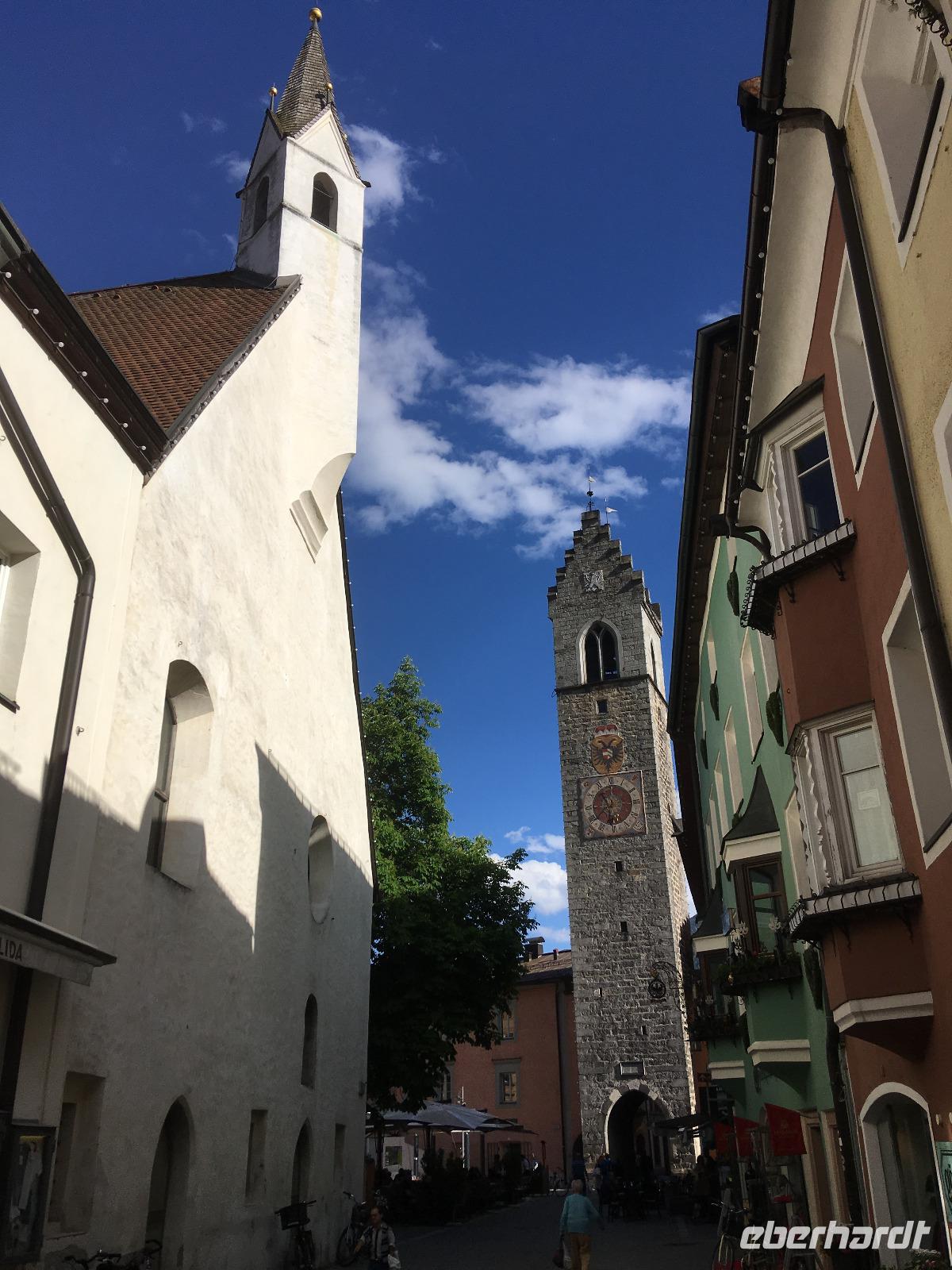 Heute heißt es auch schon wieder Abschied nehmen von der Toskana und vom Meer, auch wenn eine spontane Umfrage im Bus ergeben hat, dass sich eine deutliche Mehrheit für eine Verlängerung mit Badeurlaub ausspricht. Allein, mein Pflichtbewusstsein setzt sich am Ende wieder einmal durch. So fahren wir zunächst an der Küste des Ligurischen Meeres nach Norden, und überlegen unterwegs kurz, ob wir einen Block Carrara-Marmor mitnehmen sollen. Leider haben wir inzwischen schon so viele Flaschen Wein und Olivenöl im Kofferraum gebunkert, dass der Platz dafür einfach nicht ausreicht. Bei La Spezia biegen wir schließlich in Richtung Nordosten ab, durchqueren am Fluss Taro entlang die Apenninen, und kommen wieder in die flache Po-Ebene. Nun ist es auch nicht mehr weit bis in die Alpen. An Mantua und Verona vorbei erreichen wir nacheinander Trient, Bozen und Brixen. Bei nochmals strahlendem Sonnenschein haben wir am Nachmittag Gelegenheit, durch die wunderschöne Altstadt von Sterzing zu bummeln. In unserem Hotel ein paar Kilometer weiter südlich erwartet uns dann am Abend ein gutes Buffet sowie eine Terrasse, von der aus wir bei einem Glas Bier oder Wein die Aussicht auf das Eisacktal genießen können.