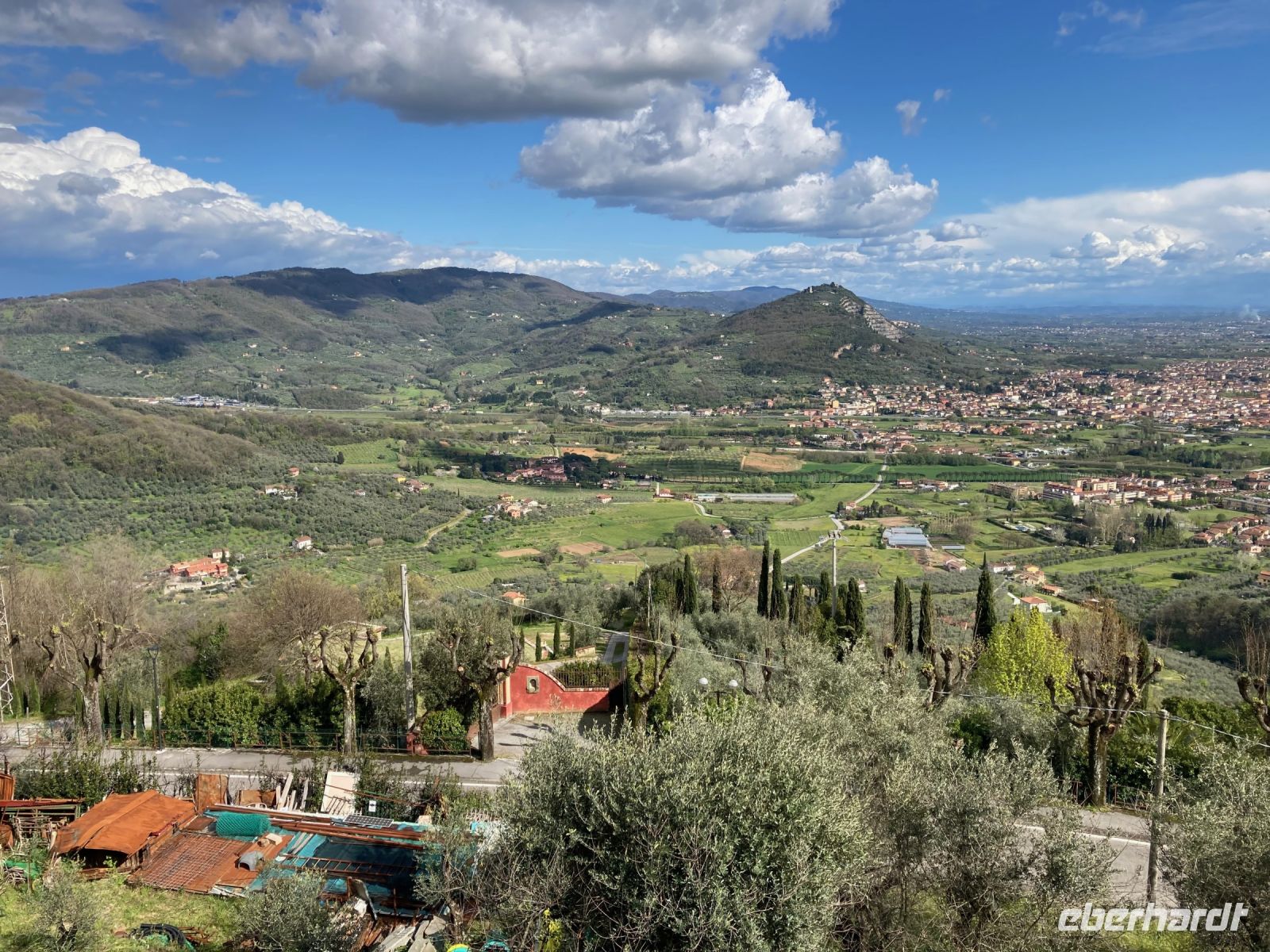 Am fünften Tag verlassen wir Montecatini Terme zur Abwechslung wieder in Richtung Westen und fahren an Lucca vorbei nach Pisa. Apropos Lucca: Auf dem kurzen Spaziergang zum Platz der Wunder treffen wir unsere Stadtführerin wieder. Auch sie besichtigt heute mit einer anderen Gruppe die Hauptstadt der einstmals großen Seerepublik. Kaum sind wir durch das alte Stadttor um die Ecke gebogen, sind meine Gäste auch schon völlig in den Bann gezogen. Im Sonnenlicht strahlen vor uns der weiße Marmor von Baptisterium, Dom und Glockenturm um die Wette. Ich besorge die Eintrittskarten für meine Gäste (je nach Wunsch) und dann dürfen sie die Wunder von Pisa auf eigene Faust erkunden. Mit einer kleinen Gruppe besichtige ich zusammen das Baptisterium, den Dom und den Friedhof Camposanto und besteige sogar zwischendurch nach langer Zeit mal wieder auch den berühmten Schiefen Turm von Pisa! Das lohnt sich — meiner Meinung nach — vor allem wegen der einmaligen Aussicht von oben auf den Domplatz und die Altstadt. Nach der Besichtigung der wichtigsten Sehenswürdigkeiten lasse ich mir eine Pizza schmecken und begebe mich noch auf die Suche nach dem besten Eis in Pisa, welches ich schließlich überglücklich in einer kleinen unscheinbaren Gelateria am Arno in meinen Händen halte. Am Nachmittag setzen wir unsere Erkundung von Montecatini Terme fort und fahren mit der Funicolare hinauf nach Montecatini Alto, dem ursprünglichen historischen Siedlungskern oberhalb der Sumpflandschaft. Ein kleiner Spaziergang führt uns um das kleine Dorf herum und gewährt uns wieder eine tolle Aussicht. Auf dem kleinen Marktplatz kehren wir anschließend in einem Café ein und gönnen uns einen Eiskaffee oder Aperol Spritz. Auf dem Rückweg zum Hotel schlüpfen wir durch das offene Tor der Terme Tettuccio und können einen kurzen Blick in die Anlage und das mondäne Kurcafé werfen. Beim Abschiedsabendessen im Hotel bekommen wir diesmal nicht nur vier Gänge; auch wird das Essen jeweils effektvoll unter einer Speiseglocke serviert und die Eistorte wie beim Traumschiff mit Wunderkerzen hereingetragen.