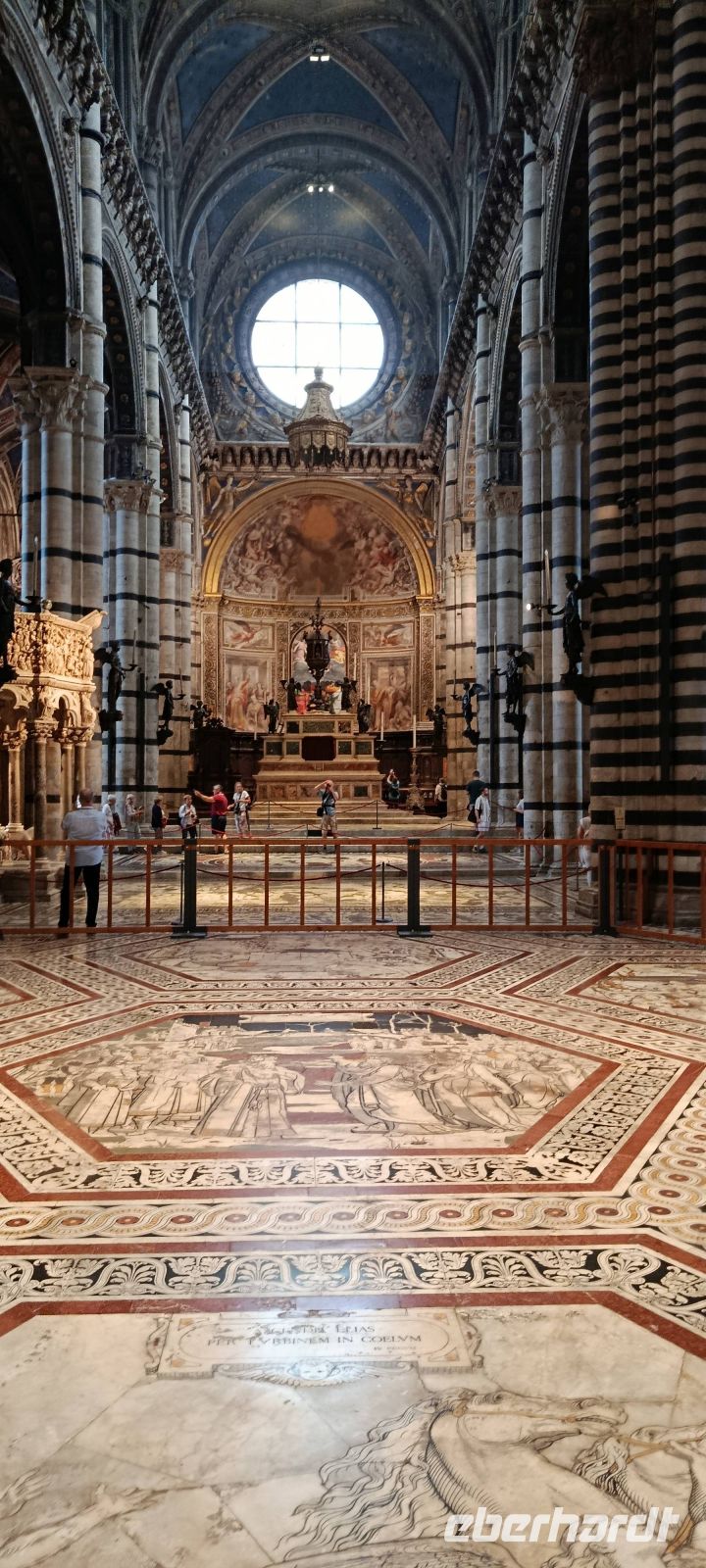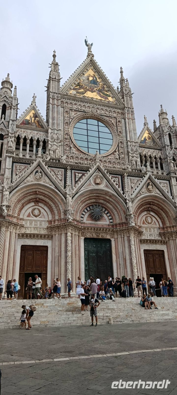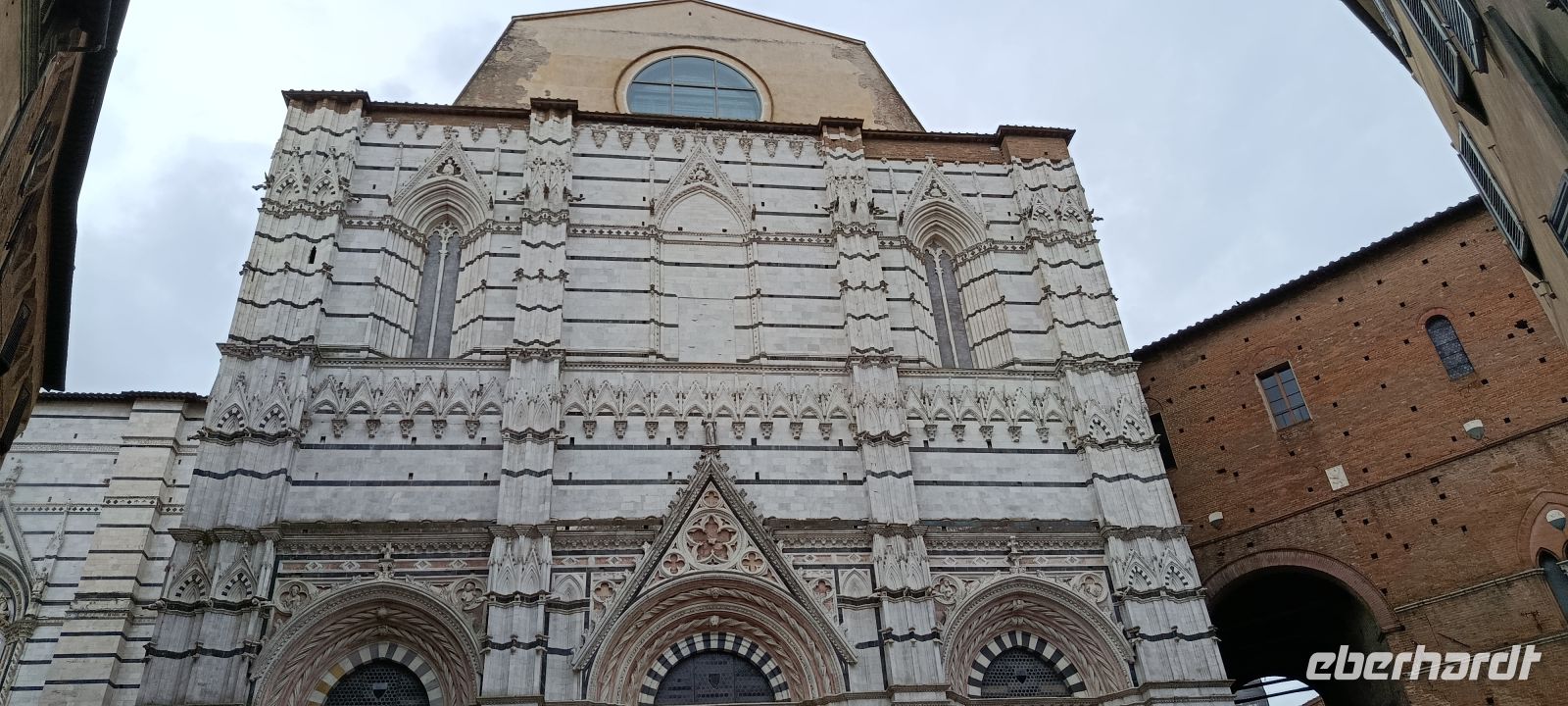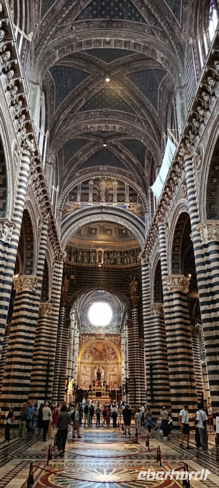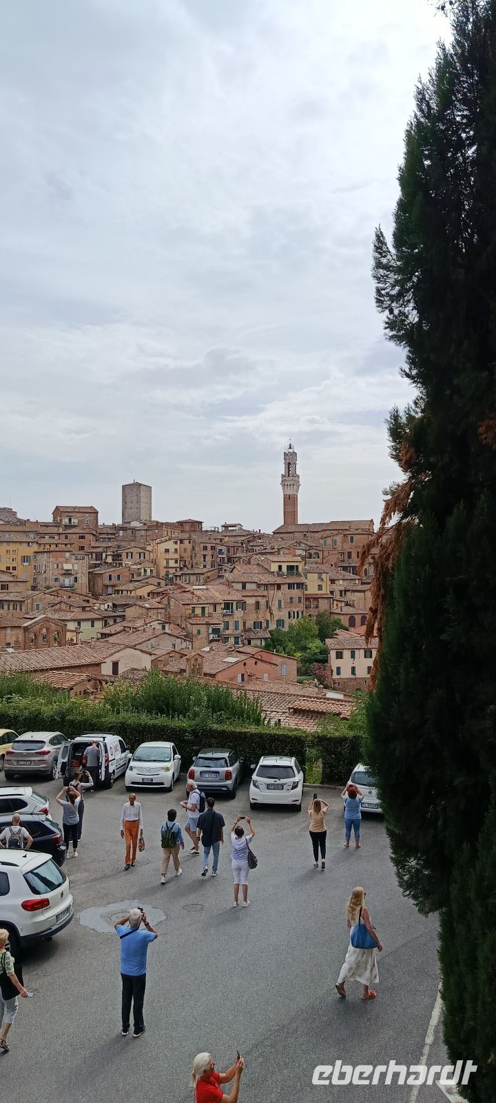 Im Nieselregen verlassen wir Montecatini. Über die Autobahn geht es Richtung Florenz und dann nach Siena. Rechts und links der Autobahn sehen wir zunächst viele Baumschulen, sie sind typisch für diese fruchtbare Ebene. Dazwischen liegen aber auch Gewerbegebiete. Nachdem wir Richtung Siena abgebogen sind, fahren wir dann durch die wunderschöne toskanische Hügellandschaft. Baustellen auf der Strecke und ein hohes Verkehrsaufkommen bremsen uns ein wenig aus - in Siena kommen wir leicht verspätet an, Luise, die uns vorgestern San Gimignano gezeigt hat, wartet schon auf uns, nur noch schnell zum Checkpoint und dann beginnt auch gleich die Stadtführung.
