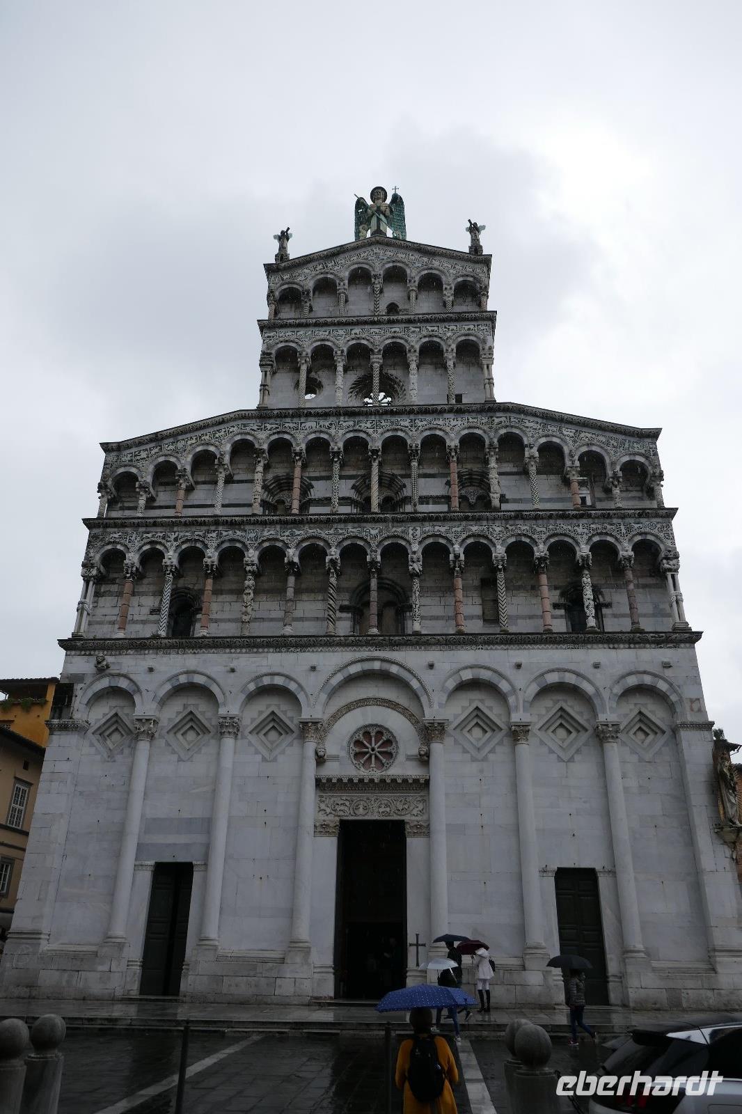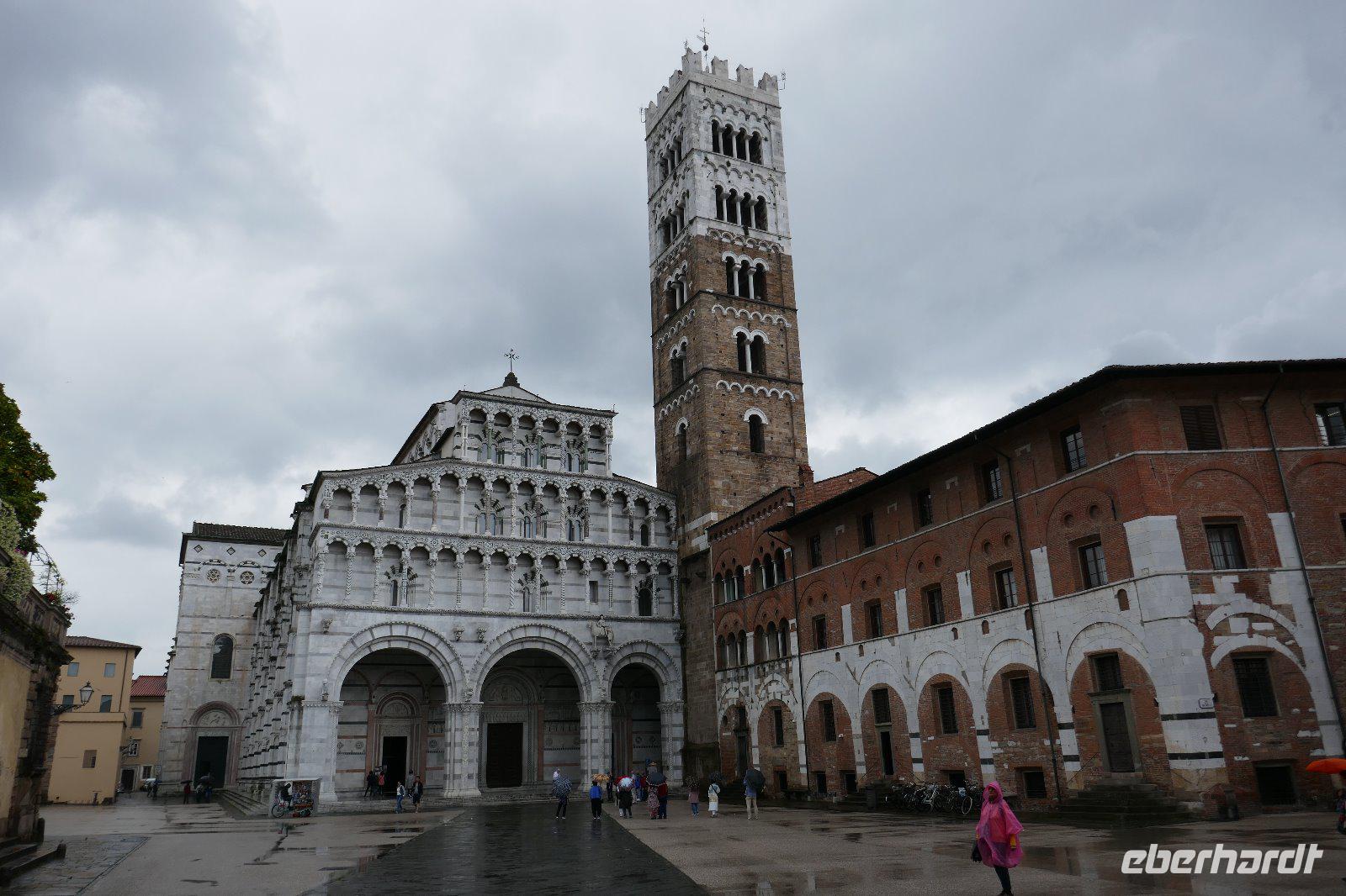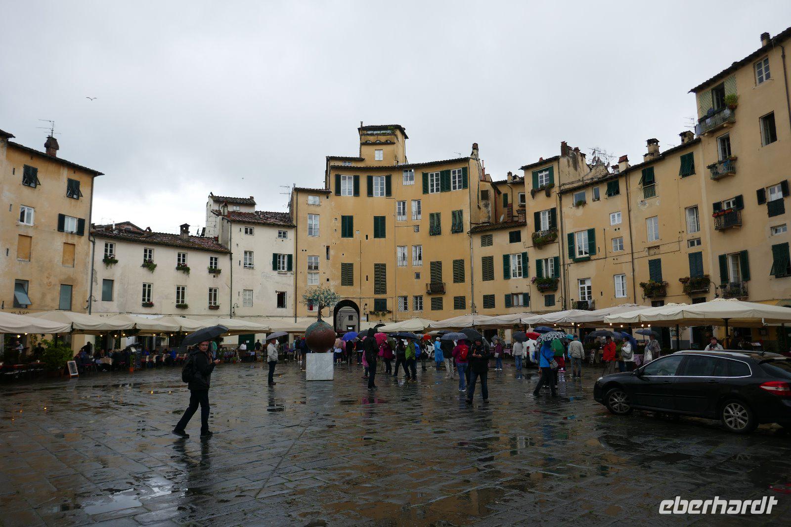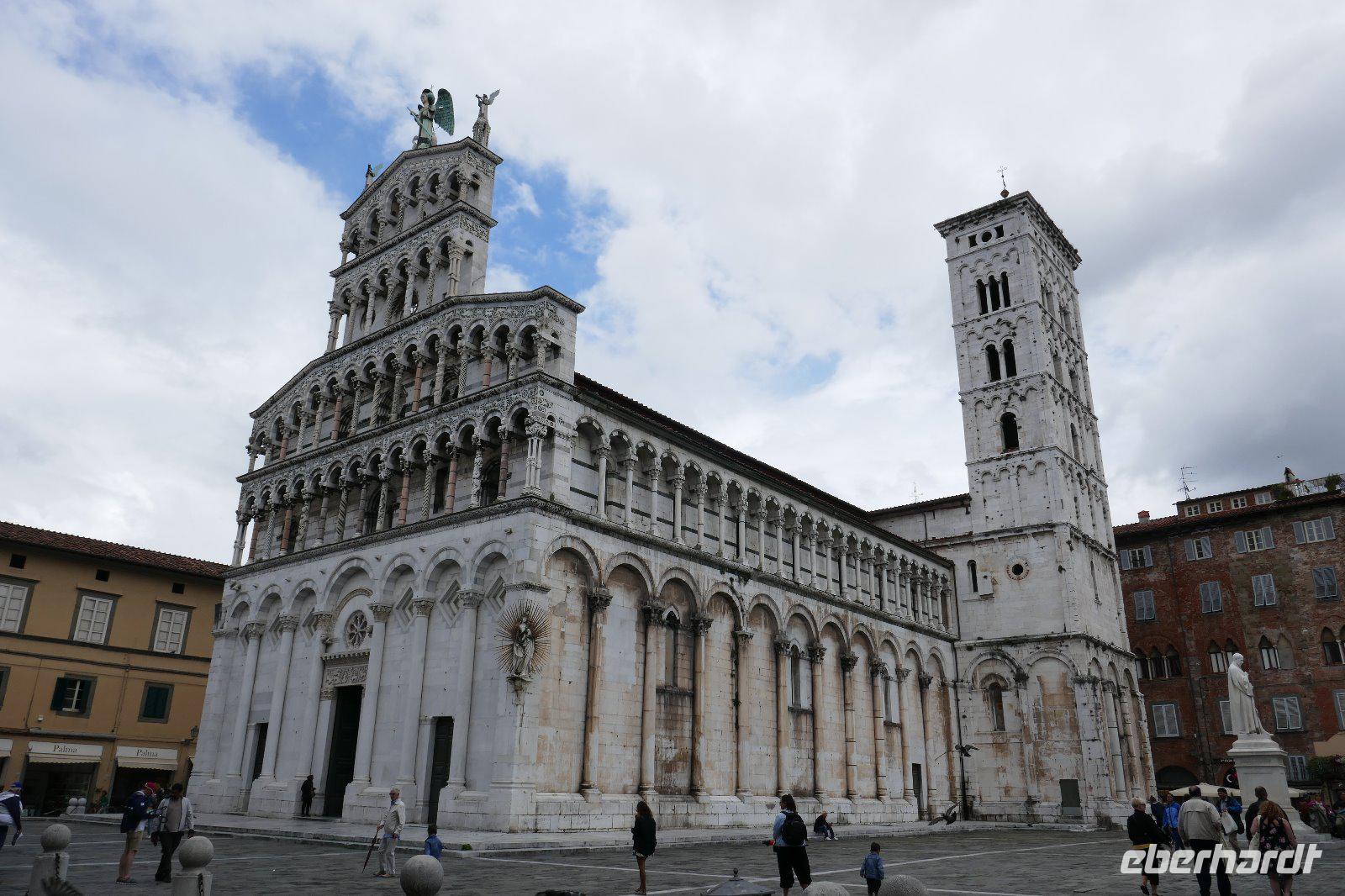 Literarisch wird sie oft auch die "Umgürtelte" genannt, da die Altstadt noch heute von einer historischen Stadtmauer umgeben ist. Lucca ist auch der Geburtsort des bekannten Komponisten Puccini. Wer kennt nicht seine Opern "La Boheme", "Madame Butterfly" oder "Tosca". Gegenüber seinem Geburtshaus sitzt er noch immer und betrachtet das Treiben in seiner Stadt mit seinen unzähligen Kirchen und Profanbauten. Mit genau 99 Kirchen und Kapellen öffnet sich eine mittelalterliche Schatztruhe, die es zu entdecken galt. So mischten wir uns nach einem mit unseren Stadtführern unters Volk und ließen uns treiben im städtischen Getümmel. Einige der Sehenswürdigkeiten wurden auch von uns angesteuert. So z. B. der Dom oder San Michele in Foro bzw. den Piazza Anfiteatro. Und wer noch eine gute Sicht über die Stadt haben wollte, nutzt den Gang auf einen der noch erhaltenen Türme.