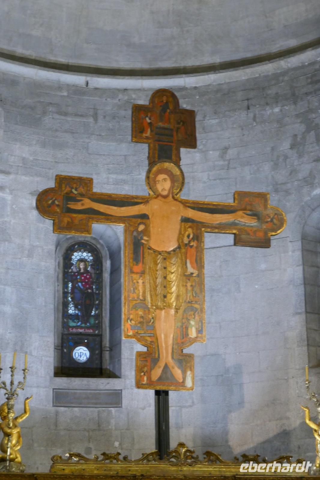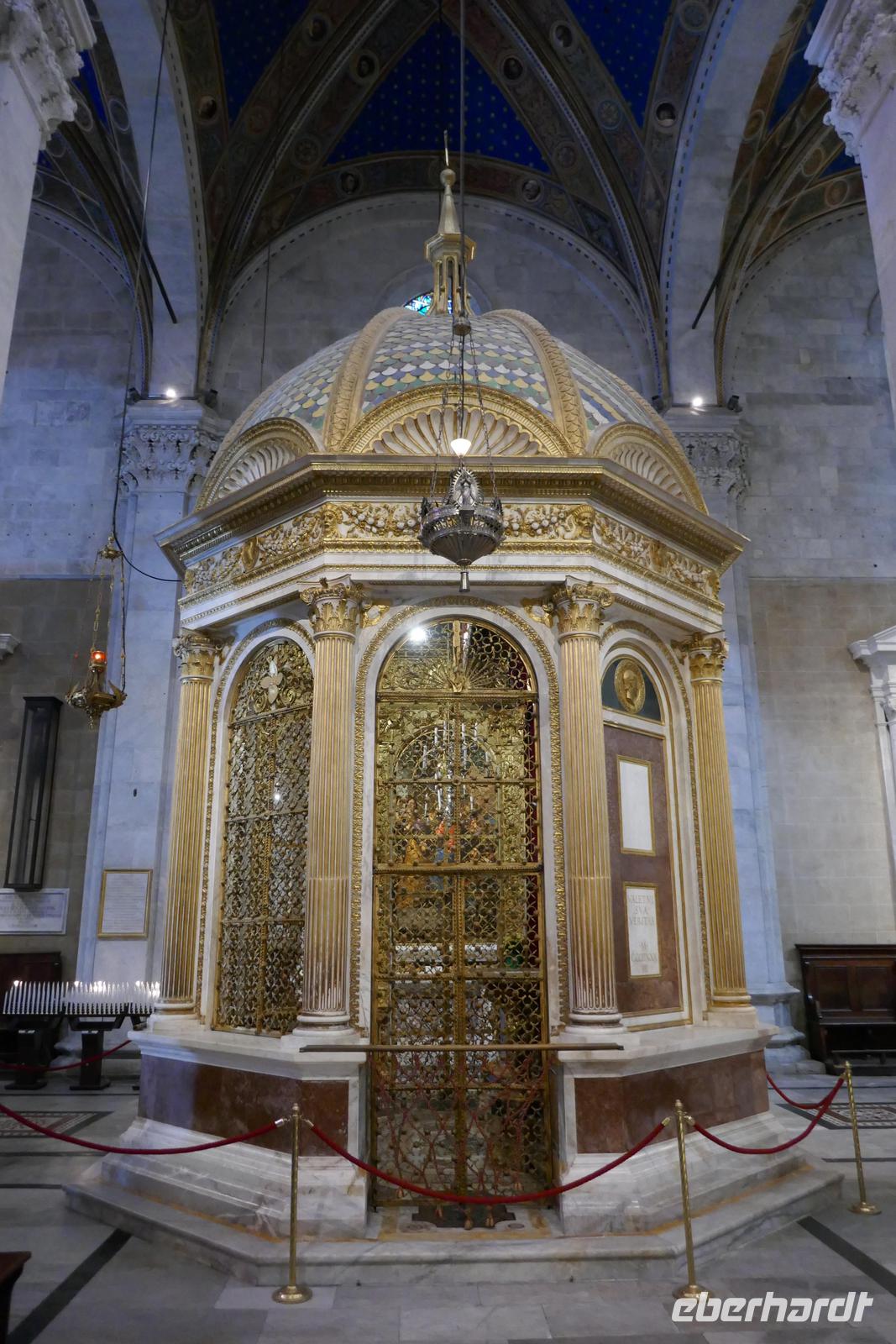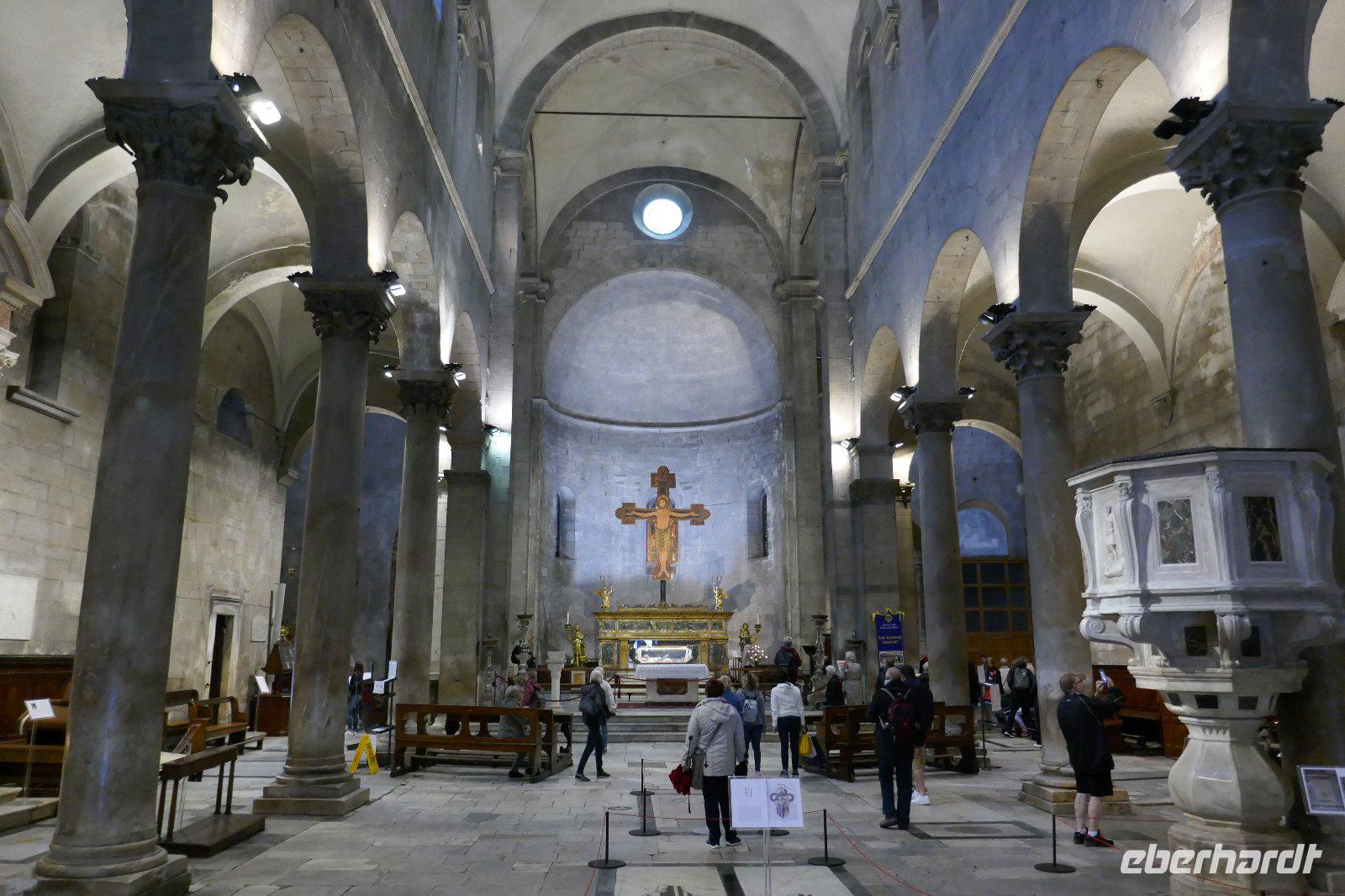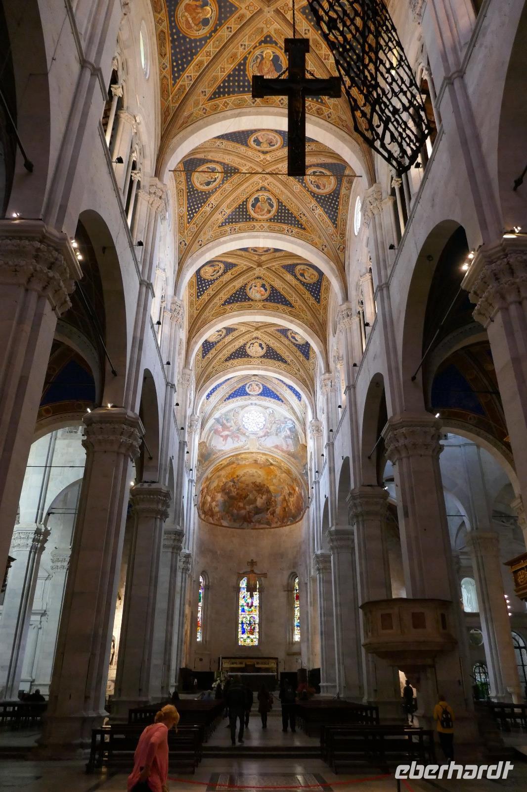 Literarisch wird sie oft auch die "Umgürtelte" genannt, da die Altstadt noch heute von einer historischen Stadtmauer umgeben ist. Lucca ist auch der Geburtsort des bekannten Komponisten Puccini. Wer kennt nicht seine Opern "La Boheme", "Madame Butterfly" oder "Tosca". Gegenüber seinem Geburtshaus sitzt er noch immer und betrachtet das Treiben in seiner Stadt mit seinen unzähligen Kirchen und Profanbauten. Mit genau 99 Kirchen und Kapellen öffnet sich eine mittelalterliche Schatztruhe, die es zu entdecken galt. So mischten wir uns nach einem mit unseren Stadtführern unters Volk und ließen uns treiben im städtischen Getümmel. Einige der Sehenswürdigkeiten wurden auch von uns angesteuert. So z. B. der Dom oder San Michele in Foro bzw. den Piazza Anfiteatro. Und wer noch eine gute Sicht über die Stadt haben wollte, nutzt den Gang auf einen der noch erhaltenen Türme.
