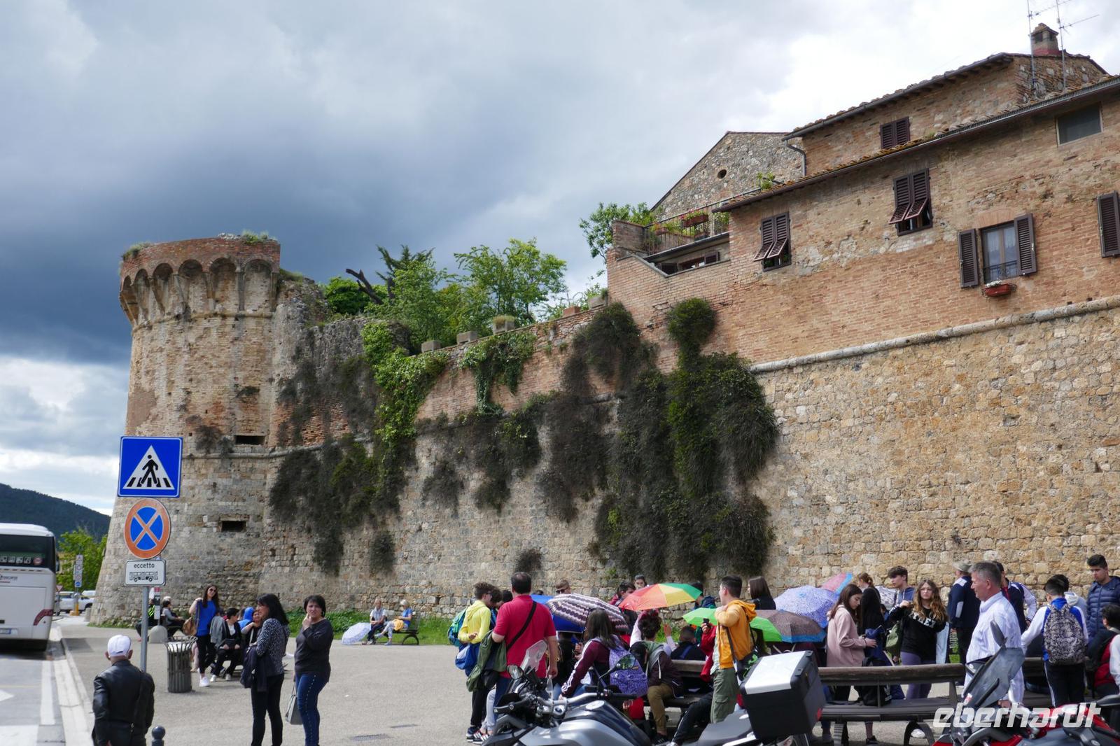 Dieser Tag führte uns in die Traumlandschaft der südlichen Toskana: mit Pinien gesäumte Wege, sanfte Hügelketten, mittelalterliche Städte und Lebensgefühl a la Dolce Vita. Erste Station war Sienna. Auch wenn die Zeit für die Stadt nicht gerade üppig war - ein Rennen wie das bekannte Pferderennen "Palio di Siena" wurde dennoch vermieden. Gemütlich schlenderten wir durch die Gassen der Altstadt von Siena, die anders als Florenz, eher gotisch geprägt ist. Ob der Piazza del Campo, der mit seinen mittelalterlichen Palästen zu einer einzigartigen Kulisse wird oder der Dom, der im gotischen Stil eine Rarität südlich der Alpen darstellt, waren einige der Punkte, die wir angesteuert haben. Am Ende brauchten nicht nur die Füße eine Erholung, auch die Augen mussten ruhen. Da kam die Fahrt nach San Gimignano gerade recht. Nicht umsonst hat San Giminagno den Beinamen "Toskanisches Manhattan". Am Nachmittag steuerten wir diese Stadt an, die schon von Weiten mit den Türmen zu erkennen war. Während der Stadtführung konnte sich jeder davon überzeugen, dass San Gimignano sich sein mittelalterliches Stadtbild bewahrt hatte. Man sagt, dass kaum eine andere Stadt der Toskana so authentisch sei. Alle hatten das Gefühl sie gingen durch ein einziges Freilichtmuseum. Am Ende, von den Eindrücken erschlagen, konnte nur noch ein Eis an der Eisdiele Dondoli am Piazza della Cisterna die Lebensgeister wieder wecken. So gestärkt und mit den Eindrücken des Tages traten wir die Rückfahrt zu den Hotels an der Versiliaküste an.