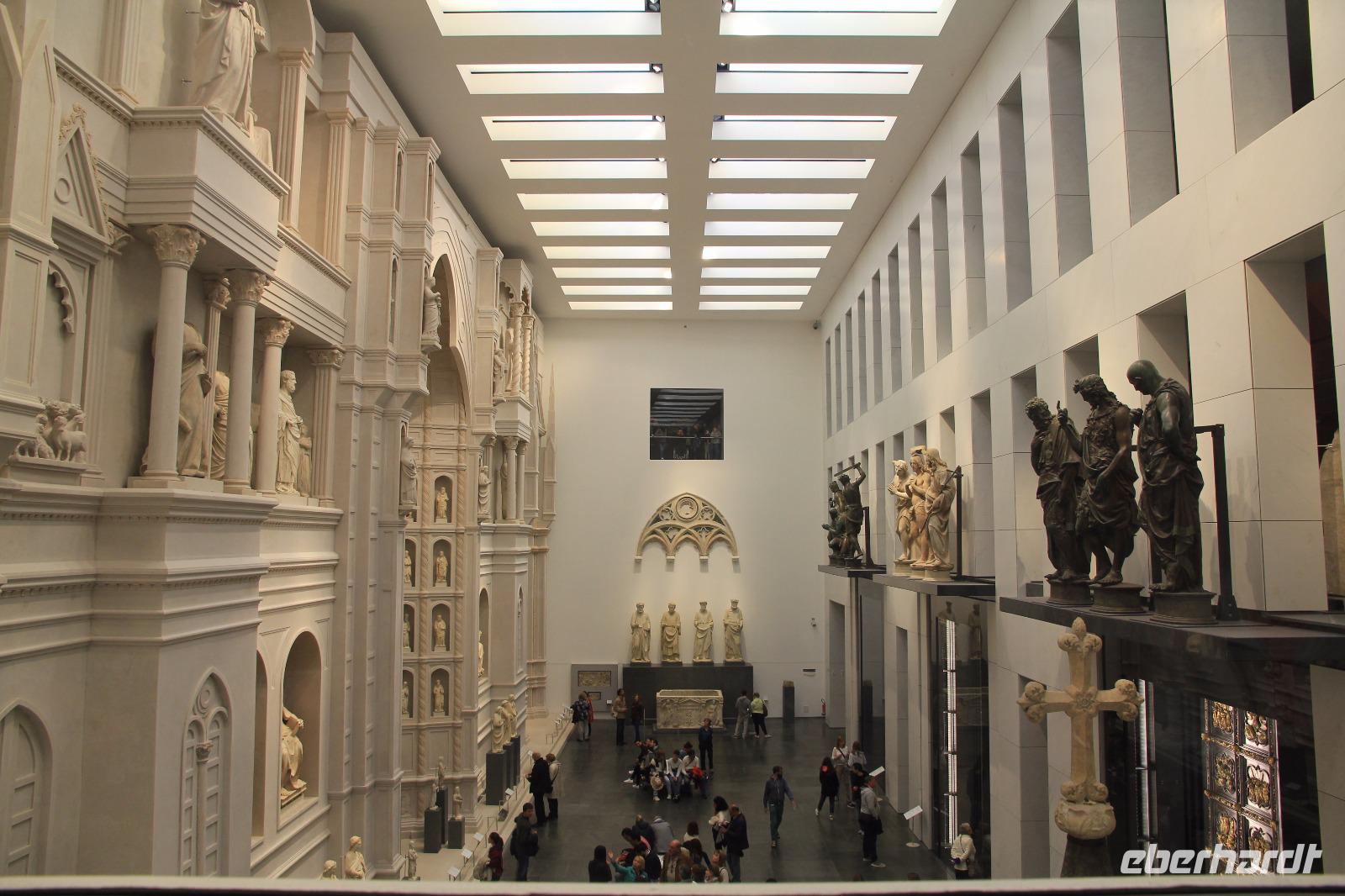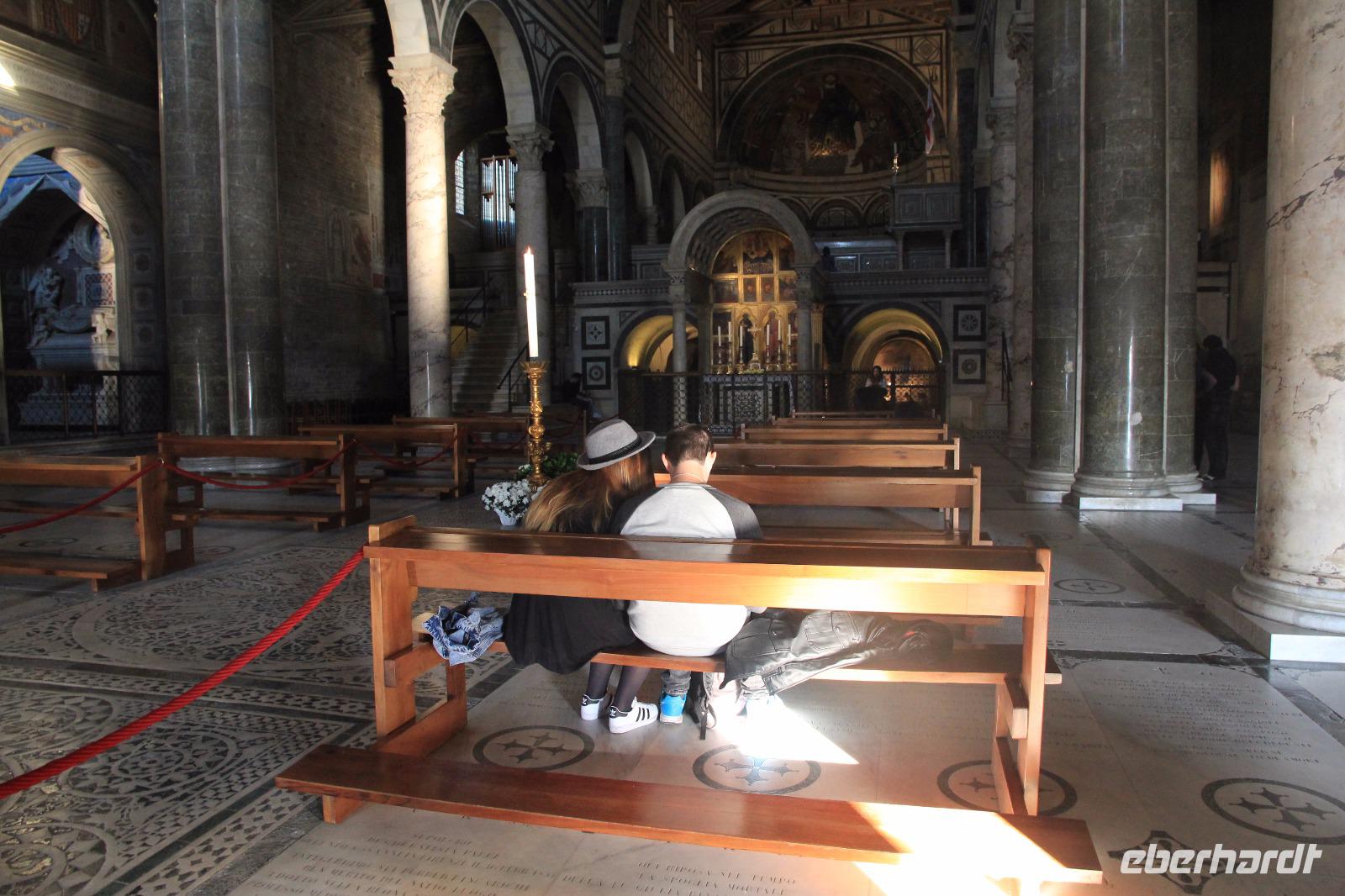Der Internationale Kampftag der Werktätigen empfängt uns in Florenz mit einem bedeckten und regnerischen Himmel. Die Taufkirche ist heute unser erstes Erlebnis. Die goldschimmernden Mosaikmalereien aus dem 13. Jahrhundert bilden die Geschichten des Alten Testaments von der Erschaffung Adam und Evas bis zu Salomon und der Königin von Saba ab. Angela erklärt uns die rituellen Funktionen und sozialen Wirkungen dieses alten religiösen Zentrums der Stadt Florenz. Bevor wir uns in die lange Schlange der Besucher des Doms (Cattedrale di S. Maria del Fiore) einreihen, besuchen wir noch den Palast der Medici (Palazzo Medici Riccardi). Im Dom überrascht uns die Schlichtheit der Innenausstattung und staunen wir über die 24-Stunden-Uhr. Leider sehen wir aufgrund der Absperrungen in der Kirche nur wenig von der Ausmalung des Kuppelgewölbes, die das Jüngste Gericht darstellt. In der Mittagspause wagen zwei unserer Mitreisenden den Aufstieg zur Kuppel des Doms, während die anderen der Kirche und Piazza Santa Croce einen Besuch abstattet und dort auch ein nettes Lokal für den Mittagsimbiss finden. Anschließend treffen wir zum Besuch des Dommuseums wieder zusammen. Dieses neue und außerordentlich sehenswerte Museum veranschaulicht die ursprüngliche Gestaltung der im 14. Bis 16. Jahrhundert noch halbfertigen Fassade des Domes, beherbergt die echte Paradiestür und andere Originale der Ausstattung des Baptisteriums und informiert über Brunelesschis Planung und Bauweise der Domkuppel. Weitere eindrucksvolle Höhepunkte sind die Büßende Magdalena von Donatello und die Pieta Bandini von Michelangelo. Den ausgefüllten Tag beschließen wir mit einem gemeinsamen Abendessen (lecker Bistecca fiorentina) im Restaurant Nella in der Nähe unseres Hotels.