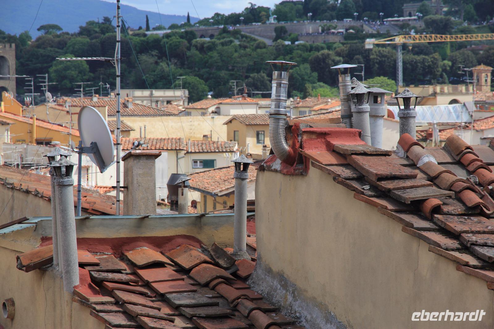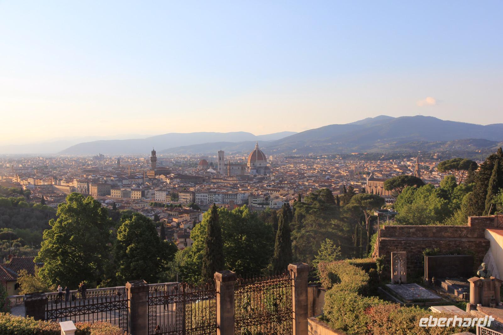 Schon am frühen Nachmittag landen wir mit unseren Fliegern im stadtnahen Airport von Florenz und gelangen wir in wenigen Minuten in die Altstadt. Im Hotel Tornabuoni Beacchi , in dem viele Gegenstände an eine hundert Jahre alte Hoteltradition erinnern, beziehen wir schnell unsere Zimmer und treffen wir uns auf der Hotelterrasse zu einem Prosecco und Mittagsimbiss. Die Sonne, der tolle Blick über die Stadt, das gute Essen und die angenehme Reisegesellschaft lässt uns länger verweilen als geplant. Unsere Florentiner Reiseleiterin Angela führt uns dann über die Ponte S. Trinita zur Piazza S. Spirito und dann zum Palazzo Pitti. Im Giardino di Boboli ersteigen wir die Anhöhe zum Neptunbrunnen und weiter hoch zur Statue des Überflusses, deren Plattform uns mit einen schönen Ausblick auf Florenz belohnt. Am Forte Belvedere führt uns der Weg vorbei und dann wieder ins Tal des Arno. An der Porta San Miniato fahren zwei Gäste mit dem Reisebegleiter Dr. Uwe Lorenz per Taxi zur Piazzale Michelangelo, während die anderen mit Angela den Treppenaufstieg nehmen und dabei den Rosengarten durchqueren können. Wir besichtigen die fast tausend Jahre alte Kirche San Miniato al Monte und genießen dabei den Gesang der psalmodieren Olivetanermönche. Von der Terasse des Klosters bewundern wir den Sonnenuntergang über dem Boboli-Hügel und verharren wir vor der Kulisse der Stadt, die sich vor unseren Füßen ausbreitet. Langsam steigen wir wieder hinab, um im lebendigen Restaurant I Bastioni di San Niccolo florentinische Coccoli, Pasta und Pizza zu Abend zu essen. Am späten Abend gelangen wir über die Ponte Vecchio wieder auf die andere Flussseite zum Hotel.